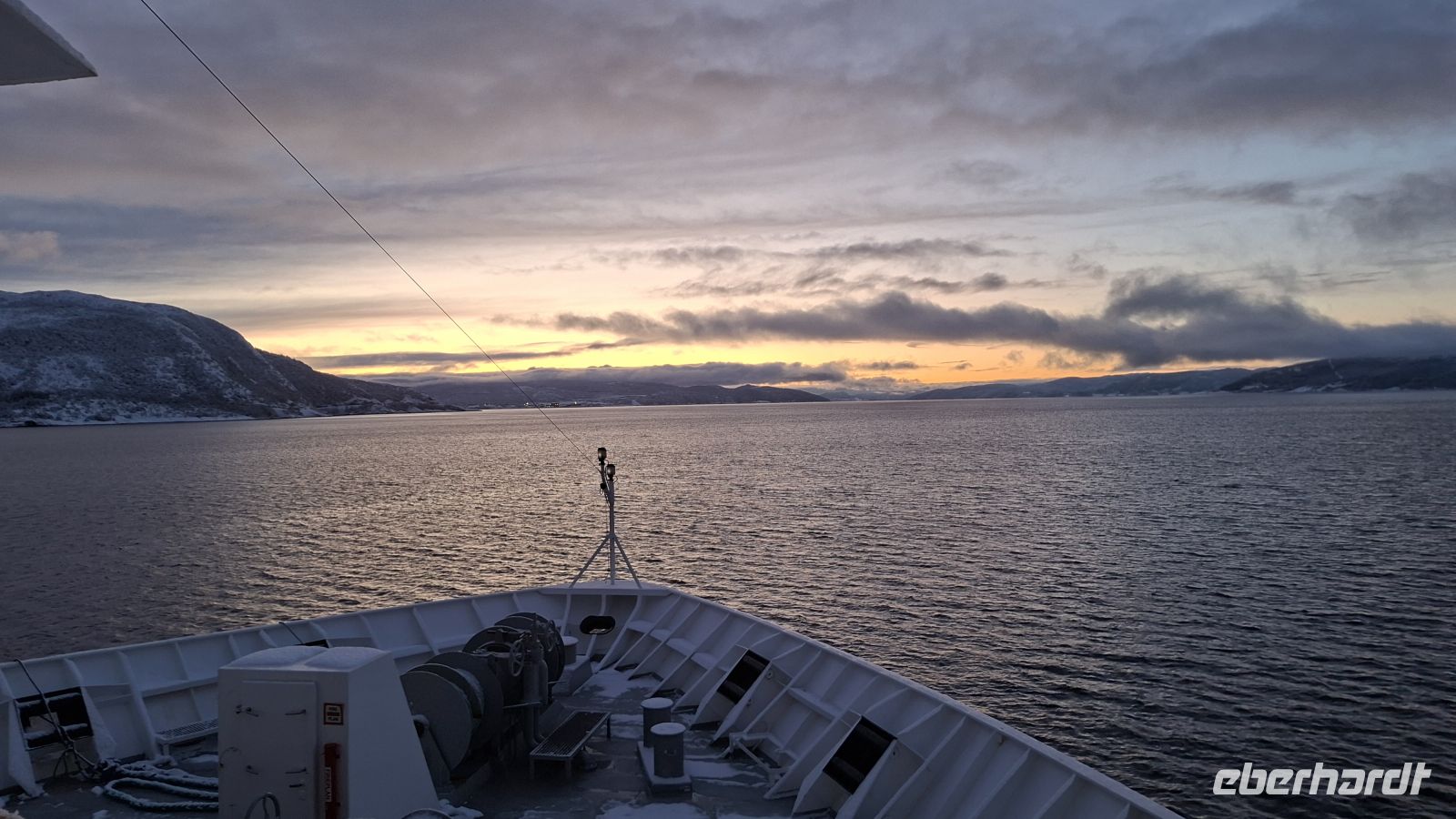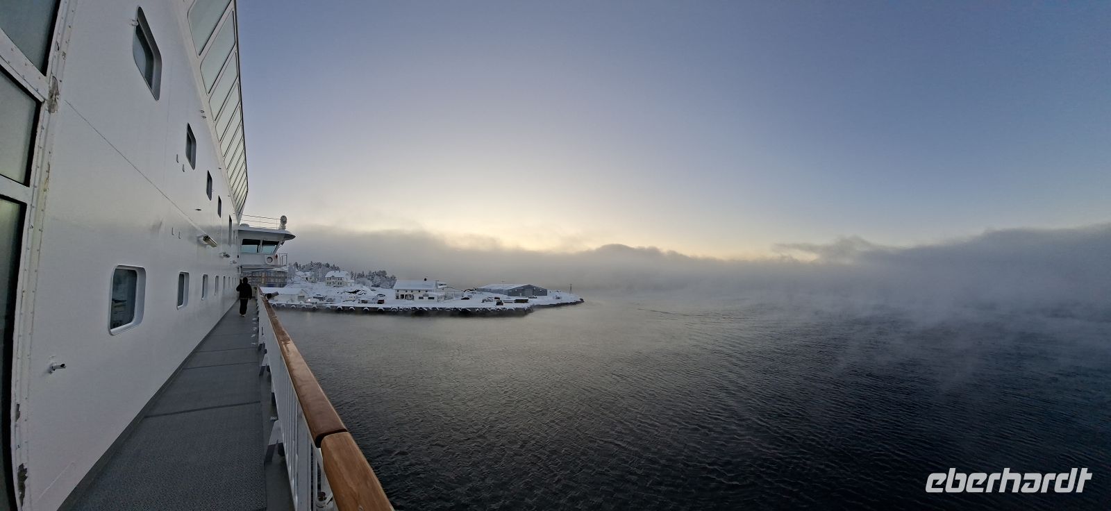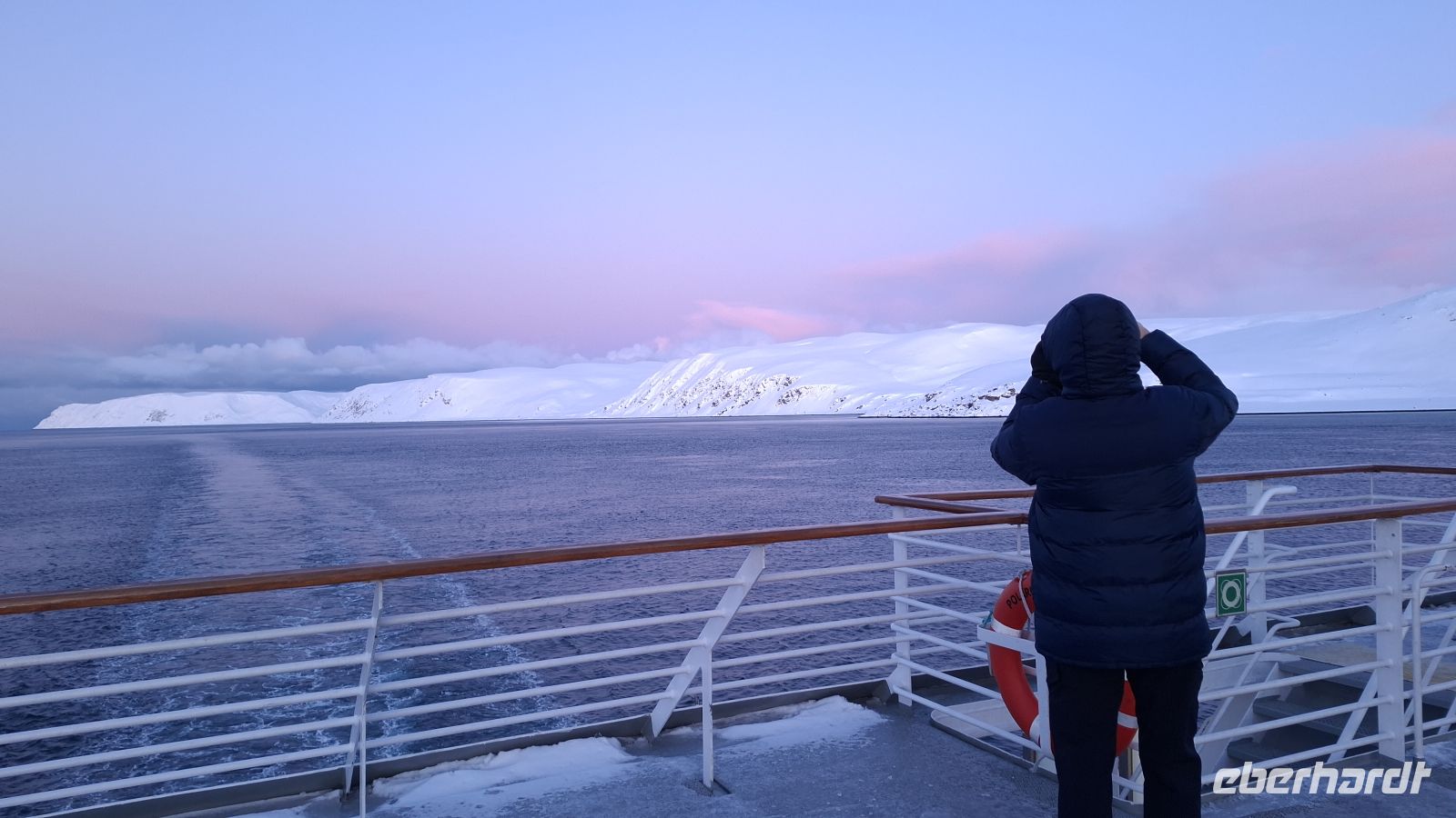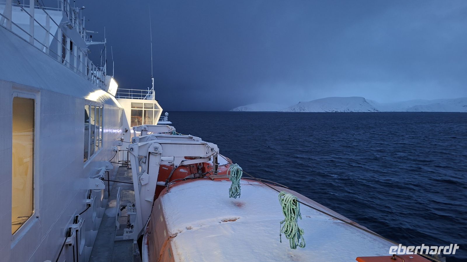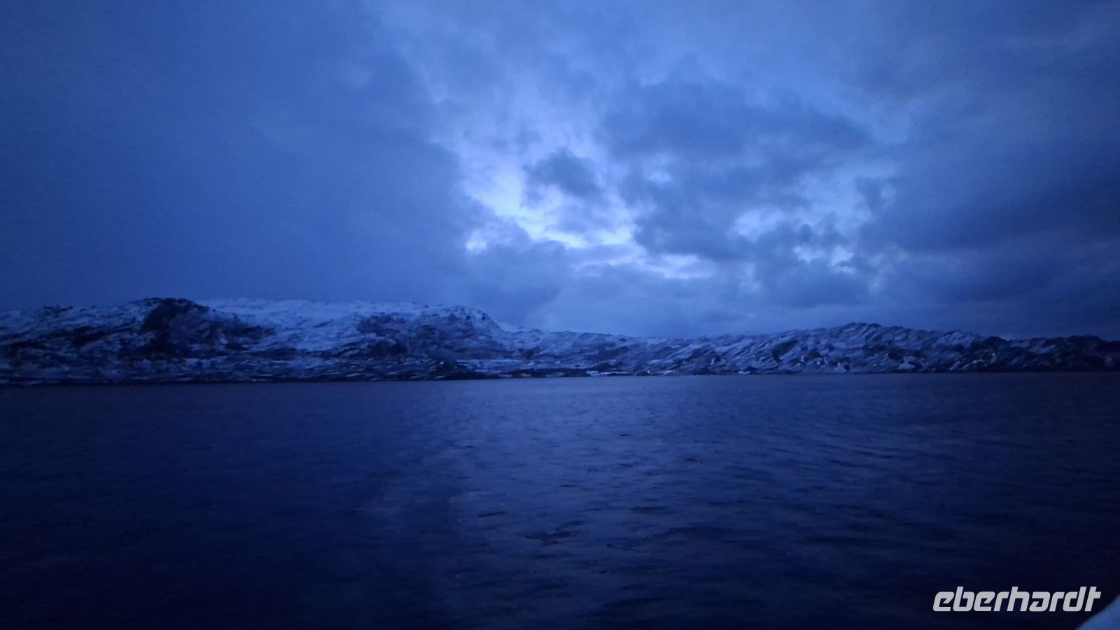 Es wurde heute einfach nicht hell. Vom frühen Morgen an lag eine besondere Stimmung über allem – die Landschaft und das Wetter hatten eine gewisse Dramatik. Dunkelgrauer Himmel, Schnee, Nebel und das fahle Licht der Polarnacht ließen Meer und Küste fast geheimnisvoll wirken. Wir saßen an Bord, schauten hinaus und hatten das Gefühl, in einem schwarz-weißen Film mitspielen zu dürfen, in dem ab und zu ein paar Lichter Farbtupfer setzten.