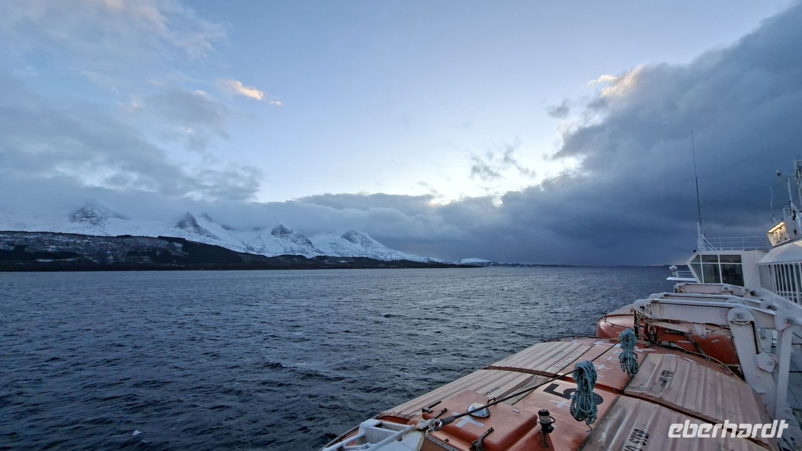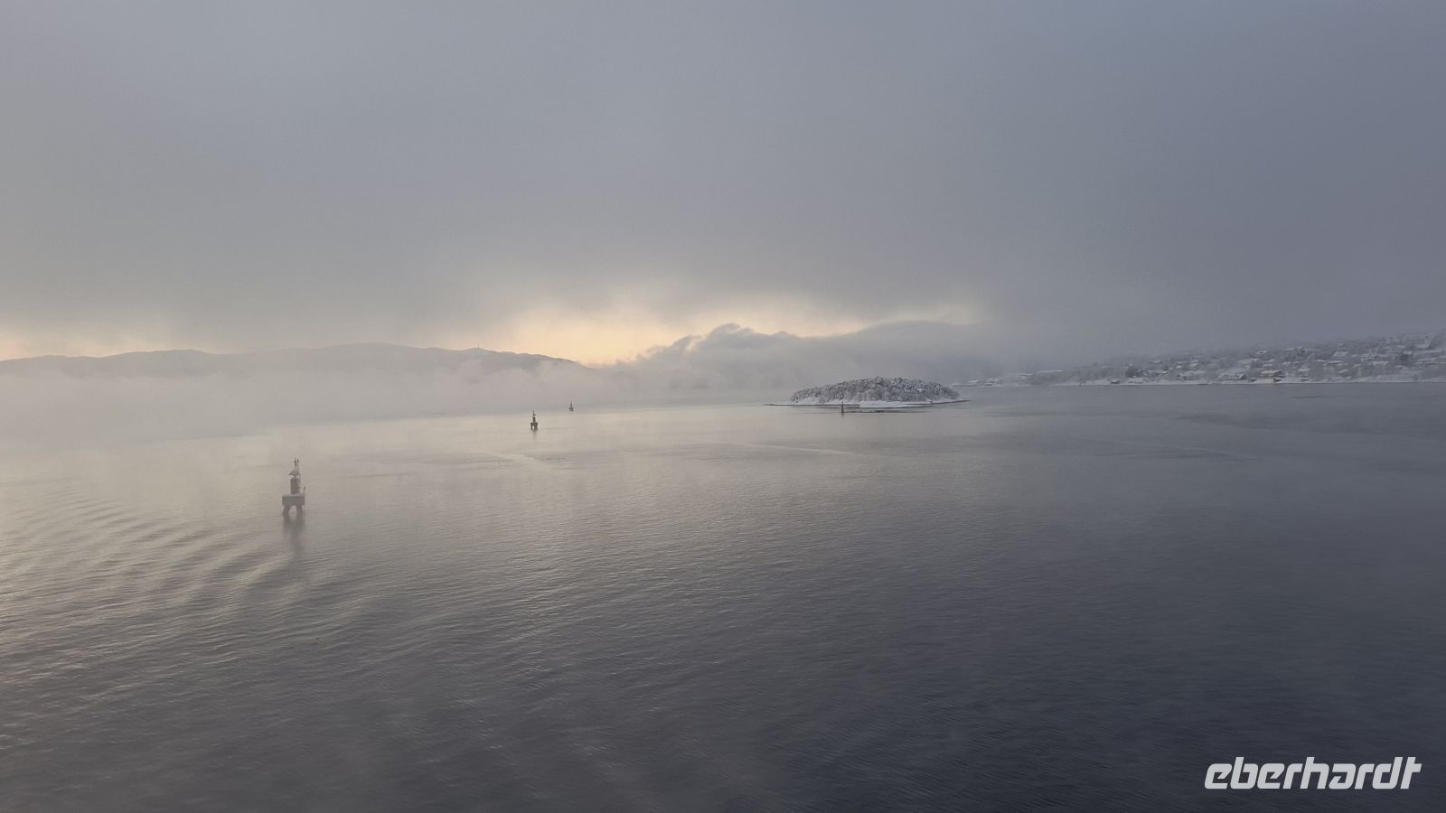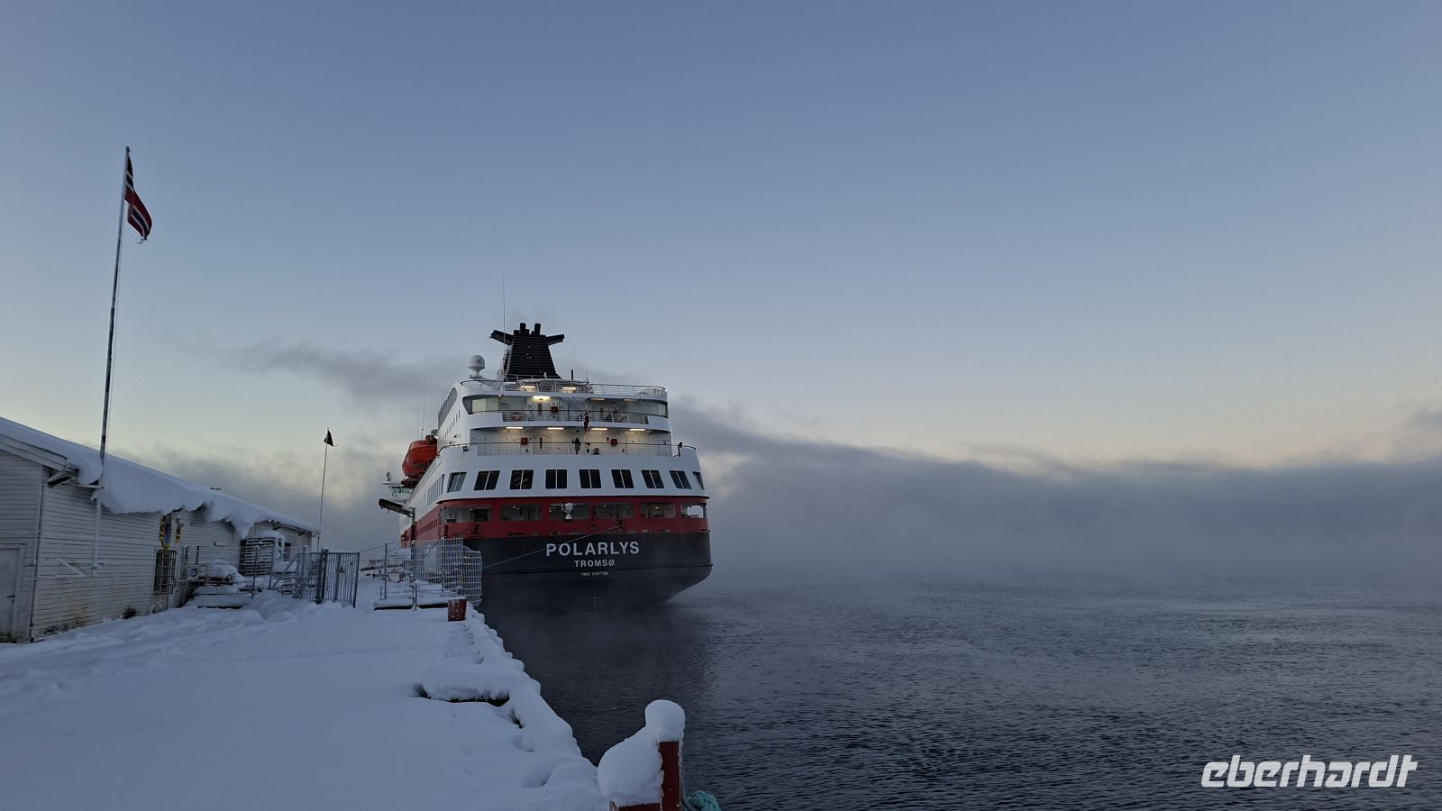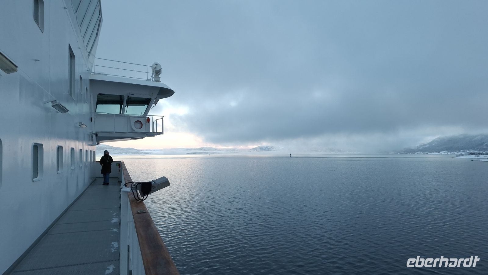Es wurde heute einfach nicht hell. Vom frühen Morgen an lag eine besondere Stimmung über allem – die Landschaft und das Wetter hatten eine gewisse Dramatik. Dunkelgrauer Himmel, Schnee, Nebel und das fahle Licht der Polarnacht ließen Meer und Küste fast geheimnisvoll wirken. Wir saßen an Bord, schauten hinaus und hatten das Gefühl, in einem schwarz-weißen Film mitspielen zu dürfen, in dem ab und zu ein paar Lichter Farbtupfer setzten.