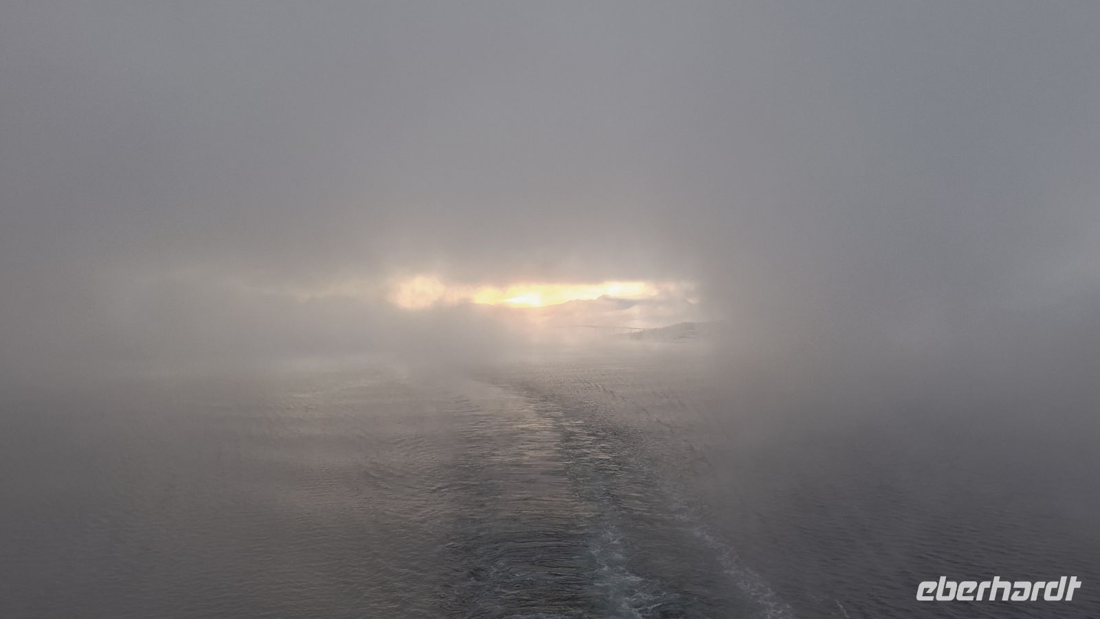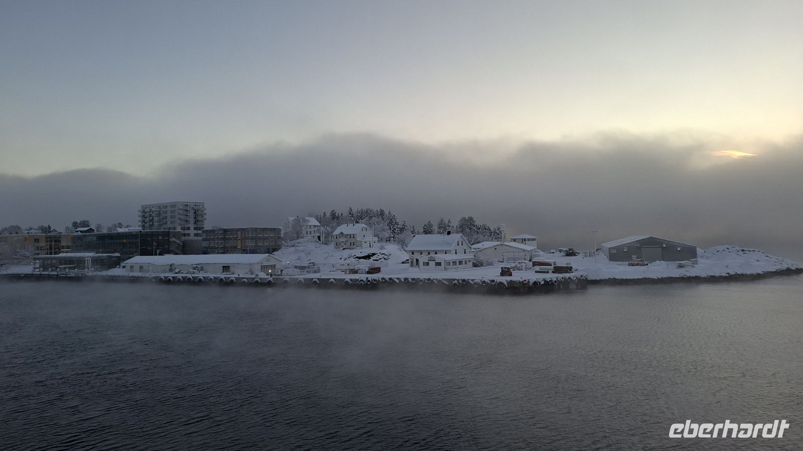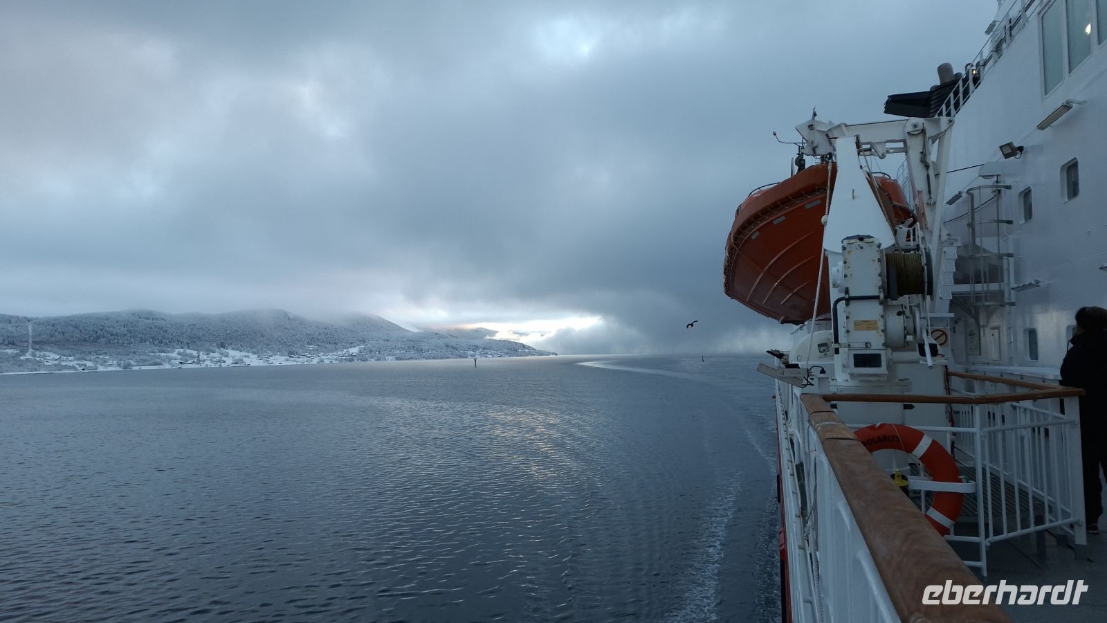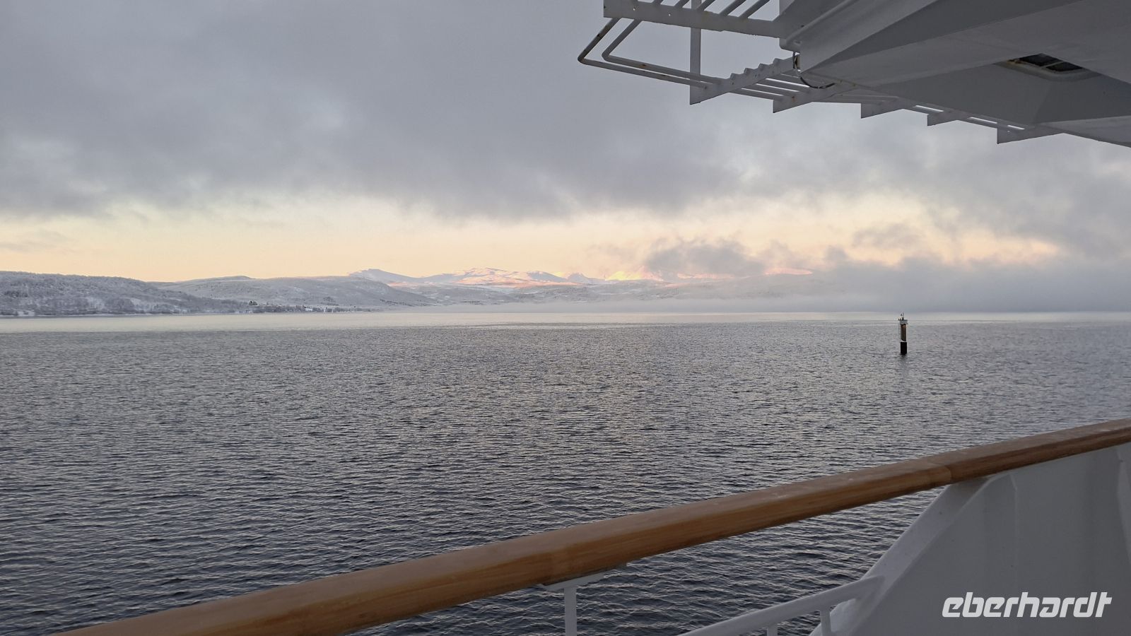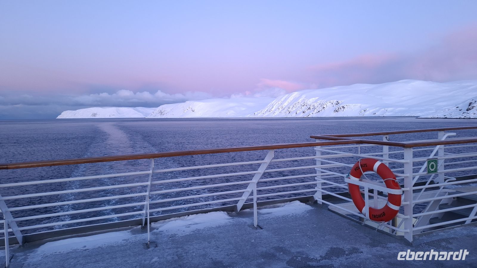 Es wurde heute einfach nicht hell. Vom frühen Morgen an lag eine besondere Stimmung über allem – die Landschaft und das Wetter hatten eine gewisse Dramatik. Dunkelgrauer Himmel, Schnee, Nebel und das fahle Licht der Polarnacht ließen Meer und Küste fast geheimnisvoll wirken. Wir saßen an Bord, schauten hinaus und hatten das Gefühl, in einem schwarz-weißen Film mitspielen zu dürfen, in dem ab und zu ein paar Lichter Farbtupfer setzten.