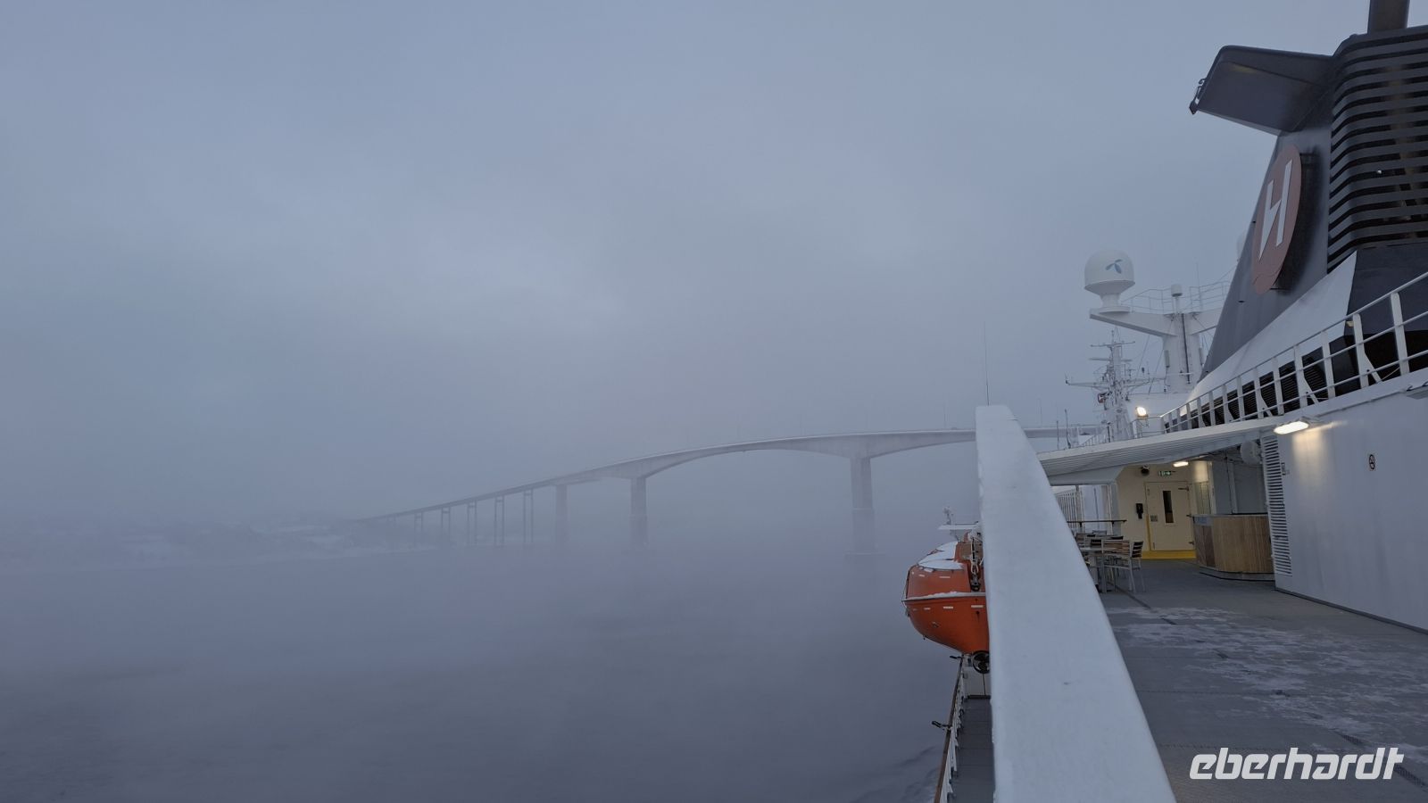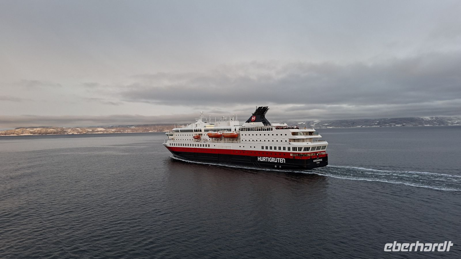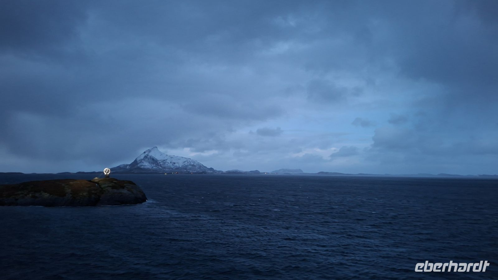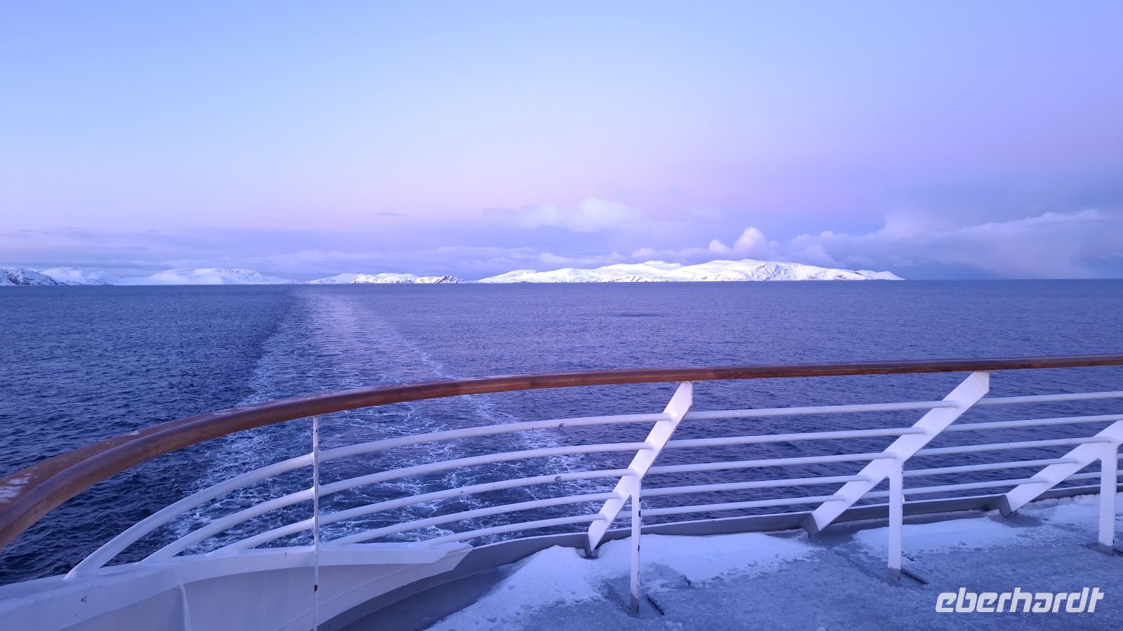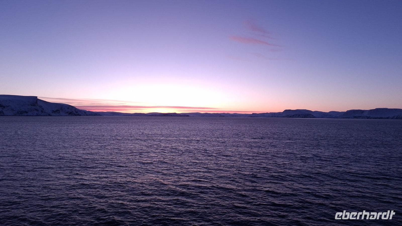 Es wurde heute einfach nicht hell. Vom frühen Morgen an lag eine besondere Stimmung über allem – die Landschaft und das Wetter hatten eine gewisse Dramatik. Dunkelgrauer Himmel, Schnee, Nebel und das fahle Licht der Polarnacht ließen Meer und Küste fast geheimnisvoll wirken. Wir saßen an Bord, schauten hinaus und hatten das Gefühl, in einem schwarz-weißen Film mitspielen zu dürfen, in dem ab und zu ein paar Lichter Farbtupfer setzten.