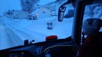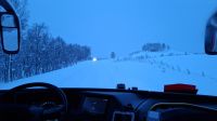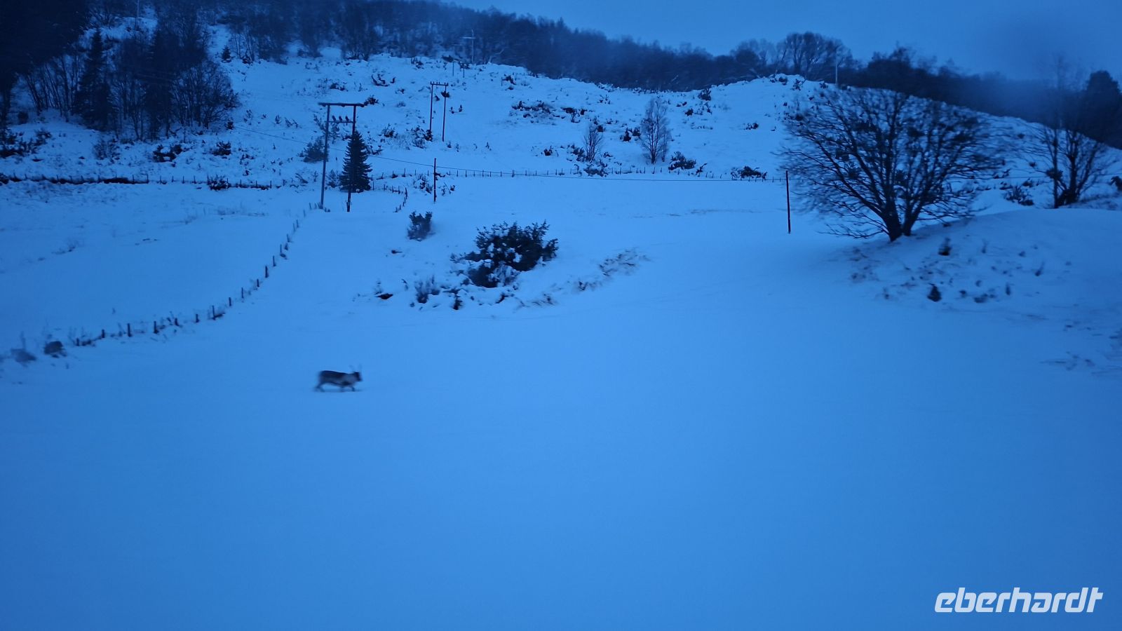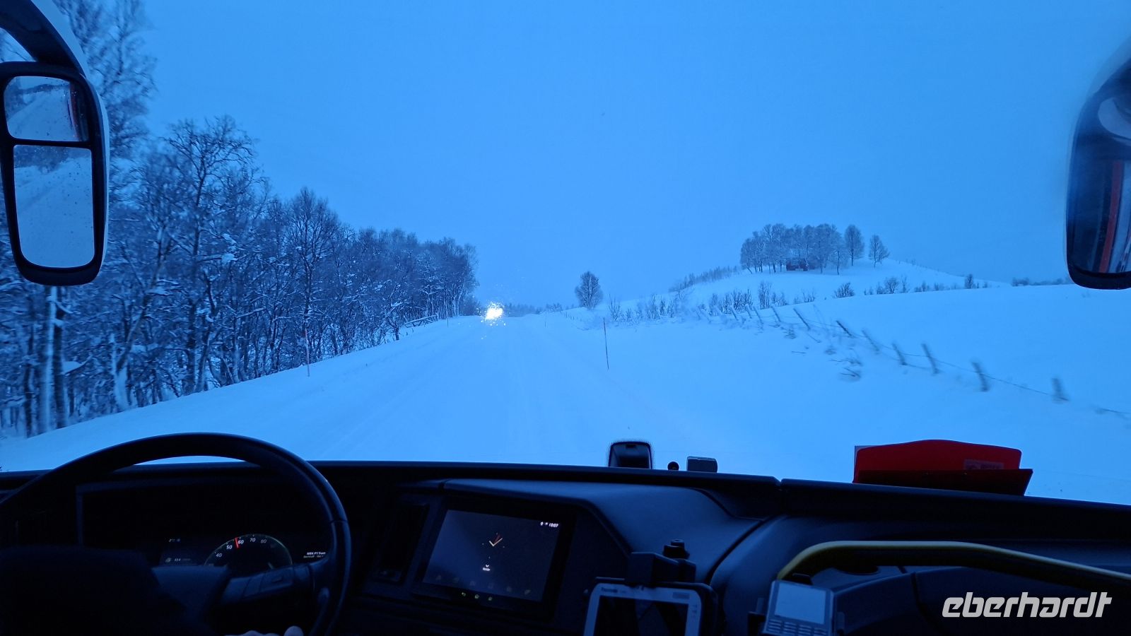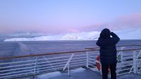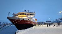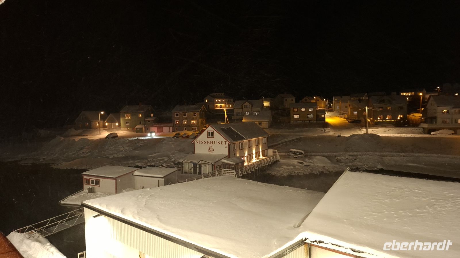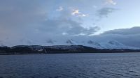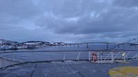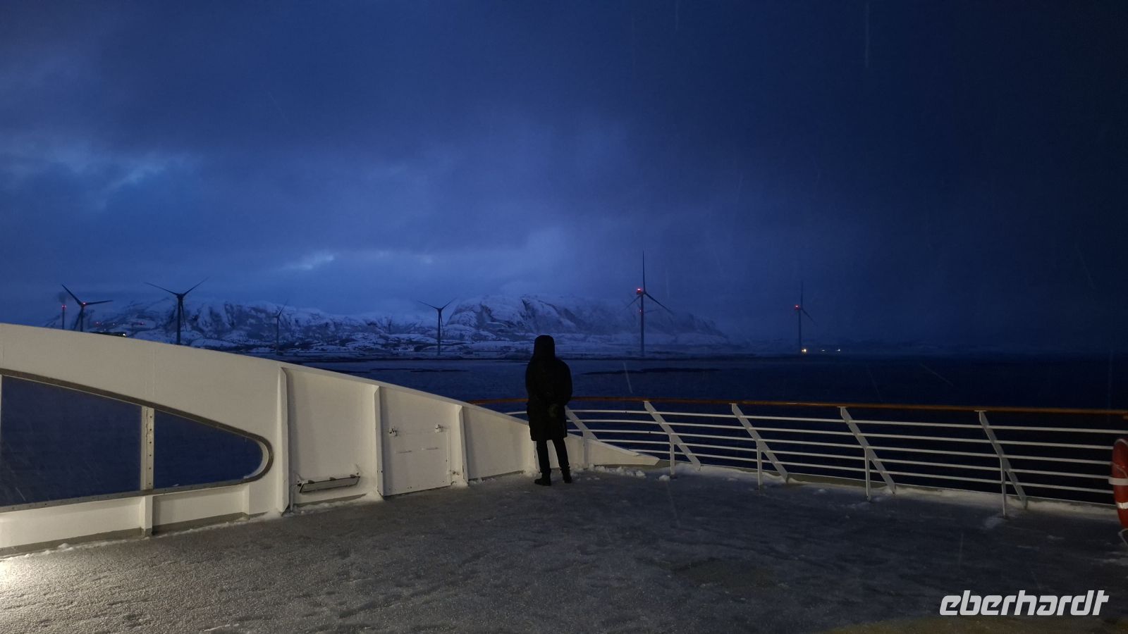 Es wurde heute einfach nicht hell. Vom frühen Morgen an lag eine besondere Stimmung über allem – die Landschaft und das Wetter hatten eine gewisse Dramatik. Dunkelgrauer Himmel, Schnee, Nebel und das fahle Licht der Polarnacht ließen Meer und Küste fast geheimnisvoll wirken. Wir saßen an Bord, schauten hinaus und hatten das Gefühl, in einem schwarz-weißen Film mitspielen zu dürfen, in dem ab und zu ein paar Lichter Farbtupfer setzten.
