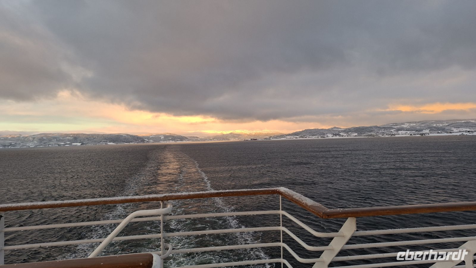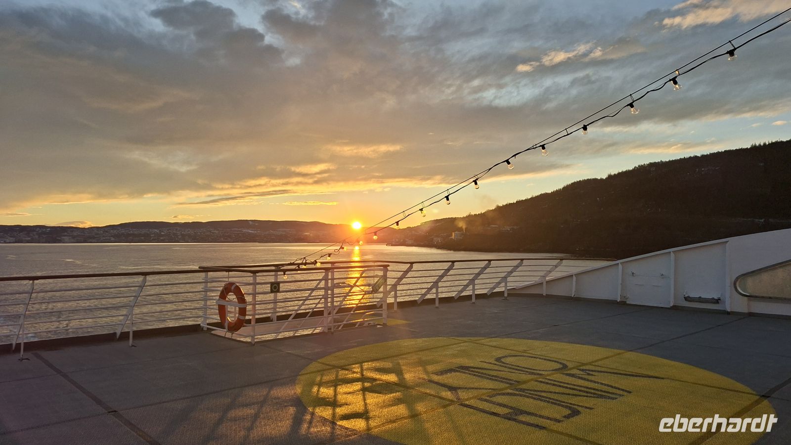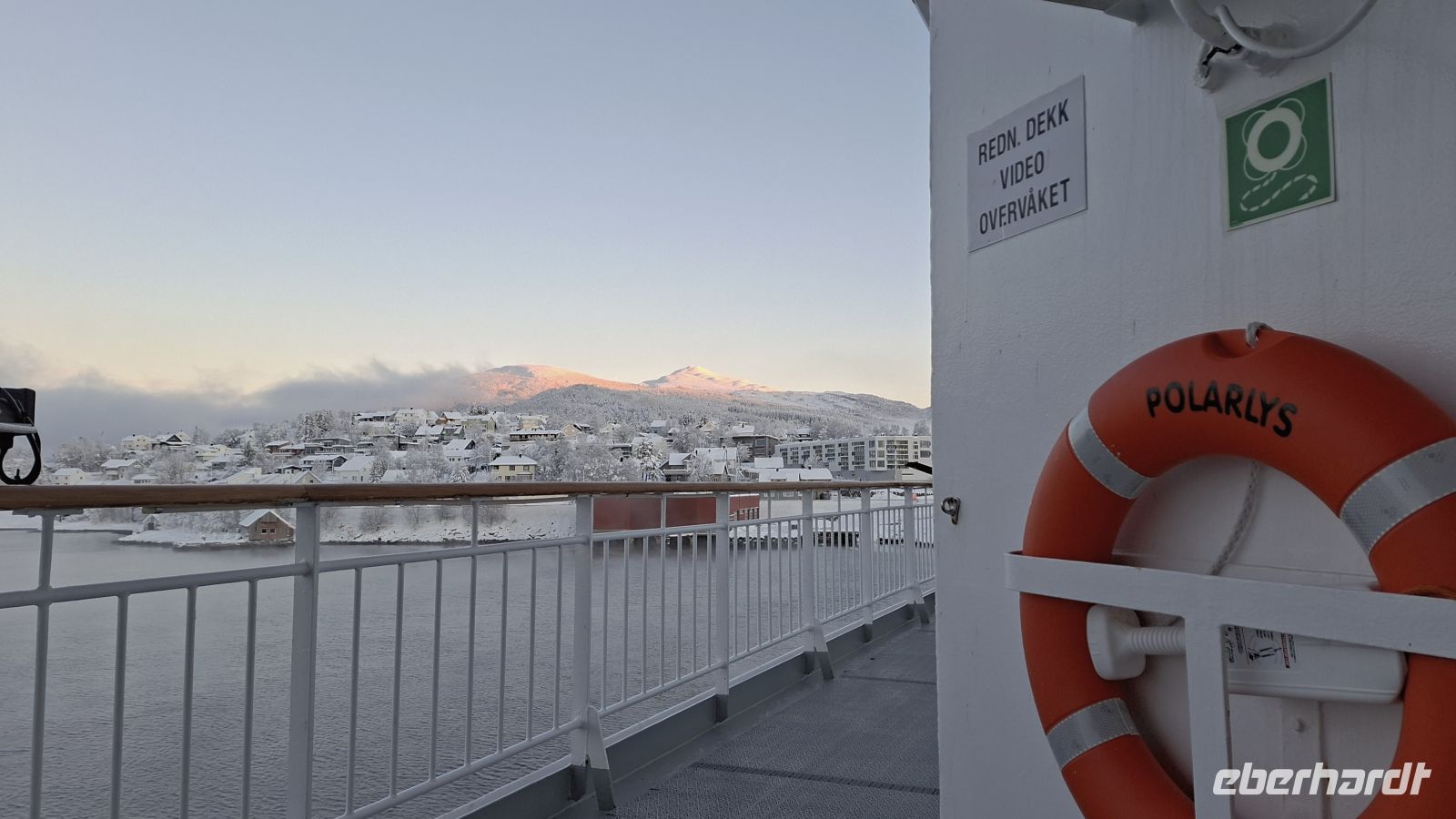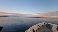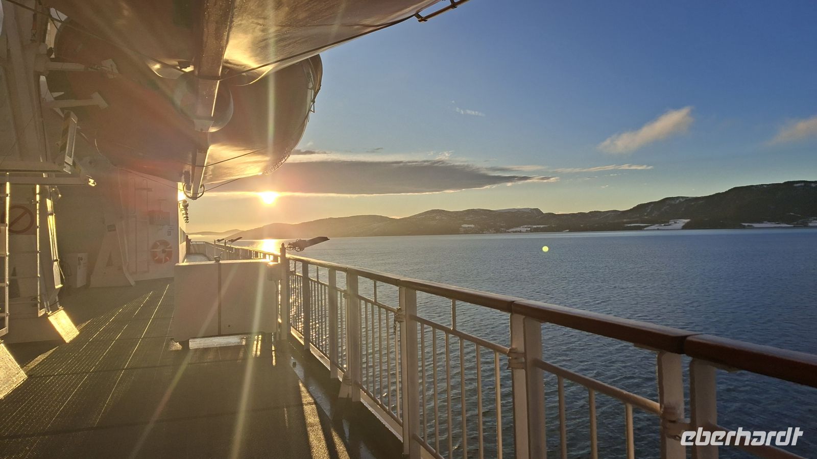 Am letzten Tag an Bord der MS Polarlys lag schon am Morgen ein bisschen Abschiedsstimmung in der Luft. Früh machten wir Halt in Trondheim, und während wir aus dem Hafen hinausfuhren, begegneten wir der MS Nordlys. Wie alte Bekannte winkten wir uns gegenseitig zu. Und dann passierte es: Wir sahen das erste Mal seit Tagen wieder die Sonne. Sie stand zwar niedrig, aber ihr Licht brach durch die Wolken – und plötzlich wirkte alles ein kleines bisschen freundlicher und wärmer.