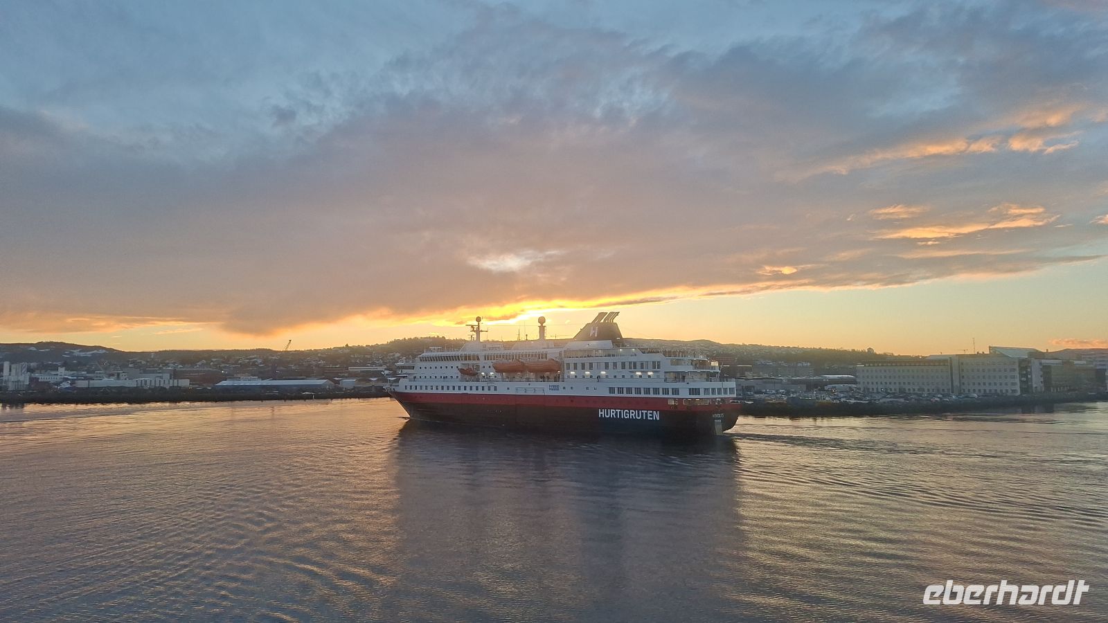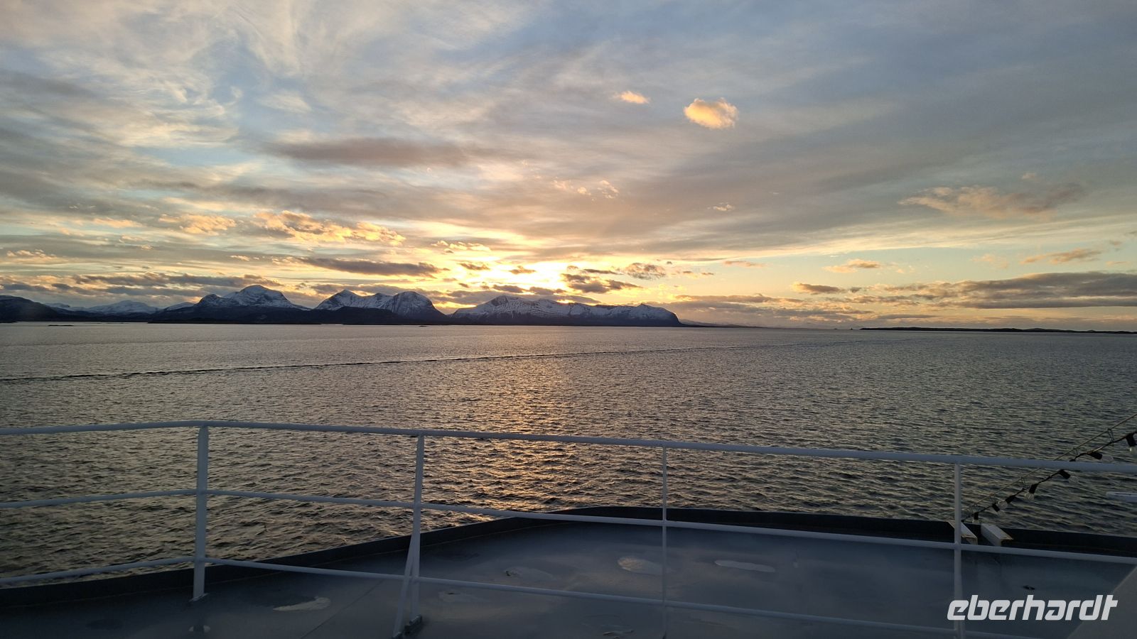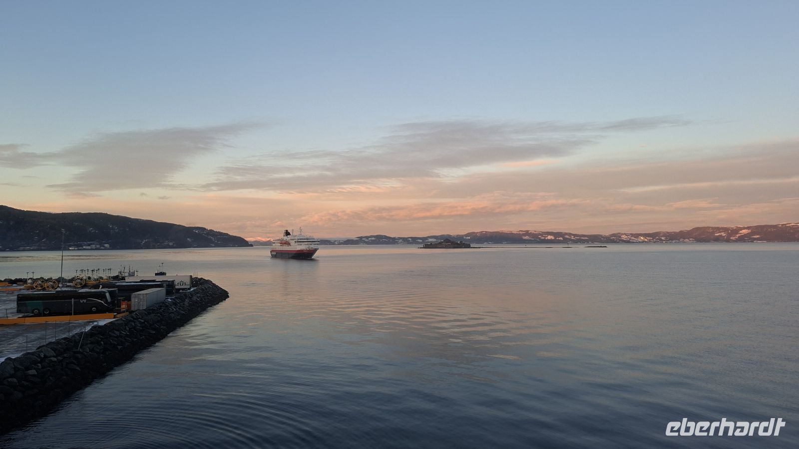 Am letzten Tag an Bord der MS Polarlys lag schon am Morgen ein bisschen Abschiedsstimmung in der Luft. Früh machten wir Halt in Trondheim, und während wir aus dem Hafen hinausfuhren, begegneten wir der MS Nordlys. Wie alte Bekannte winkten wir uns gegenseitig zu. Und dann passierte es: Wir sahen das erste Mal seit Tagen wieder die Sonne. Sie stand zwar niedrig, aber ihr Licht brach durch die Wolken – und plötzlich wirkte alles ein kleines bisschen freundlicher und wärmer.