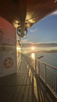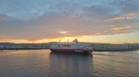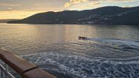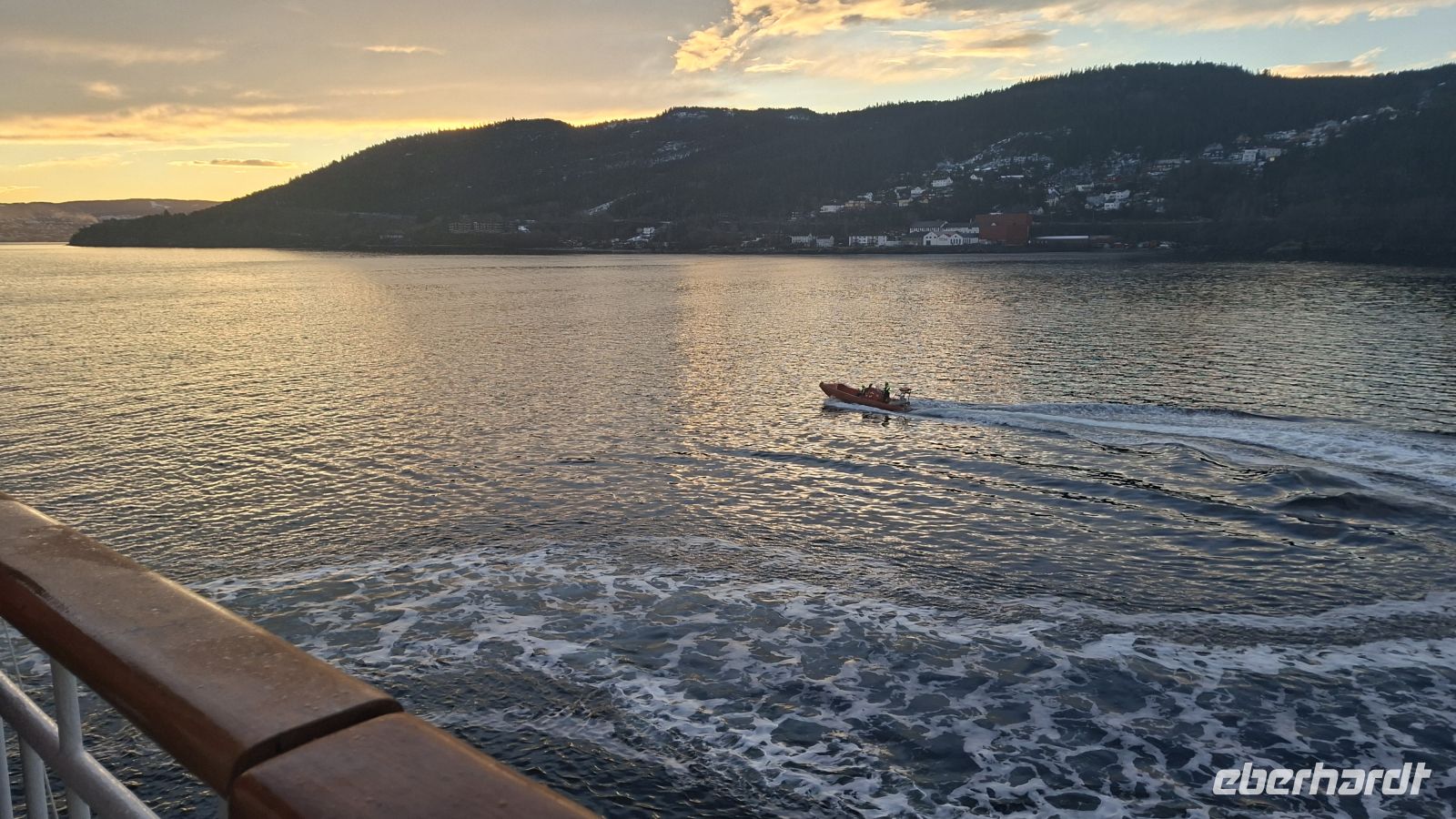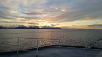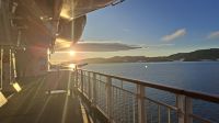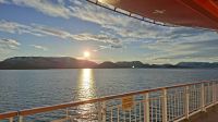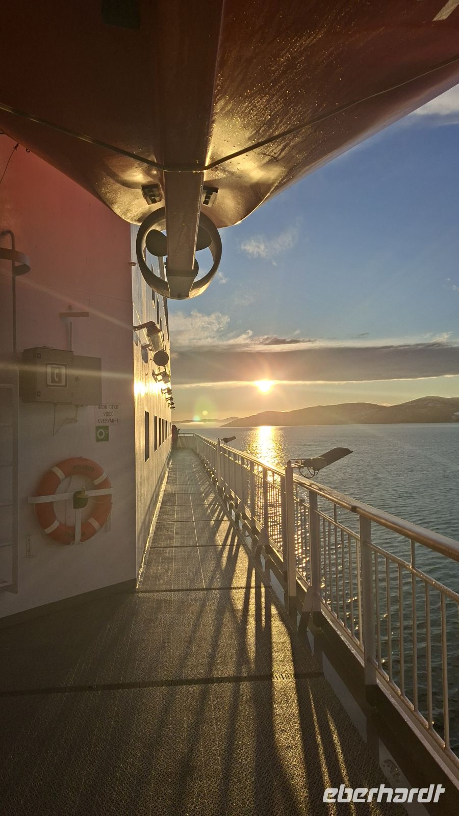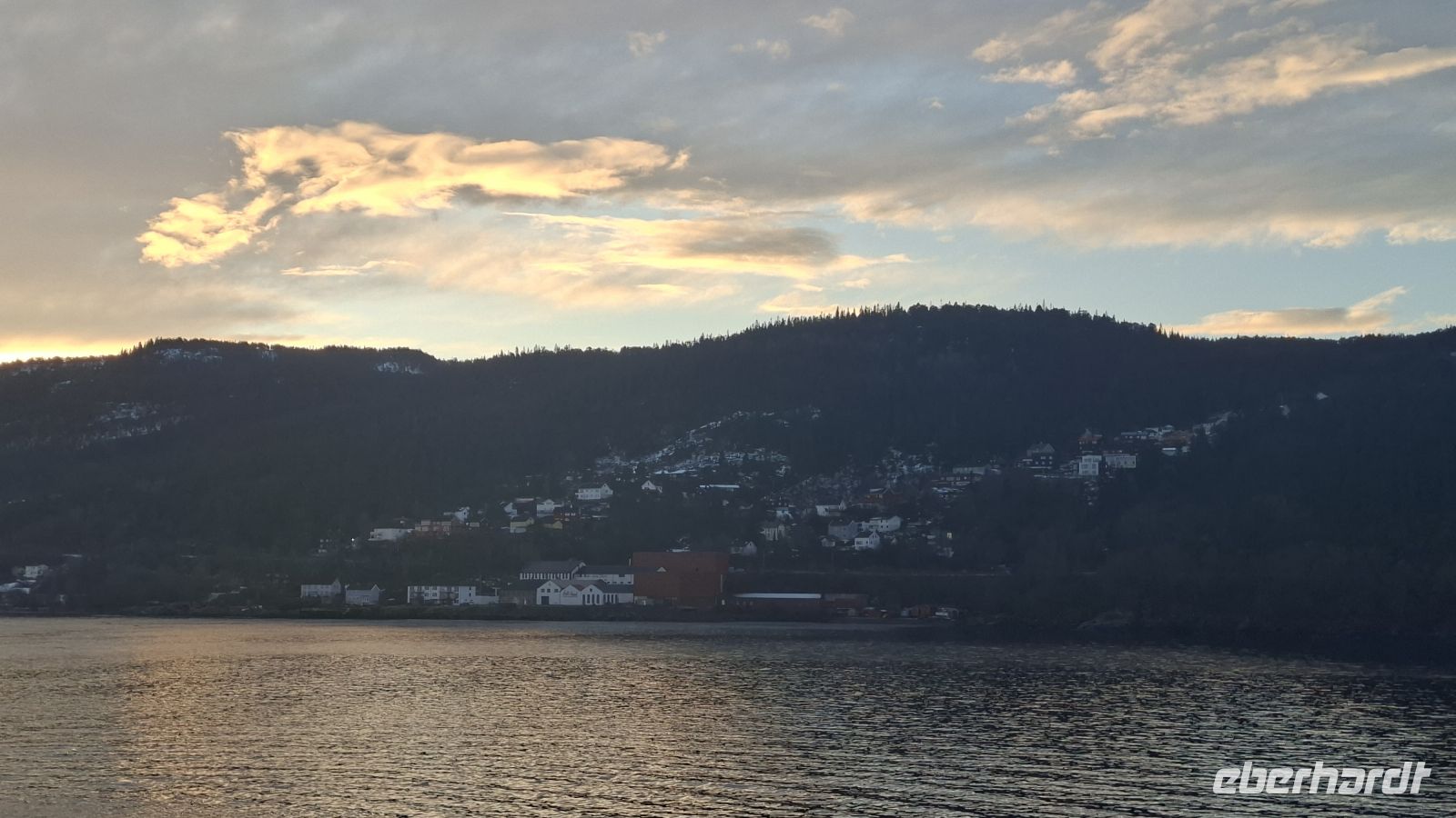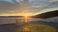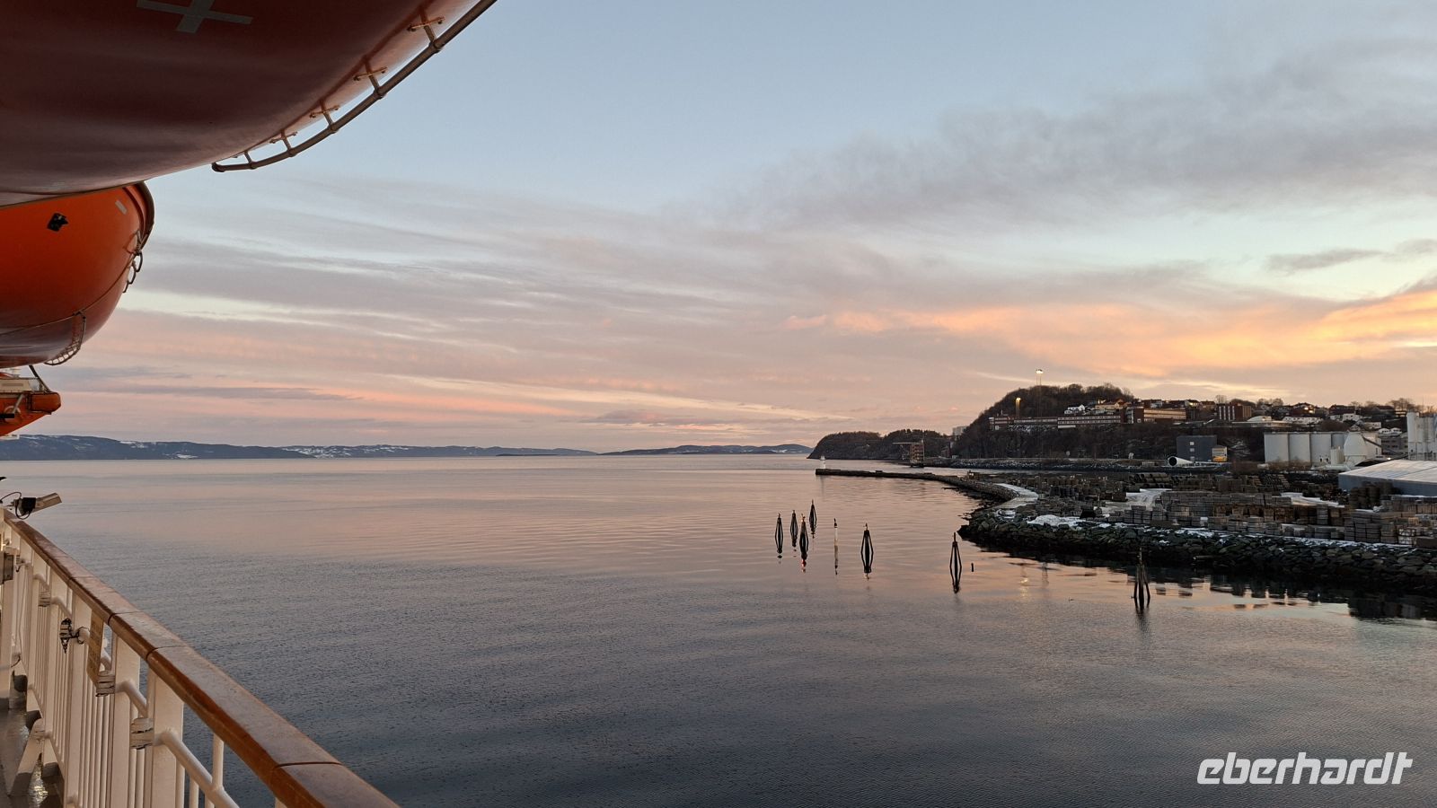 Am letzten Tag an Bord der MS Polarlys lag schon am Morgen ein bisschen Abschiedsstimmung in der Luft. Früh machten wir Halt in Trondheim, und während wir aus dem Hafen hinausfuhren, begegneten wir der MS Nordlys. Wie alte Bekannte winkten wir uns gegenseitig zu. Und dann passierte es: Wir sahen das erste Mal seit Tagen wieder die Sonne. Sie stand zwar niedrig, aber ihr Licht brach durch die Wolken – und plötzlich wirkte alles ein kleines bisschen freundlicher und wärmer.