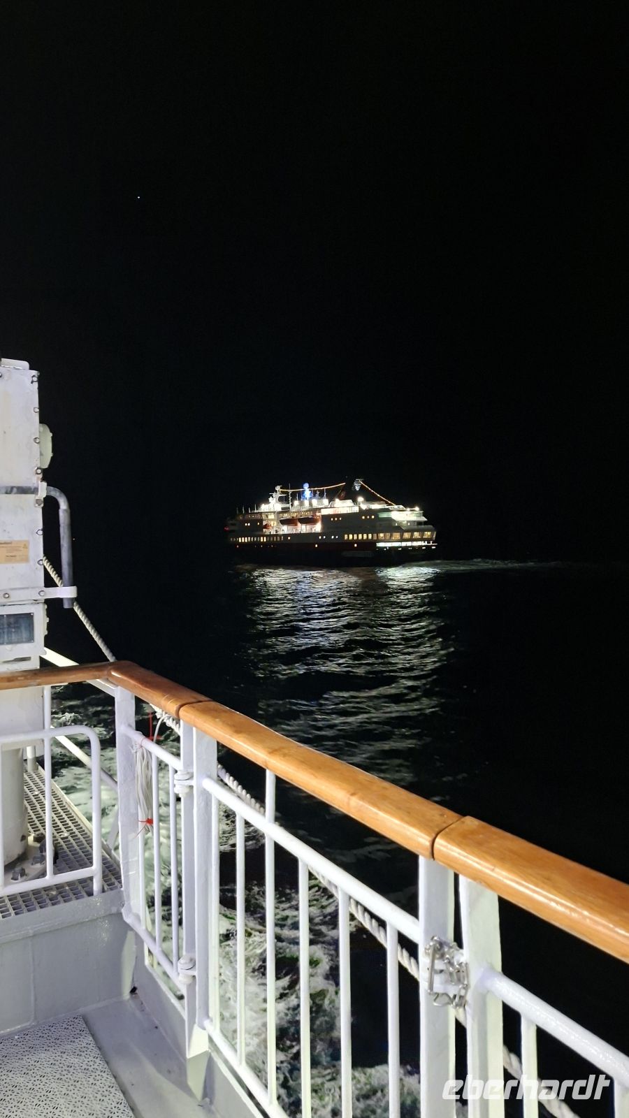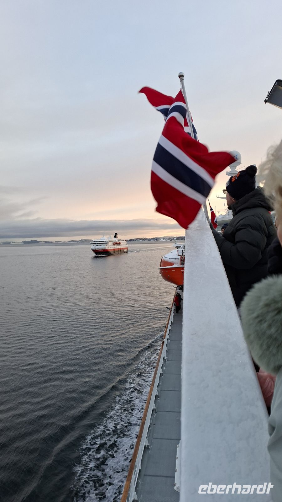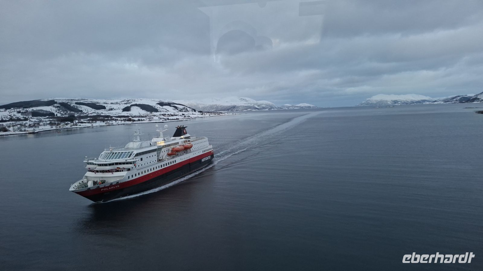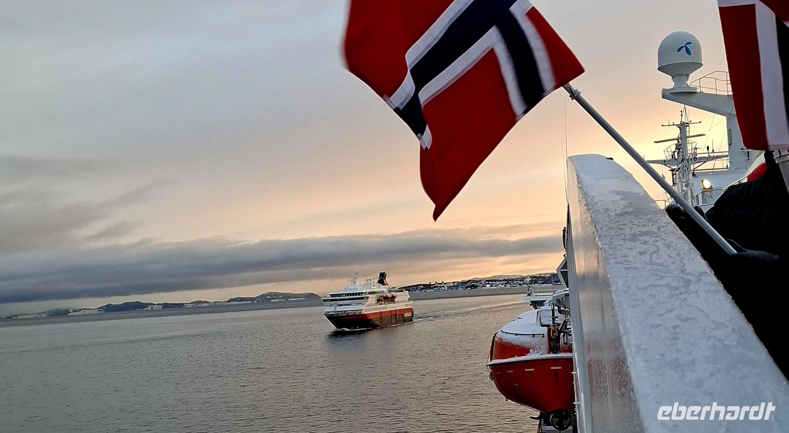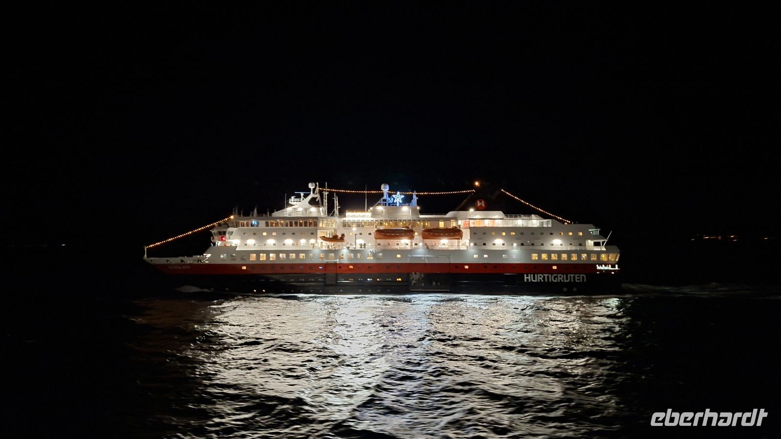 Anschließend begegneten wir der MS Nordnorge, einem Schwesterschiff auf der Hurtigruten-Route. Es fühlte sich ein bisschen an wie ein Treffen unter alten Bekannten: Wir winkten uns zu, machten Fotos und hatten das Gefühl, Teil einer kleinen Gemeinschaft auf dieser legendären Postschiff-Strecke zu sein.