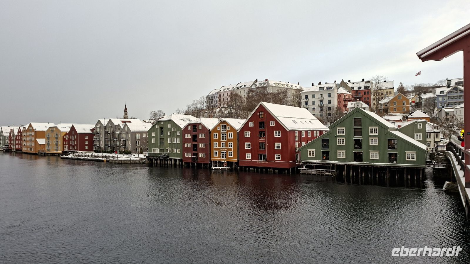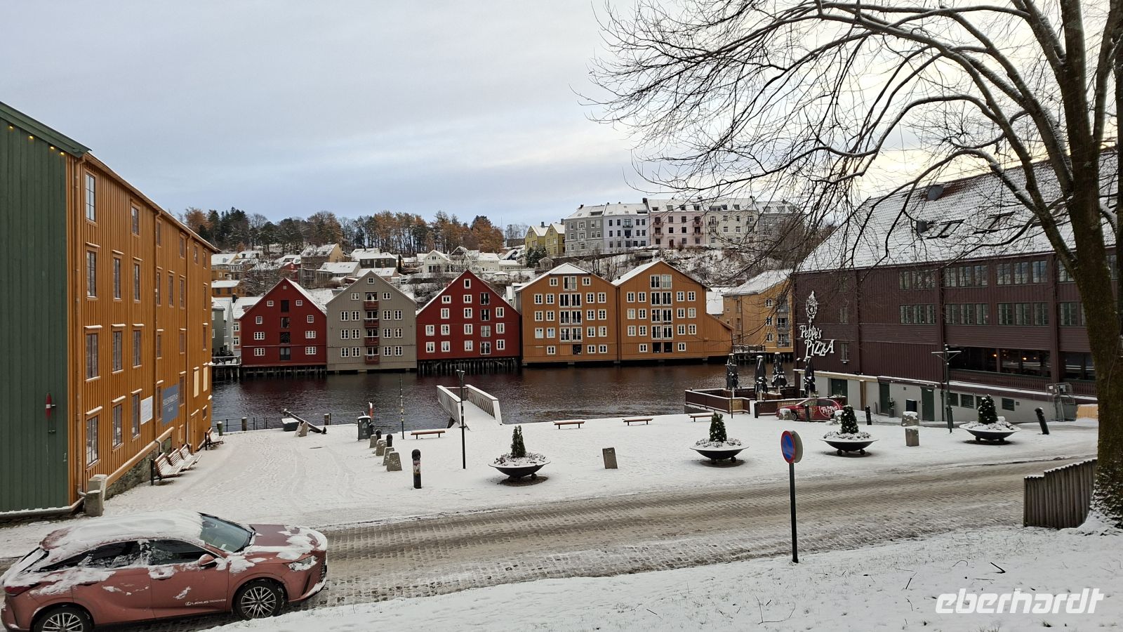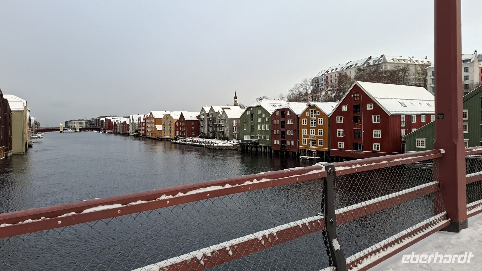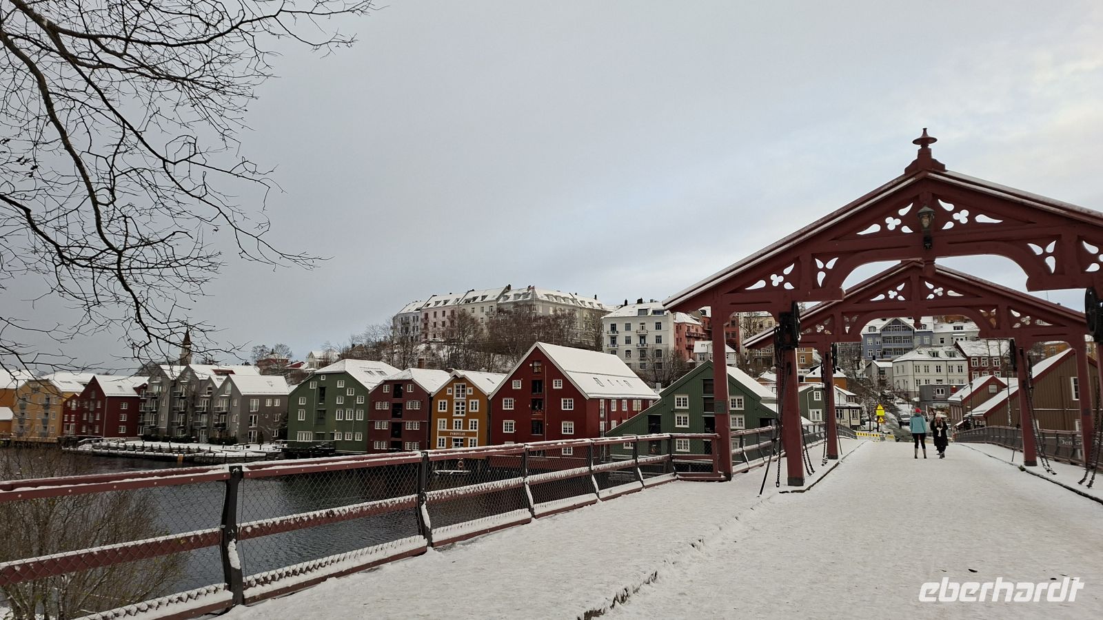 Dann liefen wir in Trondheim, der ehemaligen Wikingerhauptstadt, ein. Die Stadt empfing uns mit einer Mischung aus Geschichte, Studentenvibe und nordischer Gelassenheit. Wir machten uns zu Fuß auf den Weg entlang des Nidelva, des Flusses, der sich elegant durch Trondheim schlängelt. Unser Ziel war die sogenannte „Liebesbrücke“ – eine Brücke, von der aus wir einen tollen Blick auf die bunten, alten Lagerhäuser am Flussufer hatten. Die Holzgebäude standen auf Pfählen im Wasser, leuchteten in verschiedenen Farben und wirkten fast wie ein Norwegen-Puzzle, das jemand extra hübsch zusammengesetzt hatte.
