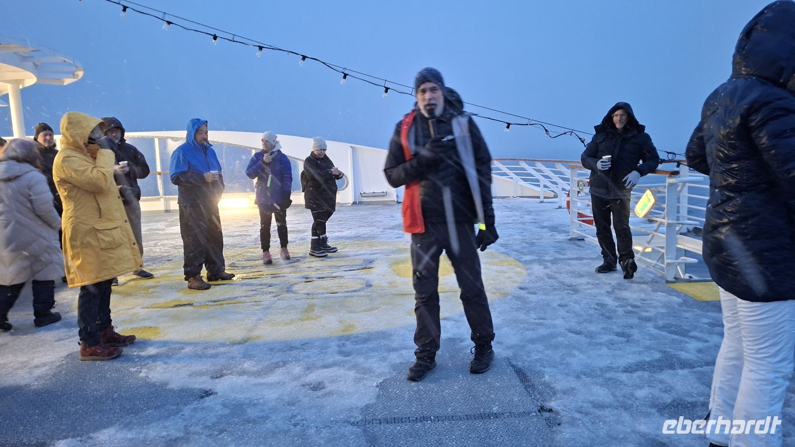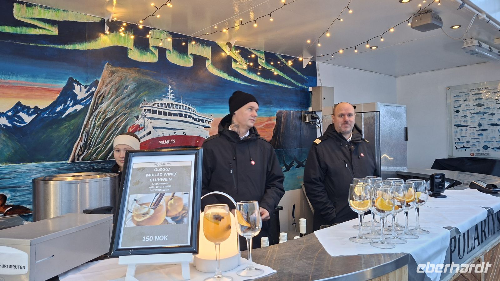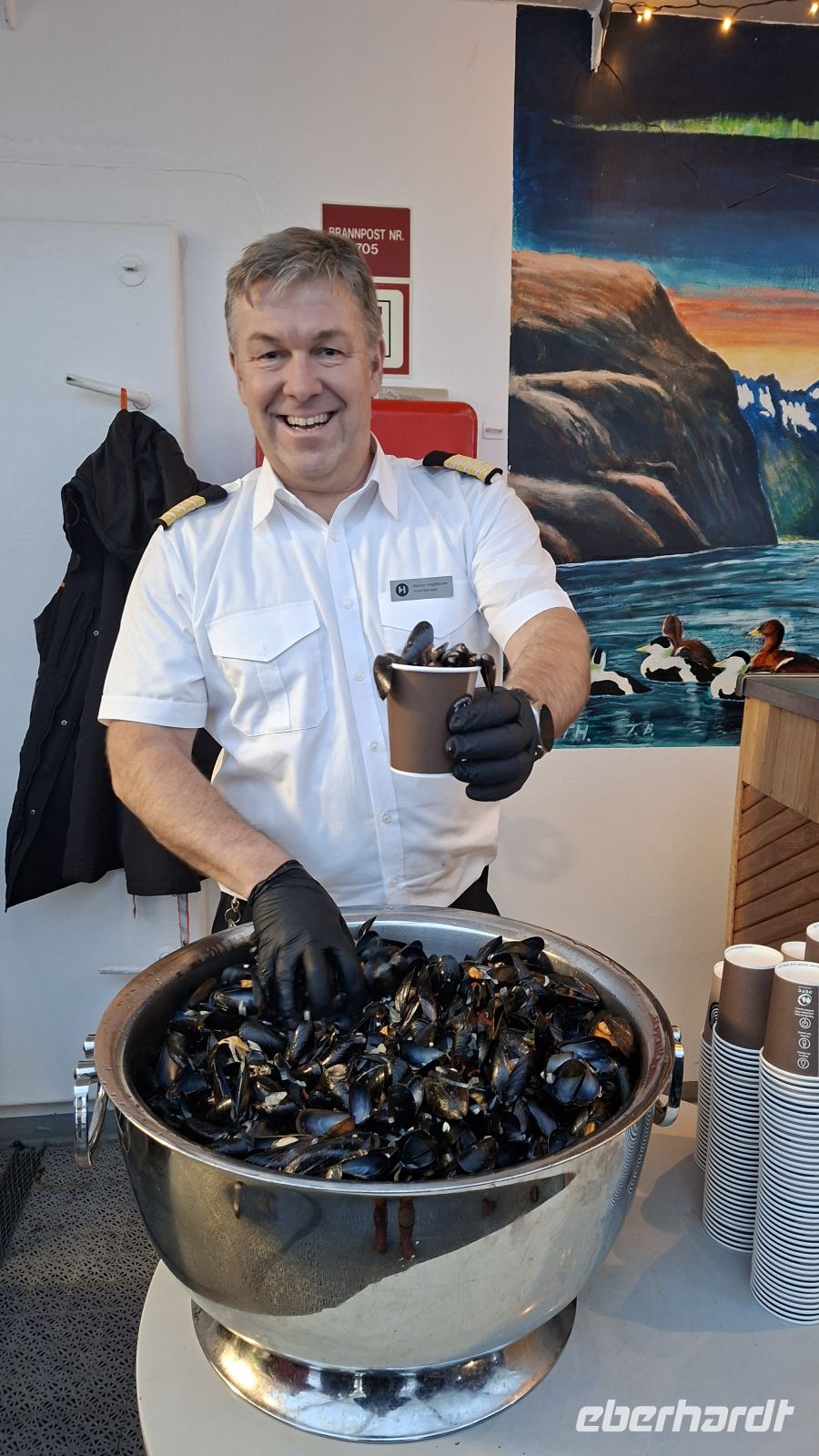 Am Nachmittag gab es ein weiteres Highlight: Auf Deck 7 am Heck wurden frische Miesmuscheln serviert – dazu einen wärmenden Glühwein in der Hand, die kalte Luft im Gesicht und das Meer rundherum.