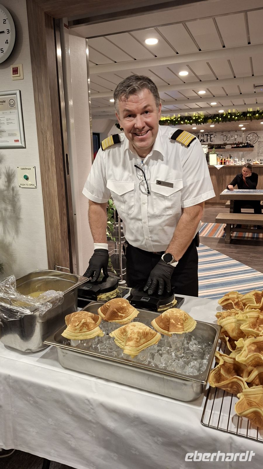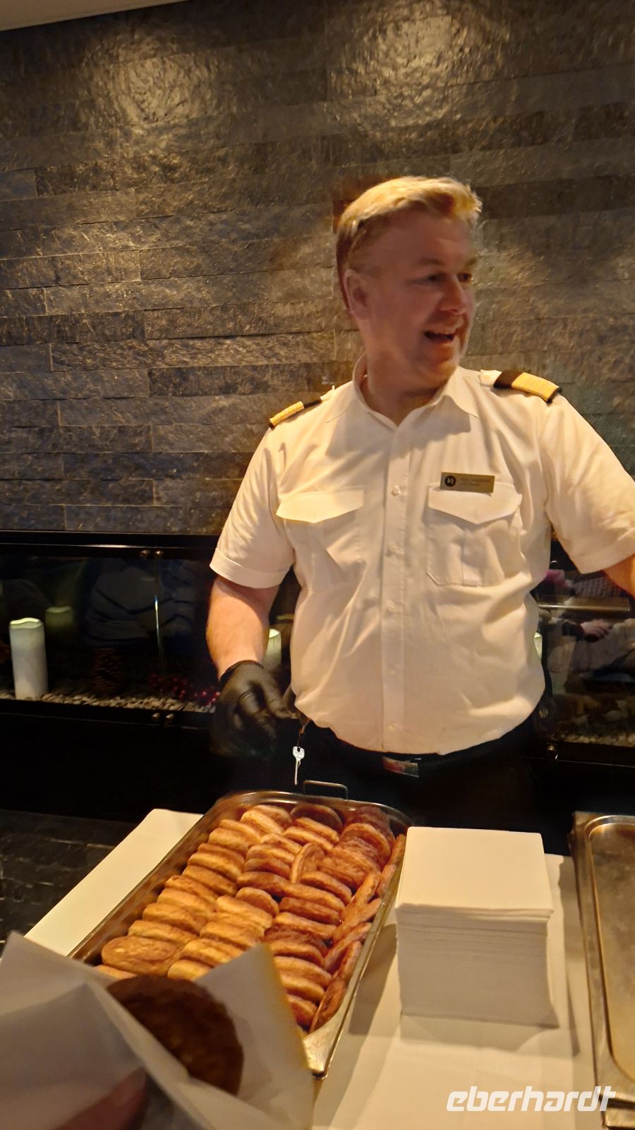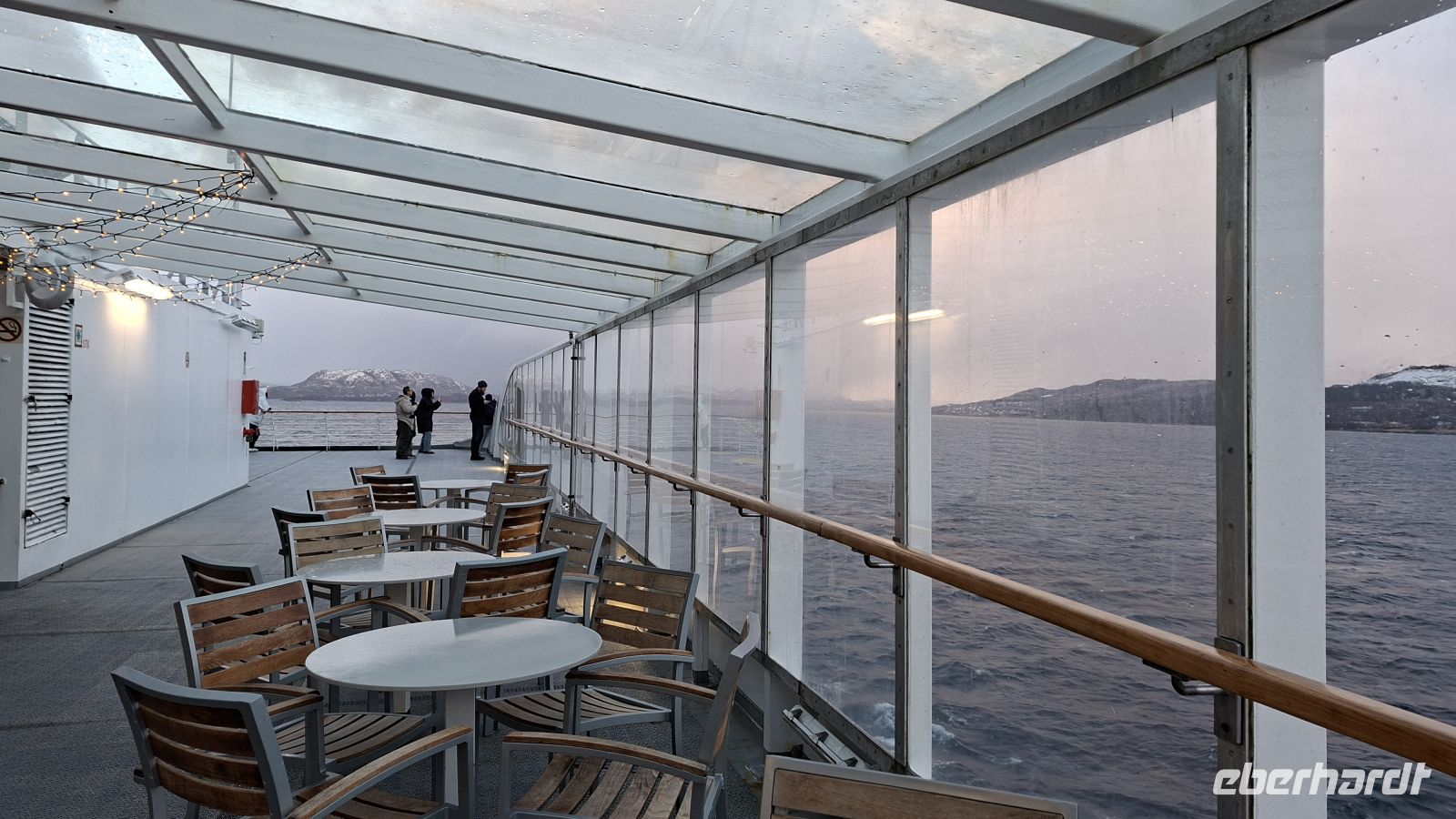 Am Nachmittag gab es ein weiteres Highlight: Auf Deck 7 am Heck wurden frische Miesmuscheln serviert – dazu einen wärmenden Glühwein in der Hand, die kalte Luft im Gesicht und das Meer rundherum.