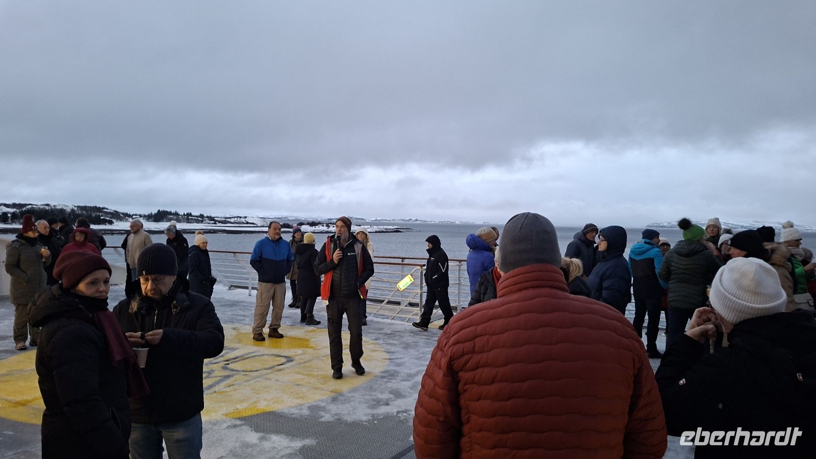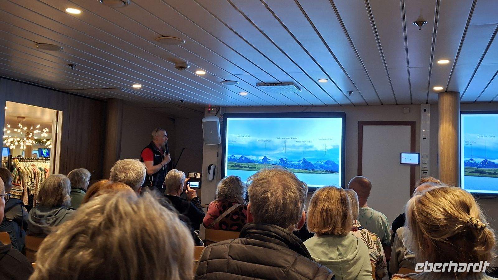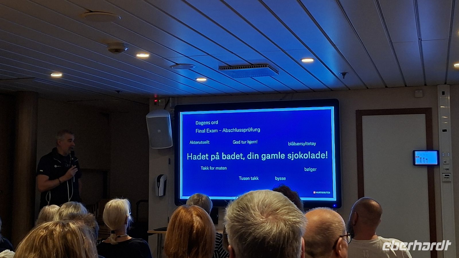 Wie jeden Tag trafen wir uns auch diesmal wieder mit dem Expeditionsteam für aktuelle Infos, Wetterbericht und einen kleinen Sprachkurs. Wir übten norwegische Wörter und bekamen spannende Hintergründe zu den Orten, die wir passierten.