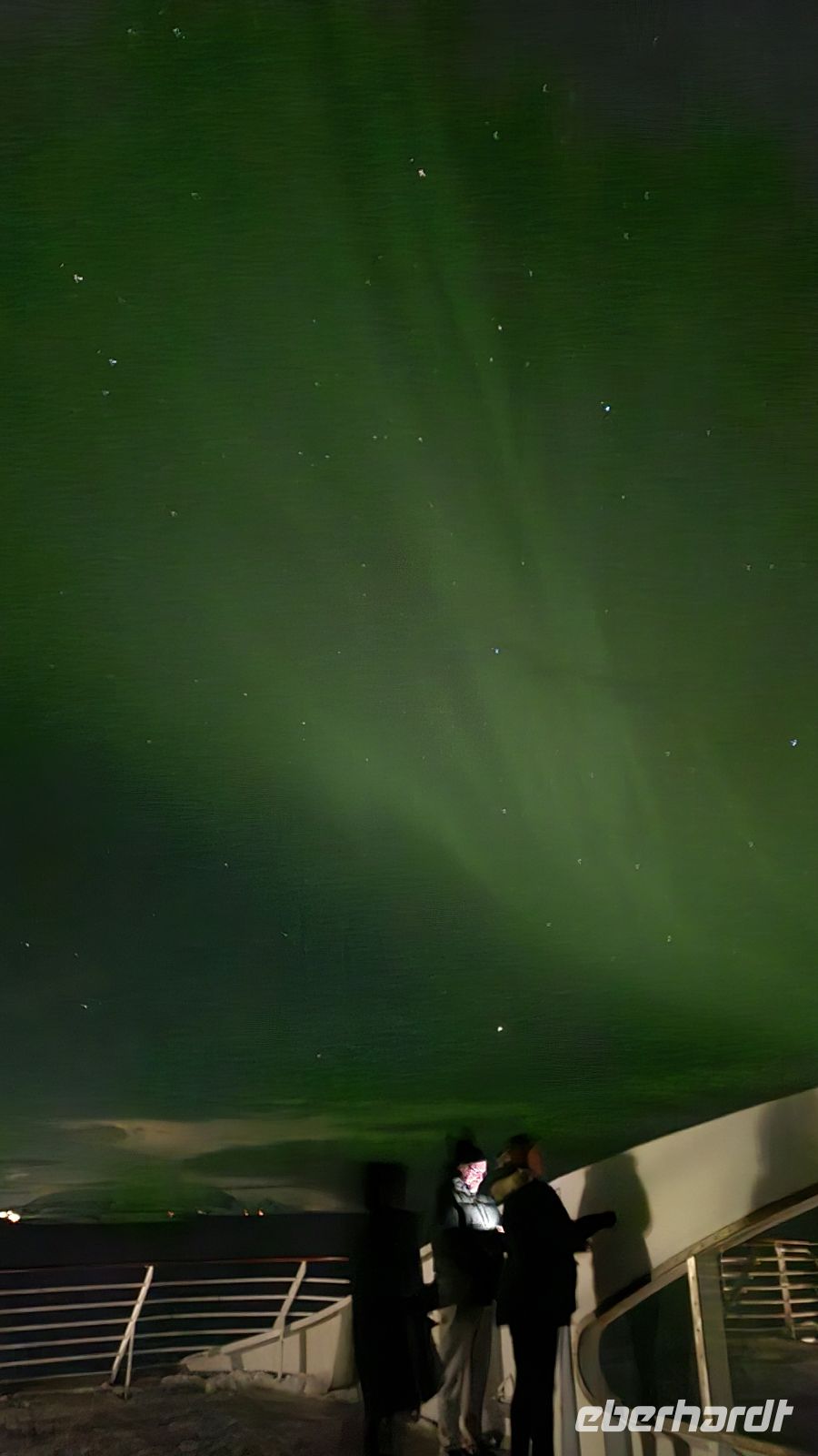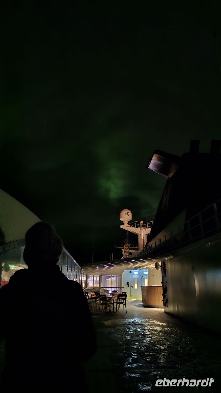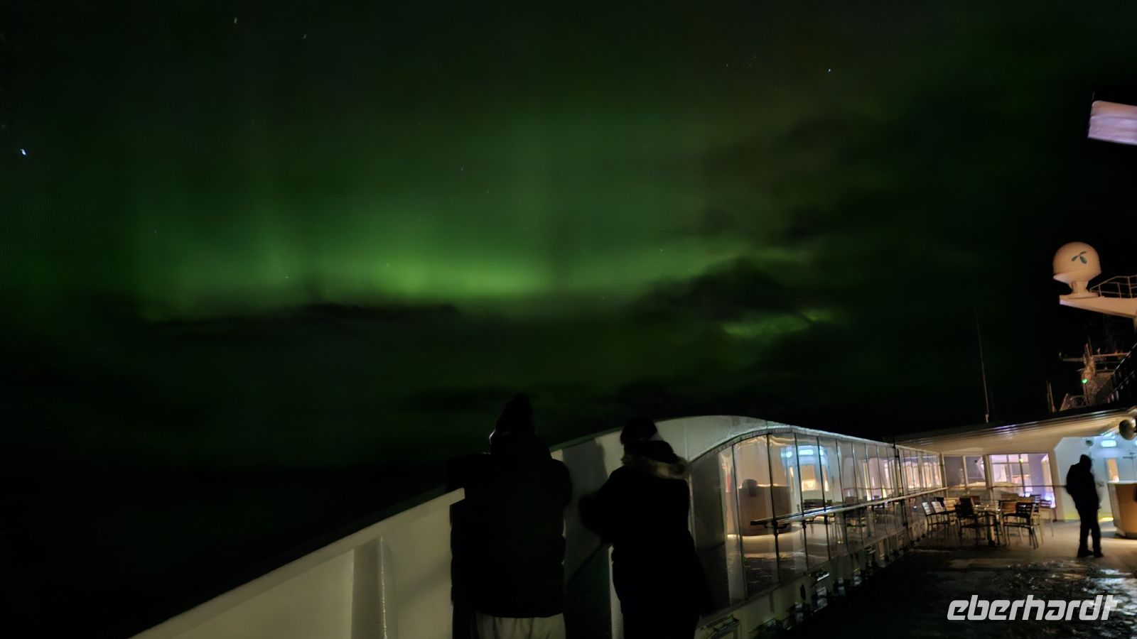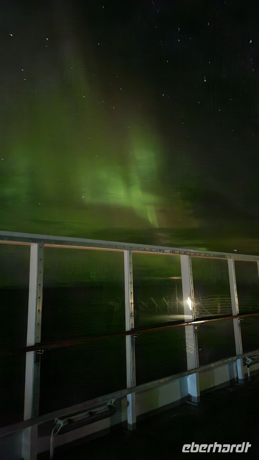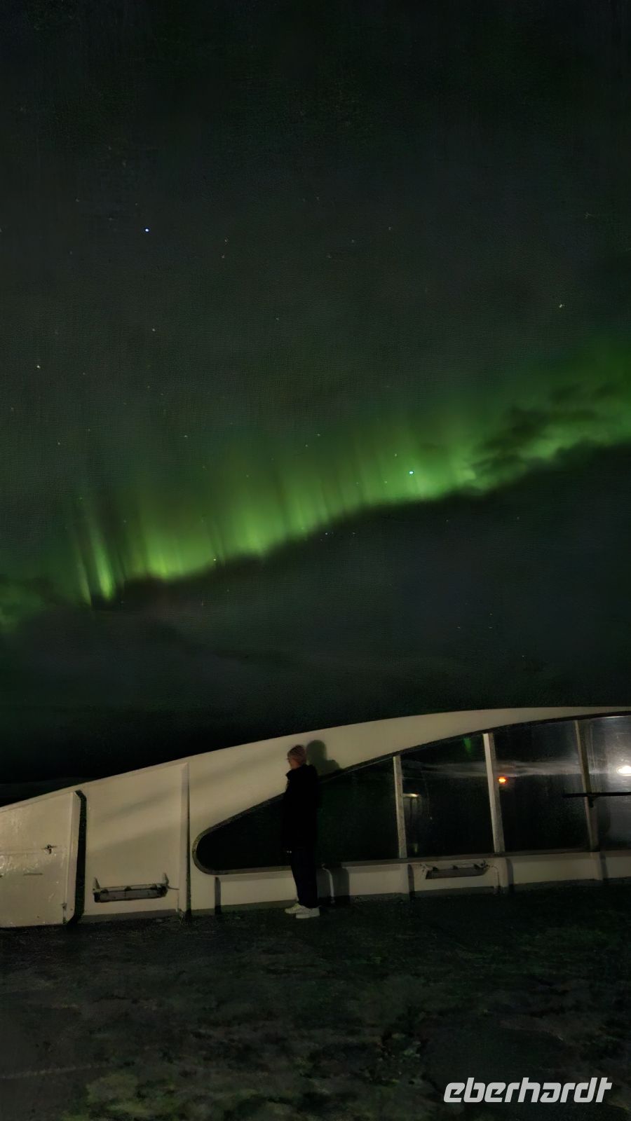 Zurück an Bord und nach dem Abendessen glaubten wir eigentlich, der Tag sei kaum noch zu toppen – aber Norwegen setzte noch einen drauf: Wir konnten Polarlichter bis tief in die Nacht bewundern. Grünliche Schleier, die sich über den Himmel zogen, mal zart, mal kräftig, mal wie ein Vorhang, mal wie tanzende Wellen. Es war schlicht atemberaubend. Wir konnten uns kaum lösen, weil wir Angst hatten, auch nur einen dieser magischen Momente zu verpassen. Irgendwann sind wir dann doch müde, aber überglücklich ins Bett gefallen – mit Nordlichtbildern im Kopf, die uns wahrscheinlich noch lange begleiten werden.