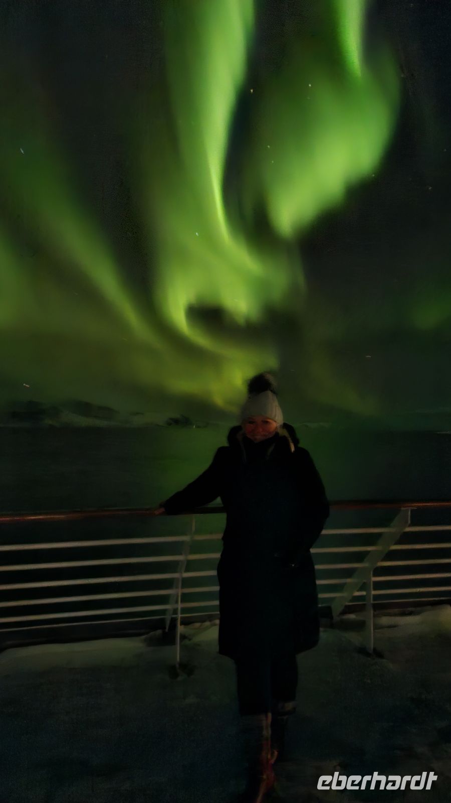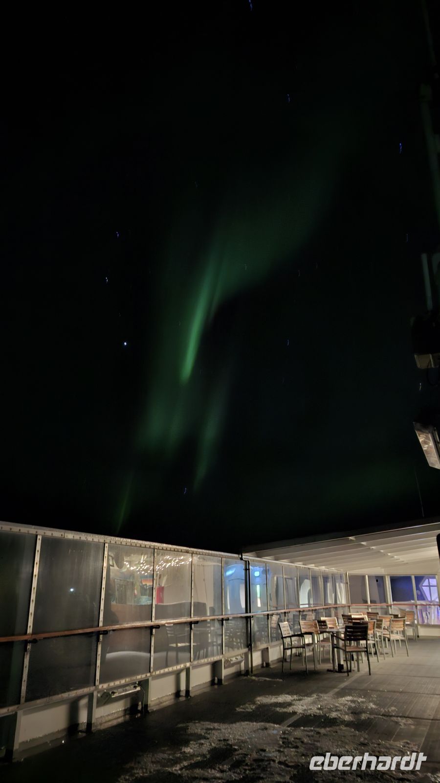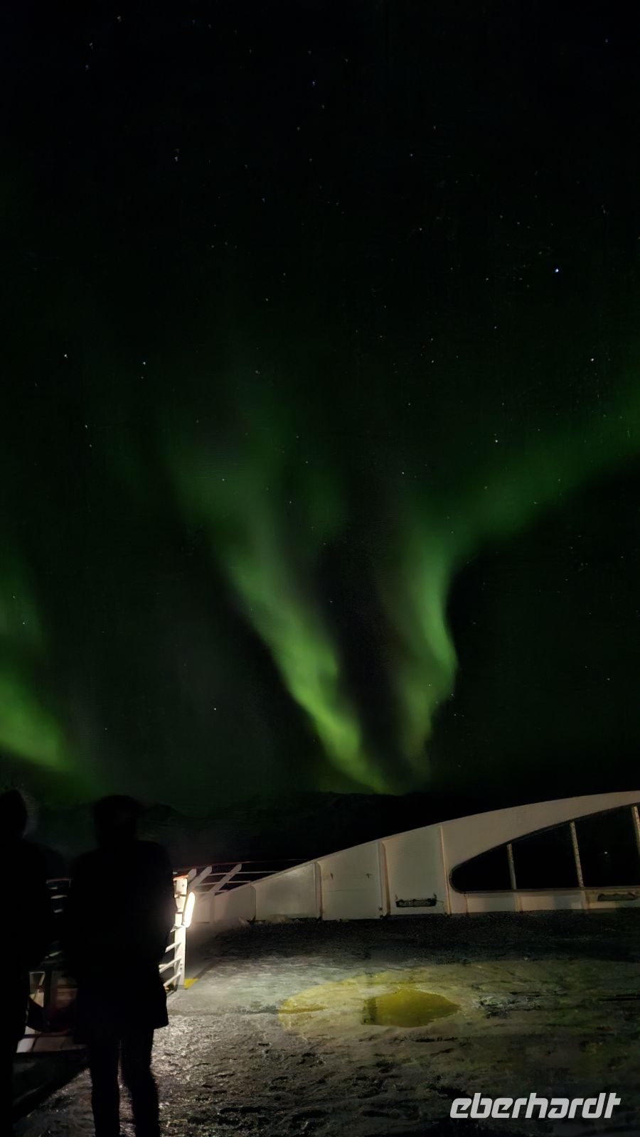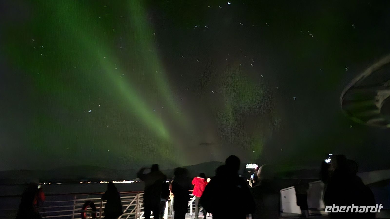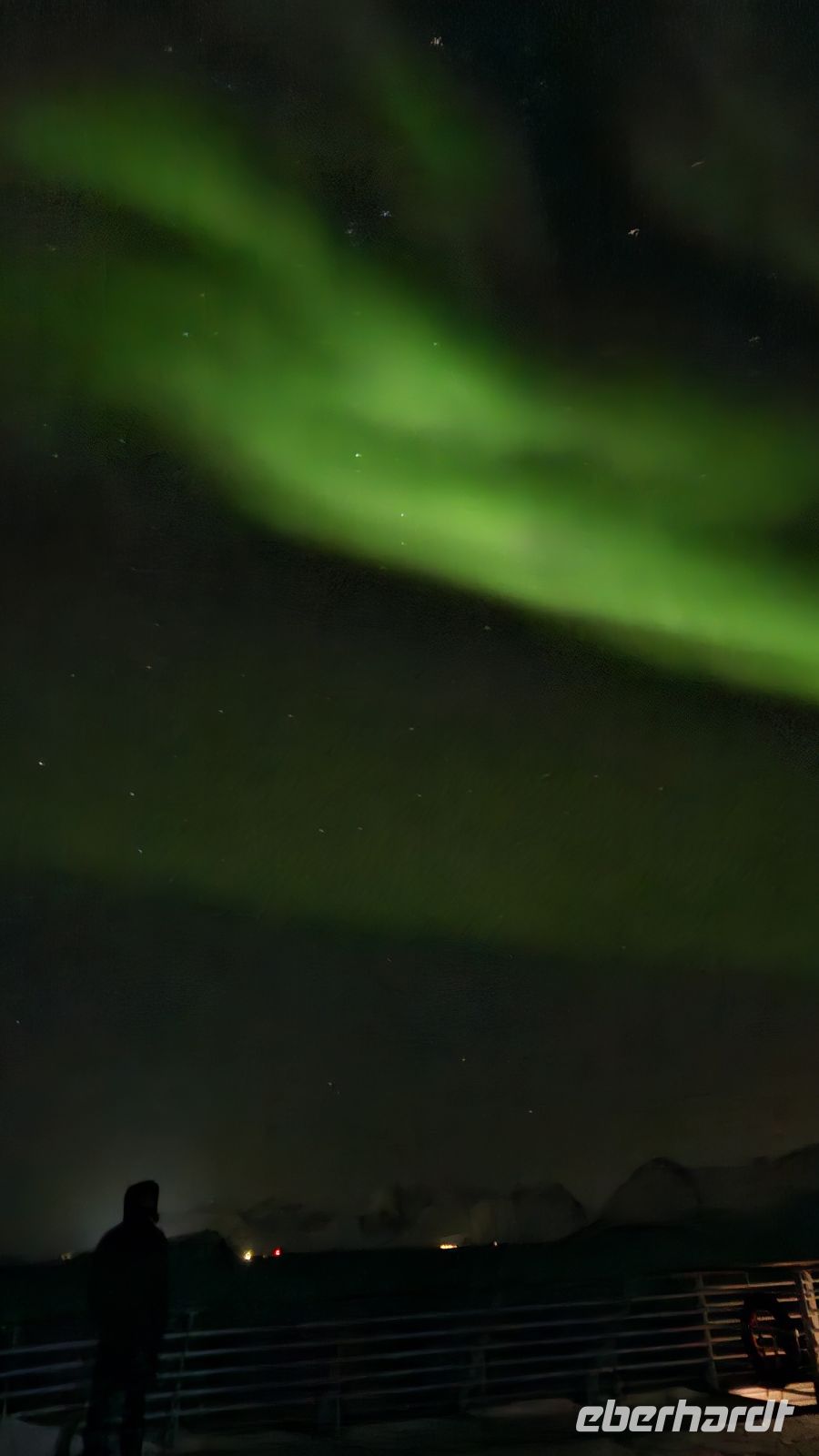 Zurück an Bord und nach dem Abendessen glaubten wir eigentlich, der Tag sei kaum noch zu toppen – aber Norwegen setzte noch einen drauf: Wir konnten Polarlichter bis tief in die Nacht bewundern. Grünliche Schleier, die sich über den Himmel zogen, mal zart, mal kräftig, mal wie ein Vorhang, mal wie tanzende Wellen. Es war schlicht atemberaubend. Wir konnten uns kaum lösen, weil wir Angst hatten, auch nur einen dieser magischen Momente zu verpassen. Irgendwann sind wir dann doch müde, aber überglücklich ins Bett gefallen – mit Nordlichtbildern im Kopf, die uns wahrscheinlich noch lange begleiten werden.