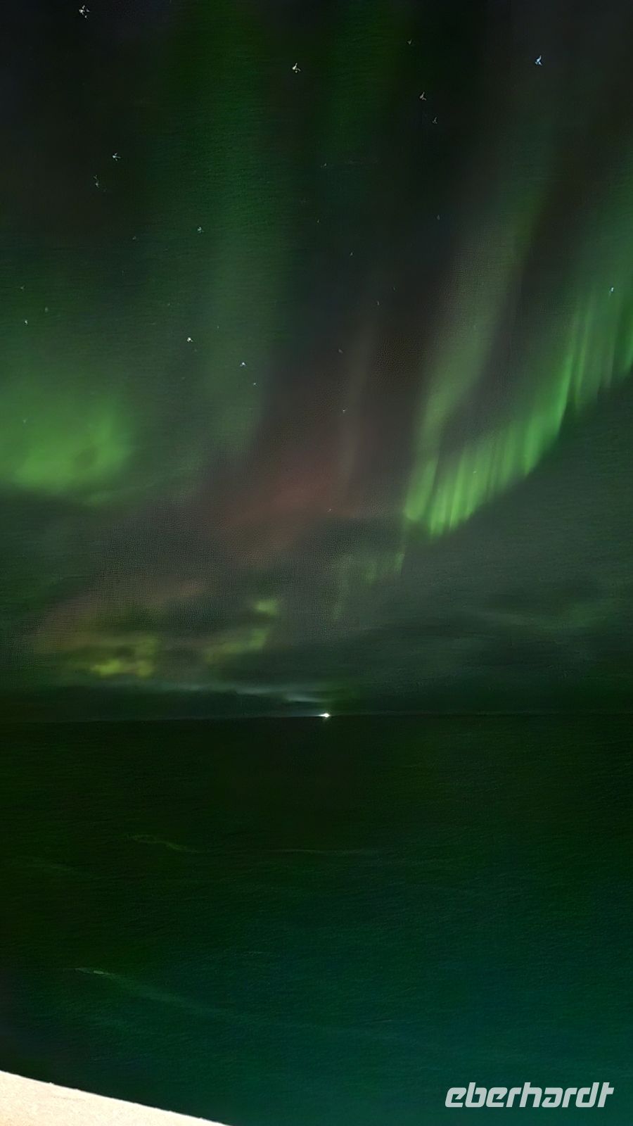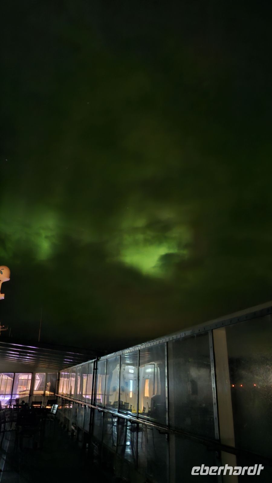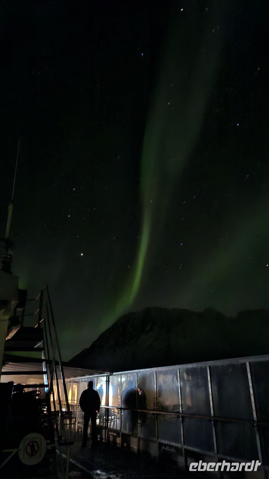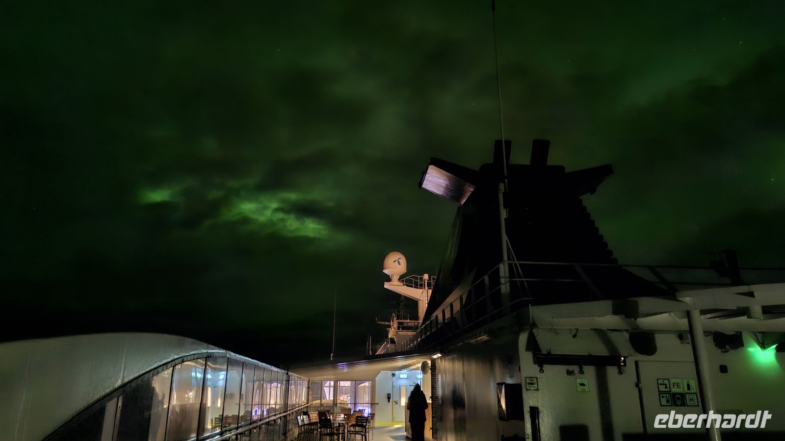 Zurück an Bord und nach dem Abendessen glaubten wir eigentlich, der Tag sei kaum noch zu toppen – aber Norwegen setzte noch einen drauf: Wir konnten Polarlichter bis tief in die Nacht bewundern. Grünliche Schleier, die sich über den Himmel zogen, mal zart, mal kräftig, mal wie ein Vorhang, mal wie tanzende Wellen. Es war schlicht atemberaubend. Wir konnten uns kaum lösen, weil wir Angst hatten, auch nur einen dieser magischen Momente zu verpassen. Irgendwann sind wir dann doch müde, aber überglücklich ins Bett gefallen – mit Nordlichtbildern im Kopf, die uns wahrscheinlich noch lange begleiten werden.