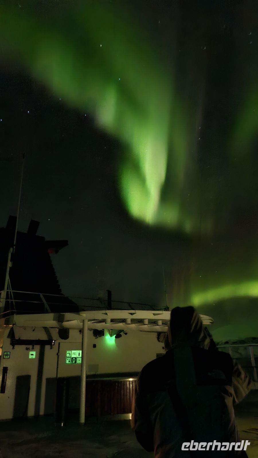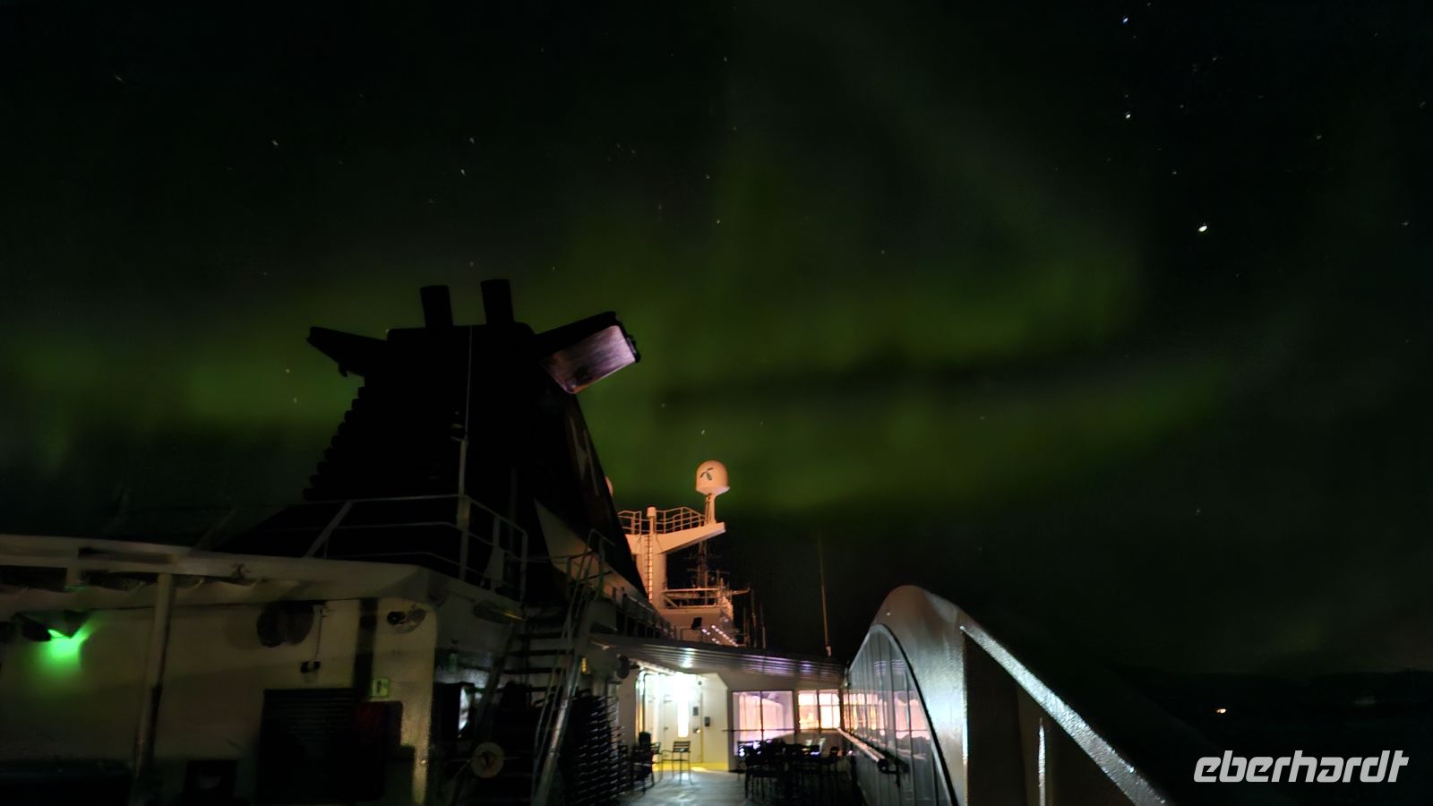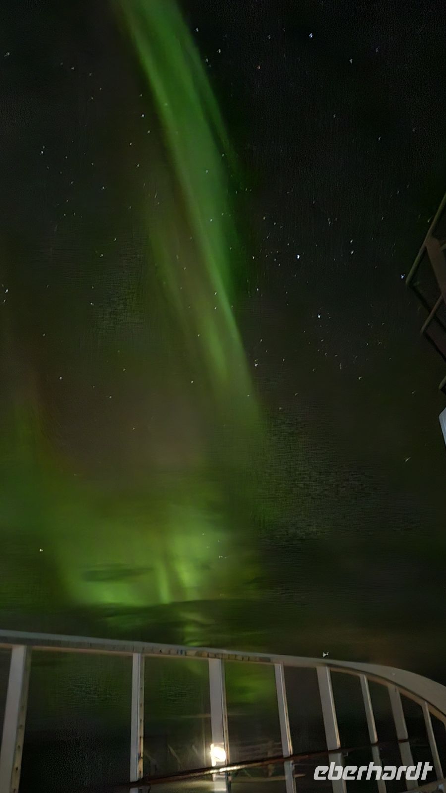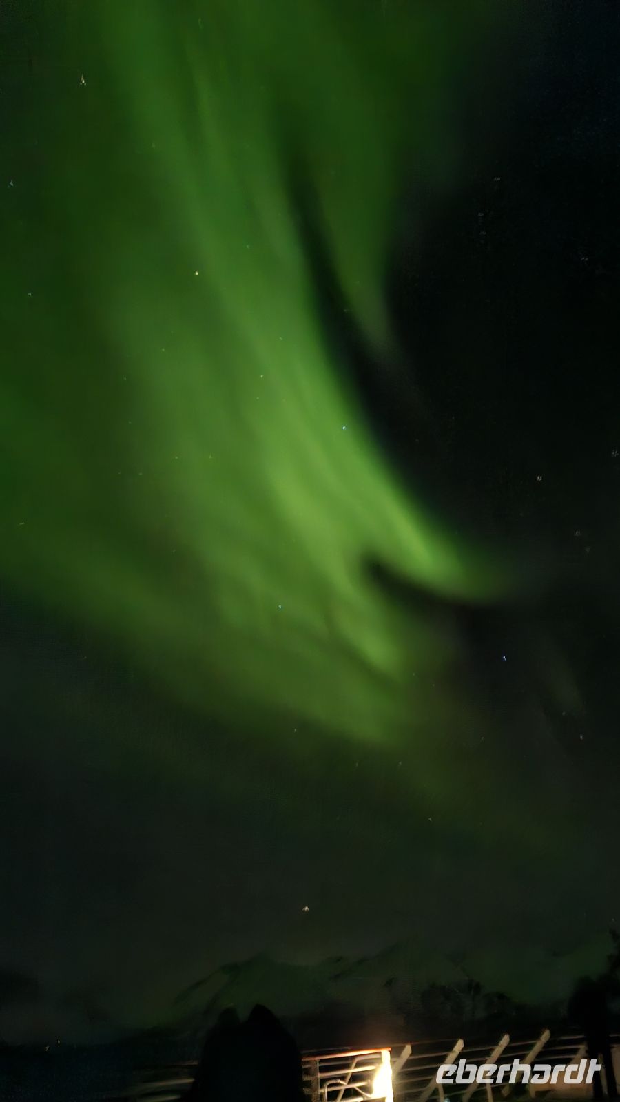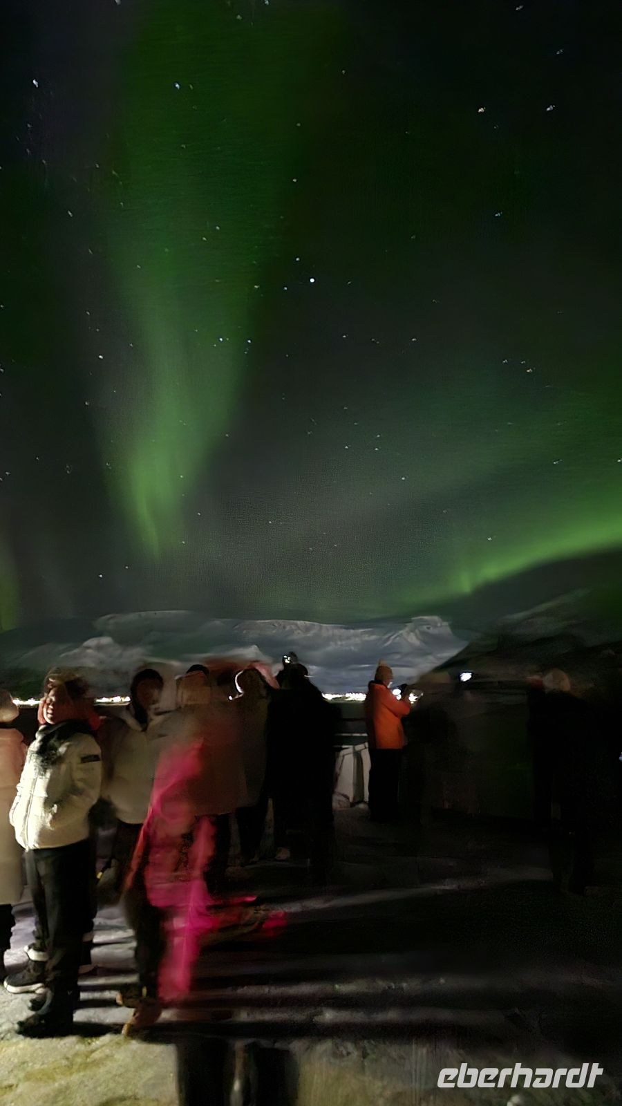 Zurück an Bord und nach dem Abendessen glaubten wir eigentlich, der Tag sei kaum noch zu toppen – aber Norwegen setzte noch einen drauf: Wir konnten Polarlichter bis tief in die Nacht bewundern. Grünliche Schleier, die sich über den Himmel zogen, mal zart, mal kräftig, mal wie ein Vorhang, mal wie tanzende Wellen. Es war schlicht atemberaubend. Wir konnten uns kaum lösen, weil wir Angst hatten, auch nur einen dieser magischen Momente zu verpassen. Irgendwann sind wir dann doch müde, aber überglücklich ins Bett gefallen – mit Nordlichtbildern im Kopf, die uns wahrscheinlich noch lange begleiten werden.