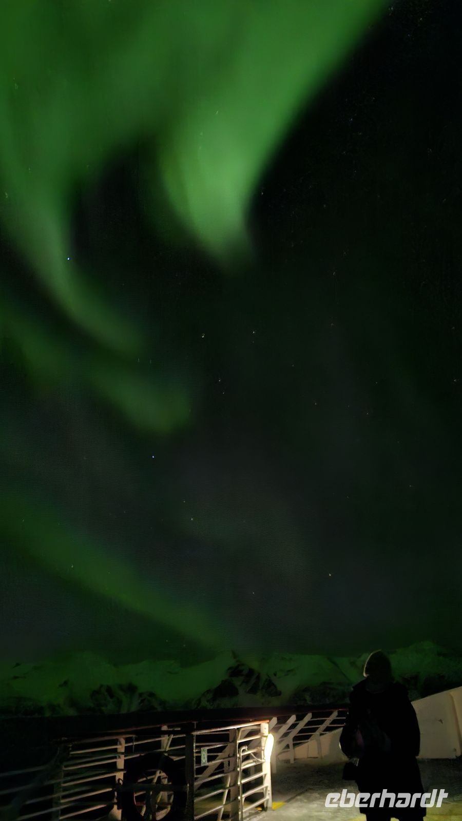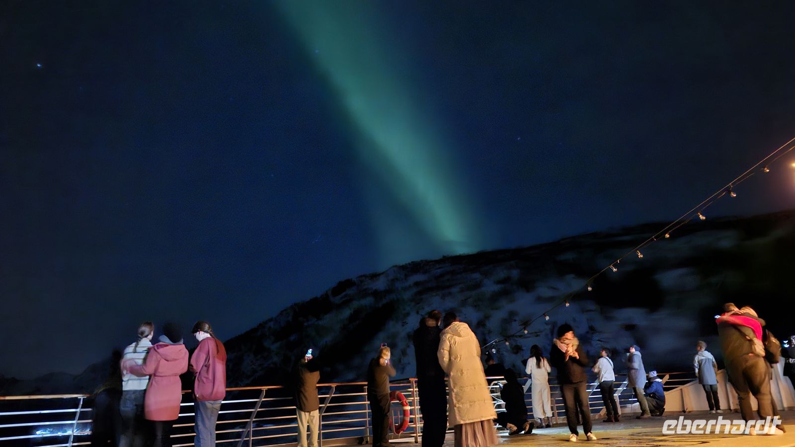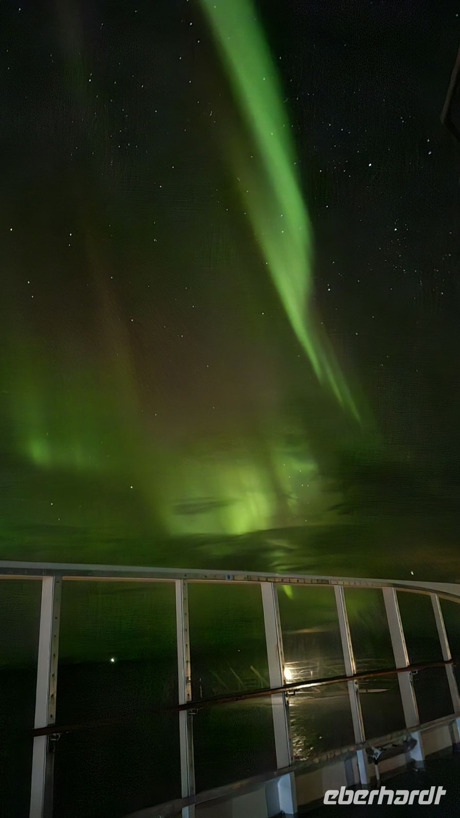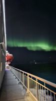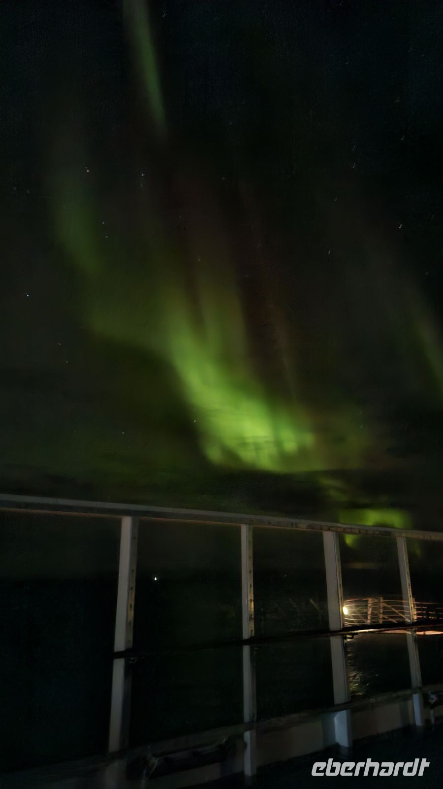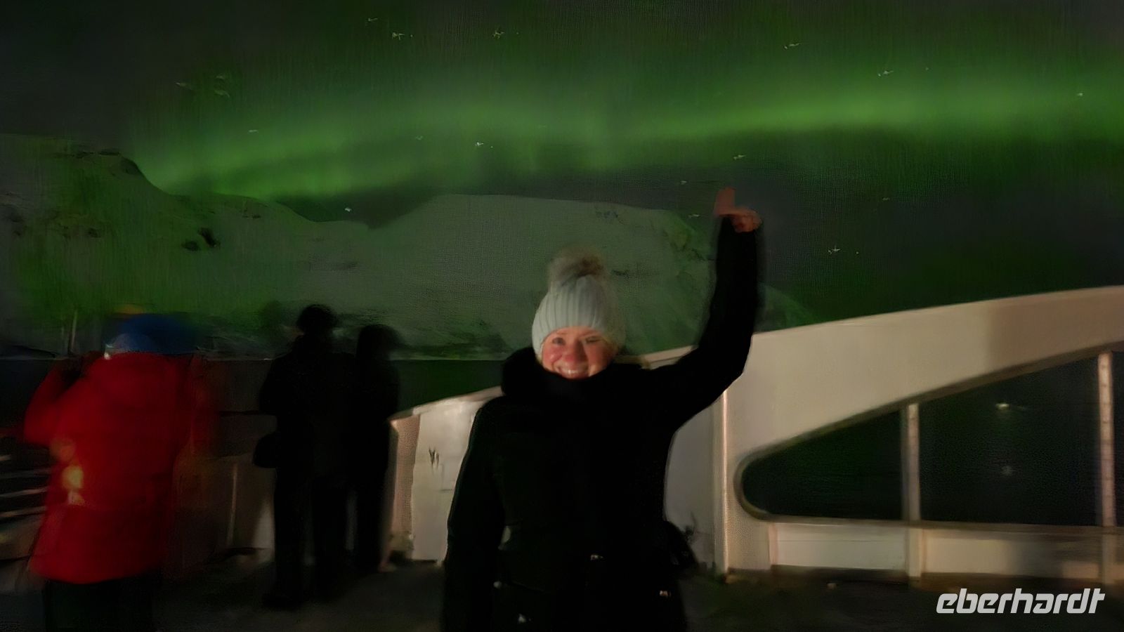 Zurück an Bord und nach dem Abendessen glaubten wir eigentlich, der Tag sei kaum noch zu toppen – aber Norwegen setzte noch einen drauf: Wir konnten Polarlichter bis tief in die Nacht bewundern. Grünliche Schleier, die sich über den Himmel zogen, mal zart, mal kräftig, mal wie ein Vorhang, mal wie tanzende Wellen. Es war schlicht atemberaubend. Wir konnten uns kaum lösen, weil wir Angst hatten, auch nur einen dieser magischen Momente zu verpassen. Irgendwann sind wir dann doch müde, aber überglücklich ins Bett gefallen – mit Nordlichtbildern im Kopf, die uns wahrscheinlich noch lange begleiten werden.