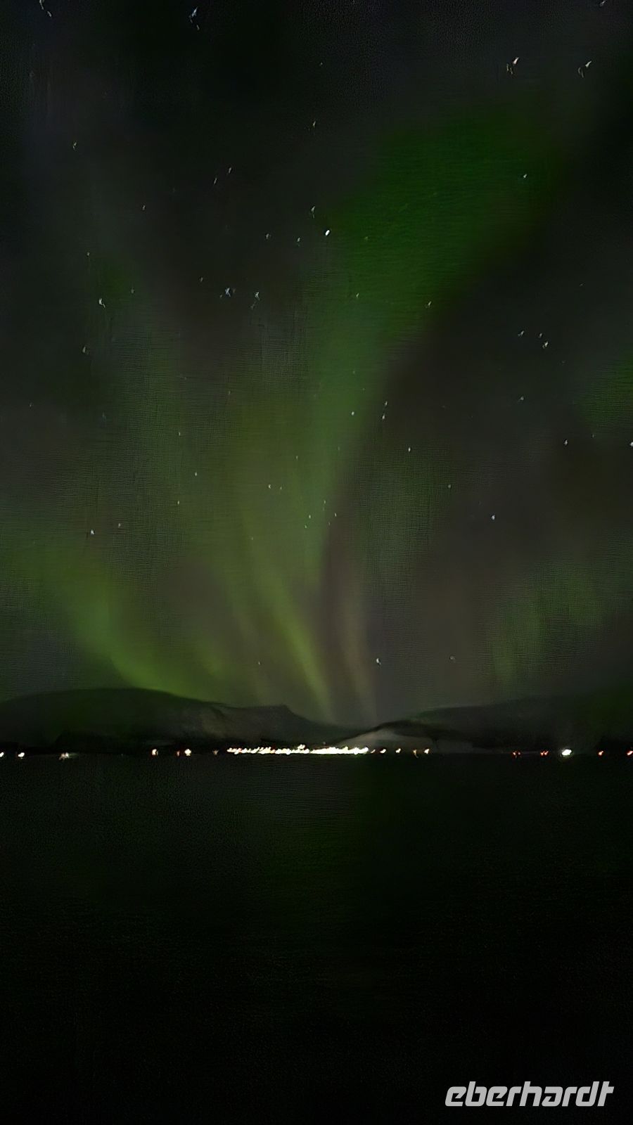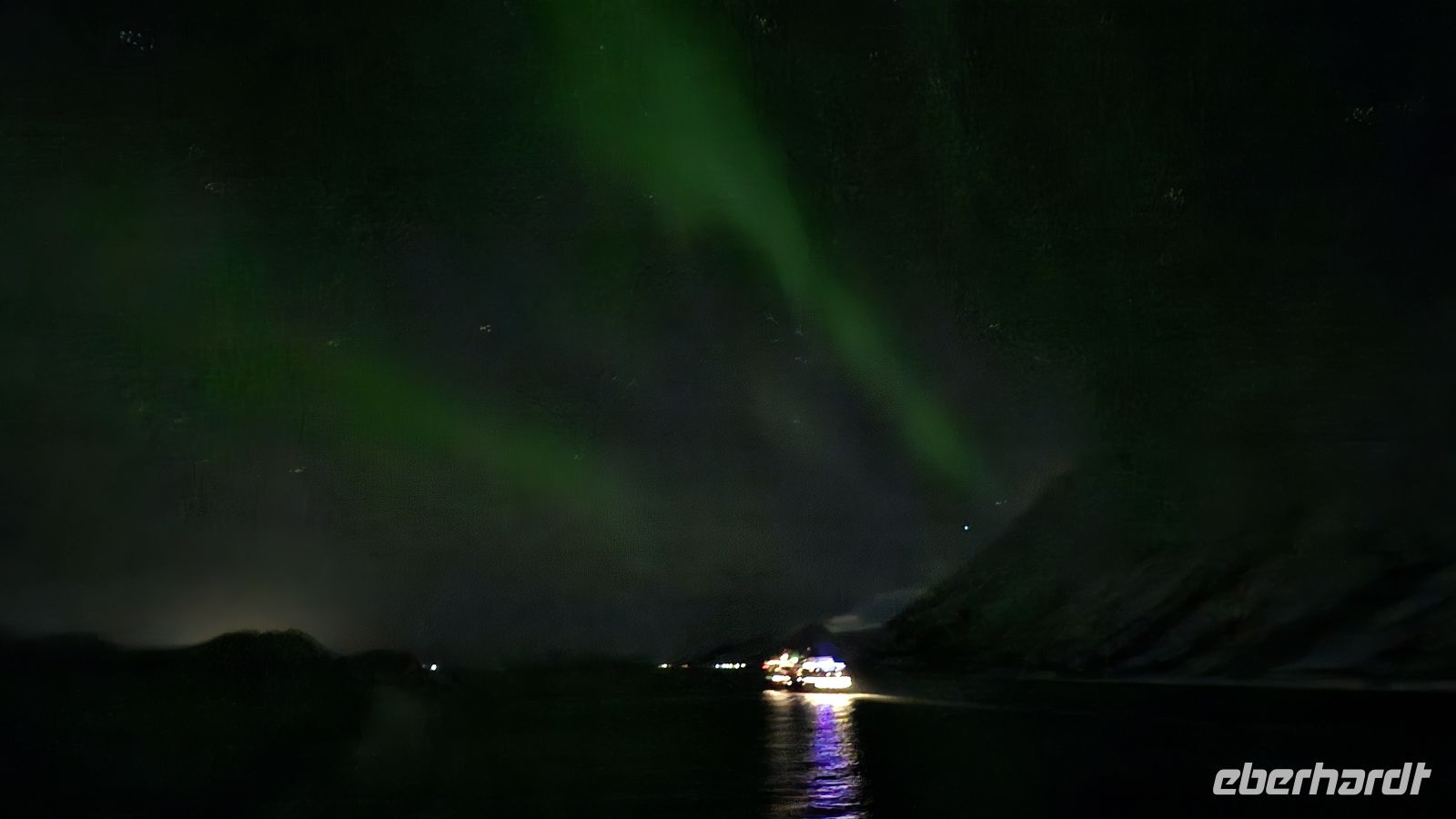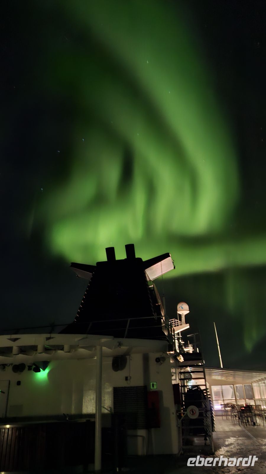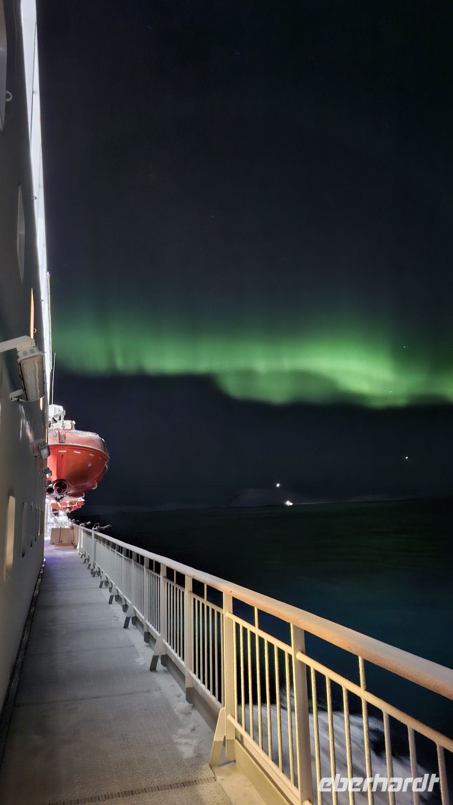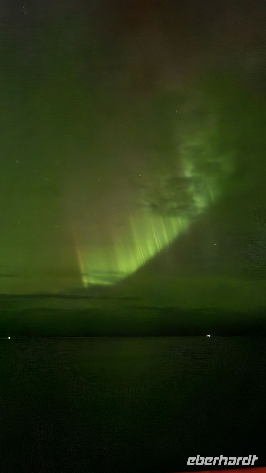 Zurück an Bord und nach dem Abendessen glaubten wir eigentlich, der Tag sei kaum noch zu toppen – aber Norwegen setzte noch einen drauf: Wir konnten Polarlichter bis tief in die Nacht bewundern. Grünliche Schleier, die sich über den Himmel zogen, mal zart, mal kräftig, mal wie ein Vorhang, mal wie tanzende Wellen. Es war schlicht atemberaubend. Wir konnten uns kaum lösen, weil wir Angst hatten, auch nur einen dieser magischen Momente zu verpassen. Irgendwann sind wir dann doch müde, aber überglücklich ins Bett gefallen – mit Nordlichtbildern im Kopf, die uns wahrscheinlich noch lange begleiten werden.