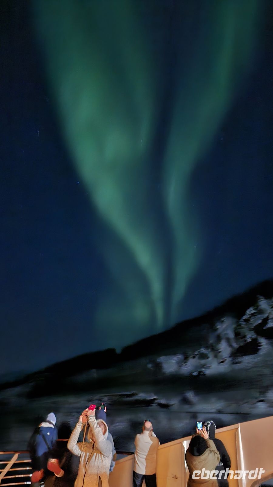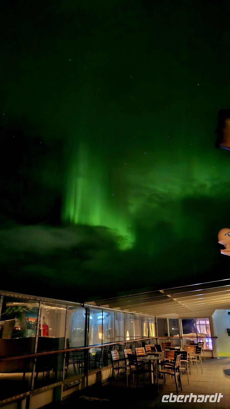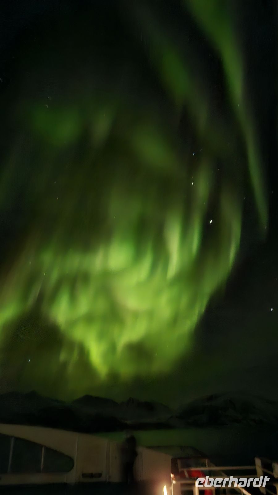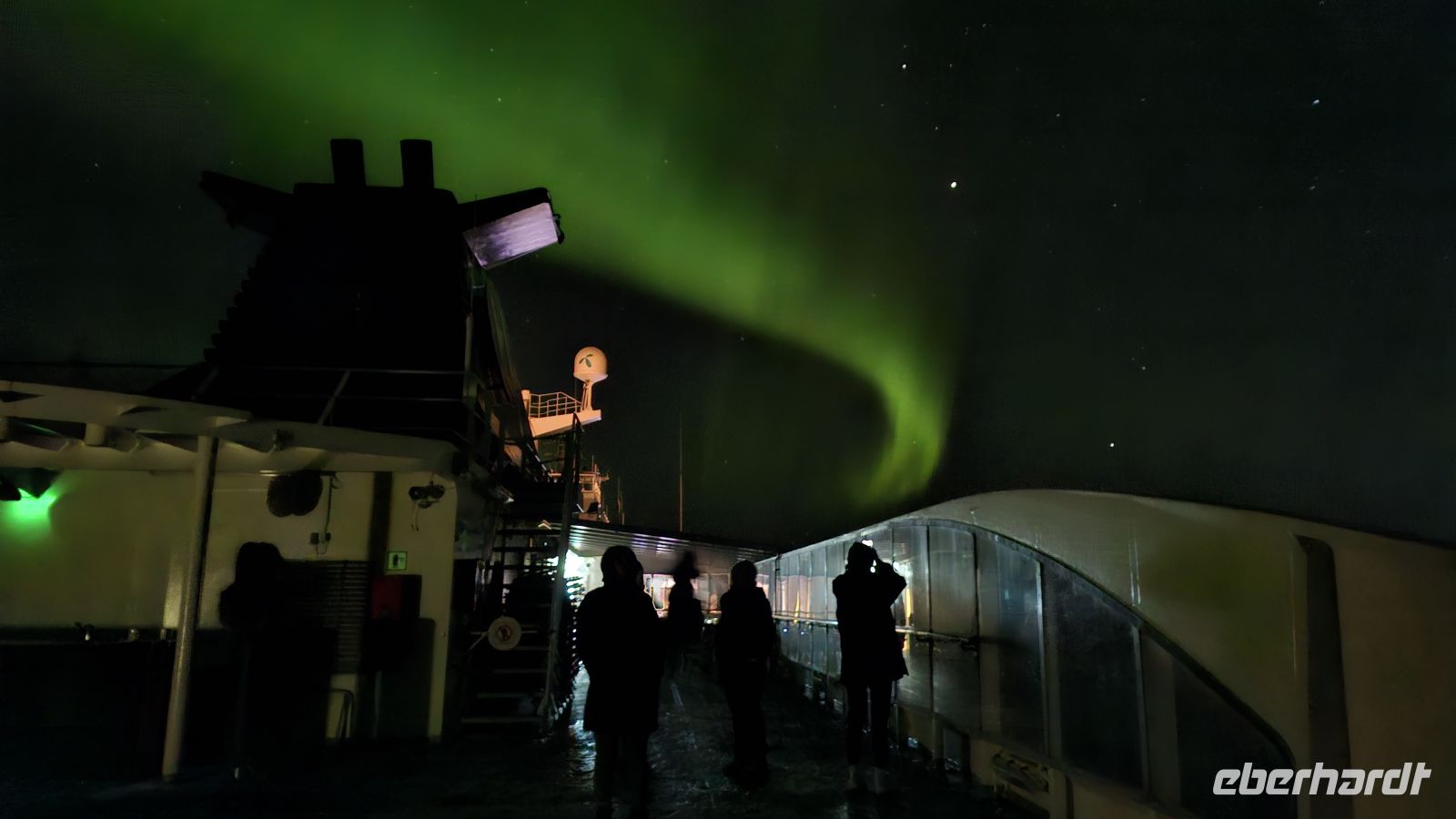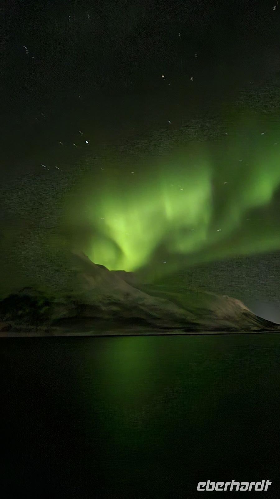 Zurück an Bord und nach dem Abendessen glaubten wir eigentlich, der Tag sei kaum noch zu toppen – aber Norwegen setzte noch einen drauf: Wir konnten Polarlichter bis tief in die Nacht bewundern. Grünliche Schleier, die sich über den Himmel zogen, mal zart, mal kräftig, mal wie ein Vorhang, mal wie tanzende Wellen. Es war schlicht atemberaubend. Wir konnten uns kaum lösen, weil wir Angst hatten, auch nur einen dieser magischen Momente zu verpassen. Irgendwann sind wir dann doch müde, aber überglücklich ins Bett gefallen – mit Nordlichtbildern im Kopf, die uns wahrscheinlich noch lange begleiten werden.