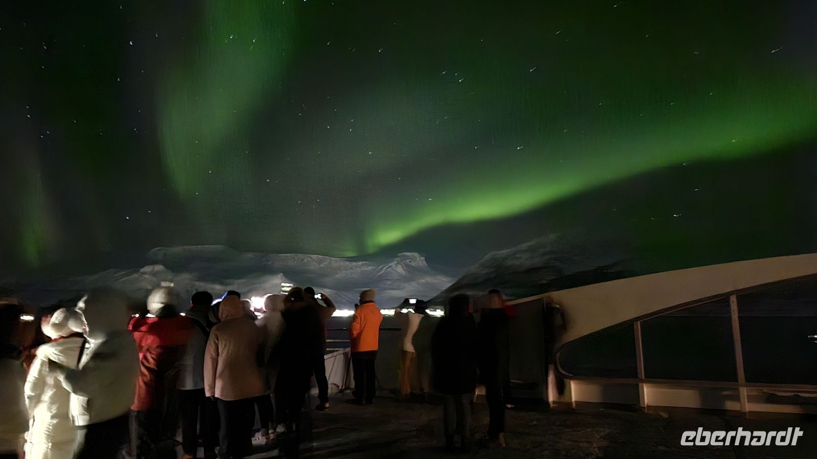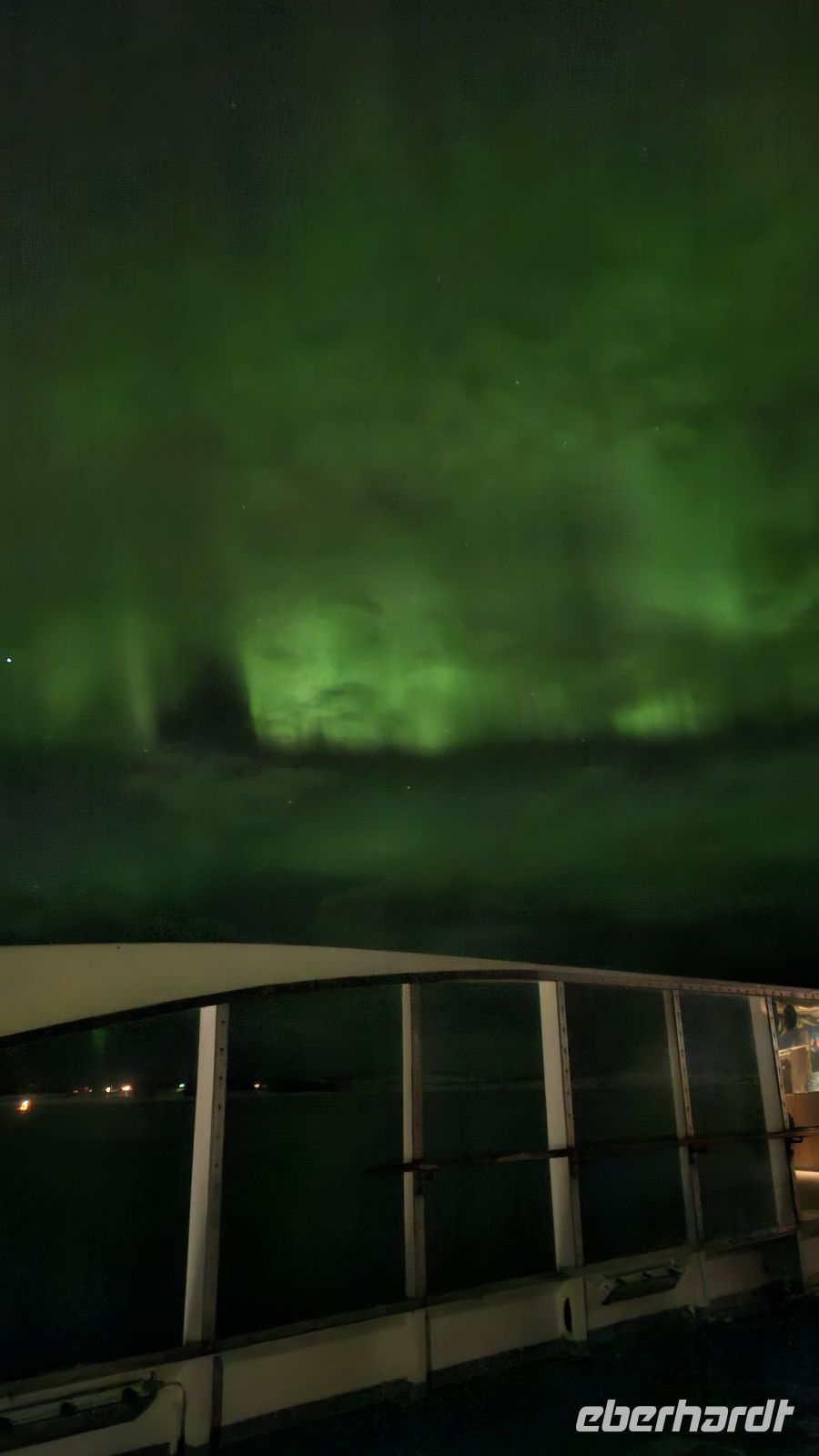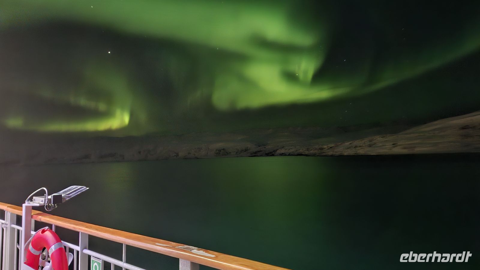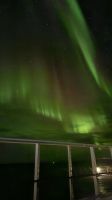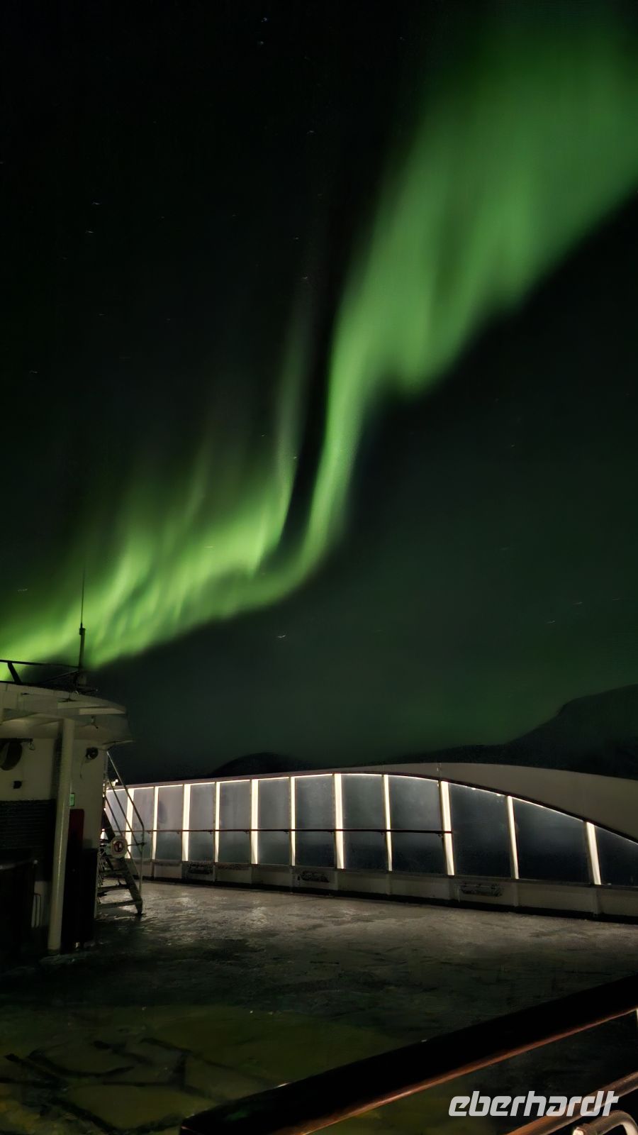 Zurück an Bord und nach dem Abendessen glaubten wir eigentlich, der Tag sei kaum noch zu toppen – aber Norwegen setzte noch einen drauf: Wir konnten Polarlichter bis tief in die Nacht bewundern. Grünliche Schleier, die sich über den Himmel zogen, mal zart, mal kräftig, mal wie ein Vorhang, mal wie tanzende Wellen. Es war schlicht atemberaubend. Wir konnten uns kaum lösen, weil wir Angst hatten, auch nur einen dieser magischen Momente zu verpassen. Irgendwann sind wir dann doch müde, aber überglücklich ins Bett gefallen – mit Nordlichtbildern im Kopf, die uns wahrscheinlich noch lange begleiten werden.