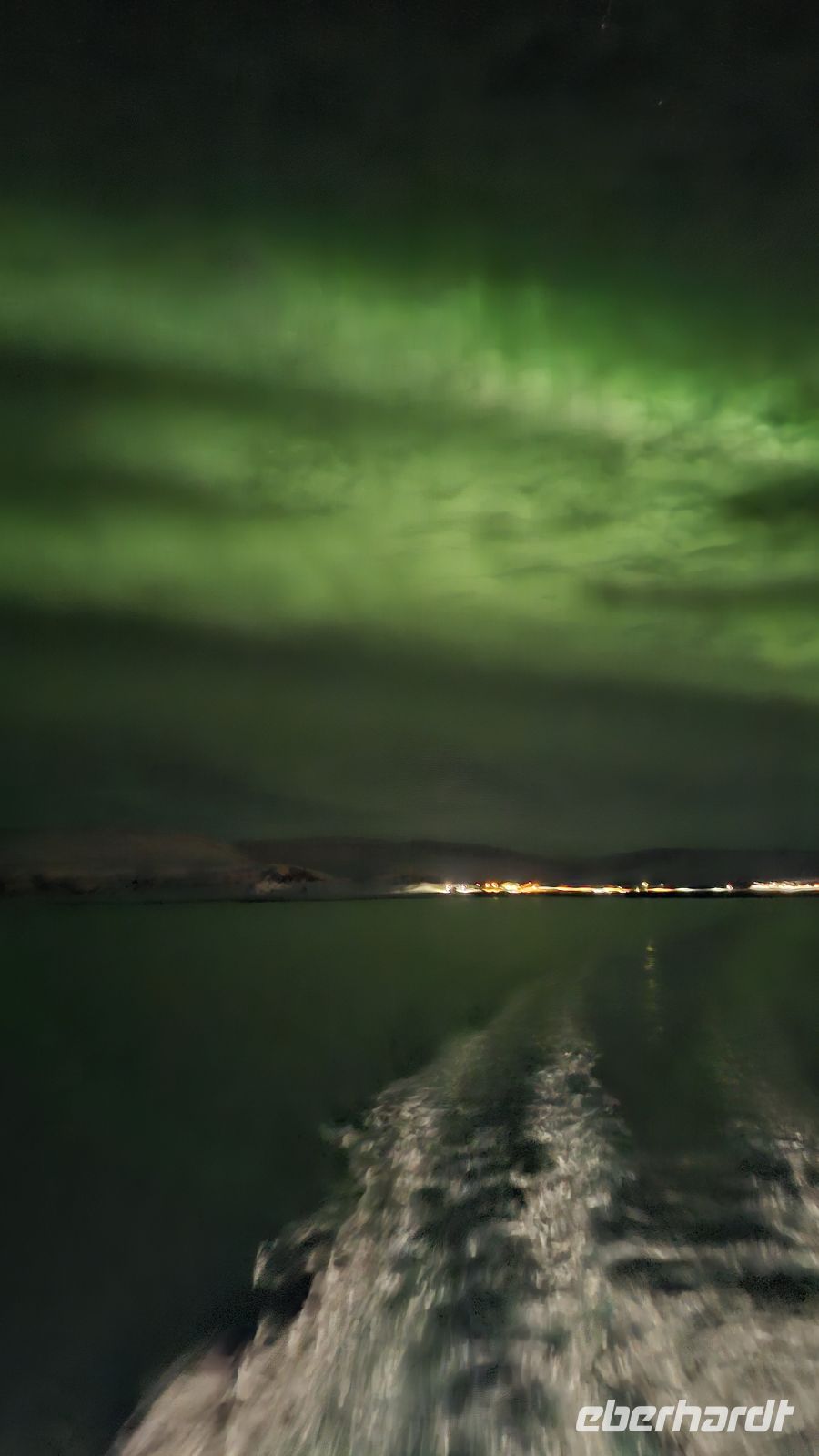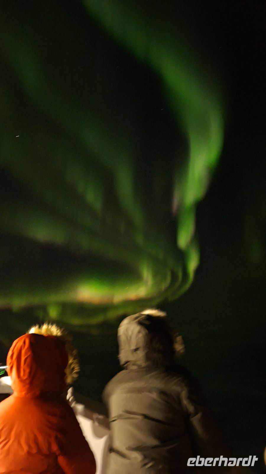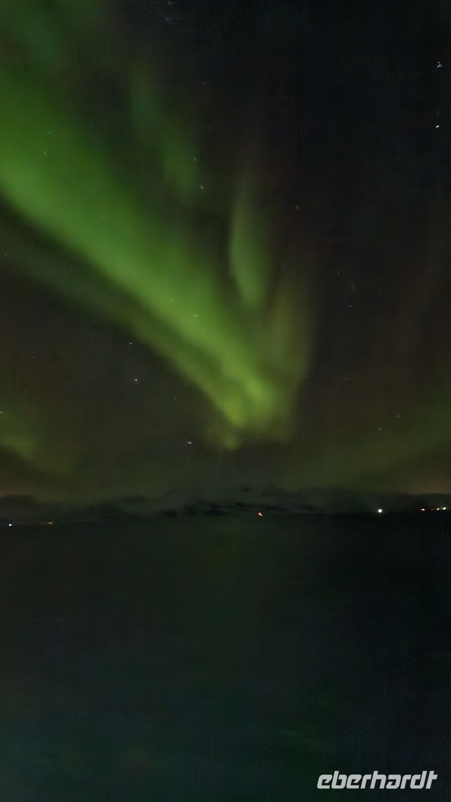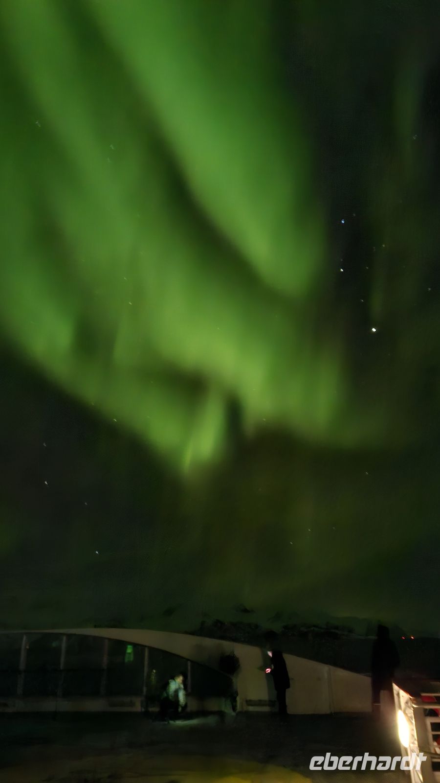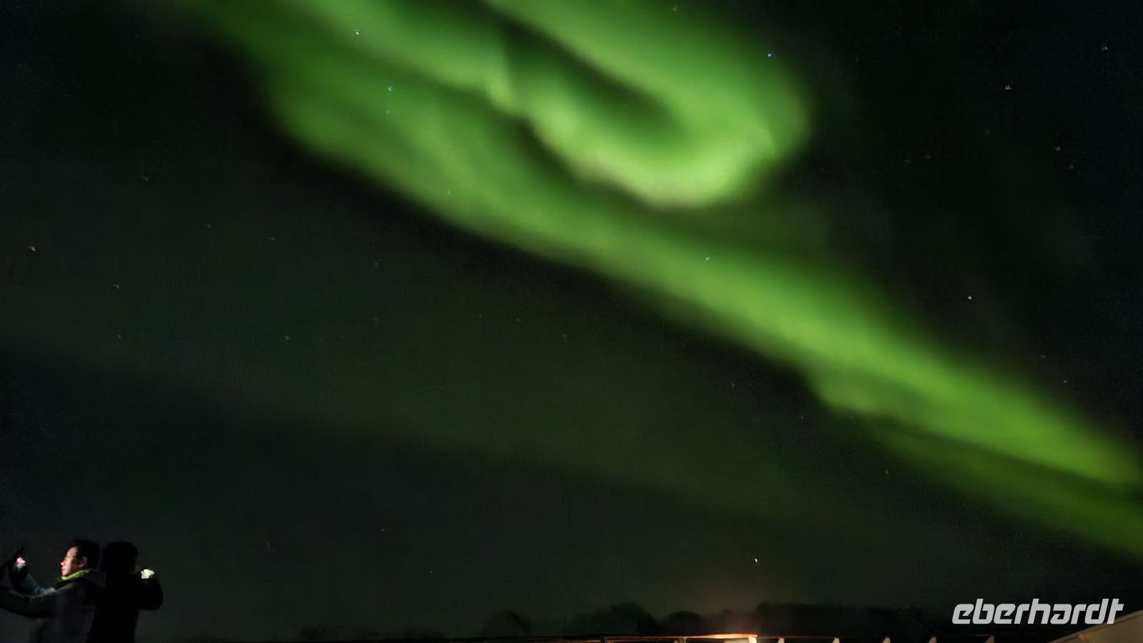 Zurück an Bord und nach dem Abendessen glaubten wir eigentlich, der Tag sei kaum noch zu toppen – aber Norwegen setzte noch einen drauf: Wir konnten Polarlichter bis tief in die Nacht bewundern. Grünliche Schleier, die sich über den Himmel zogen, mal zart, mal kräftig, mal wie ein Vorhang, mal wie tanzende Wellen. Es war schlicht atemberaubend. Wir konnten uns kaum lösen, weil wir Angst hatten, auch nur einen dieser magischen Momente zu verpassen. Irgendwann sind wir dann doch müde, aber überglücklich ins Bett gefallen – mit Nordlichtbildern im Kopf, die uns wahrscheinlich noch lange begleiten werden.