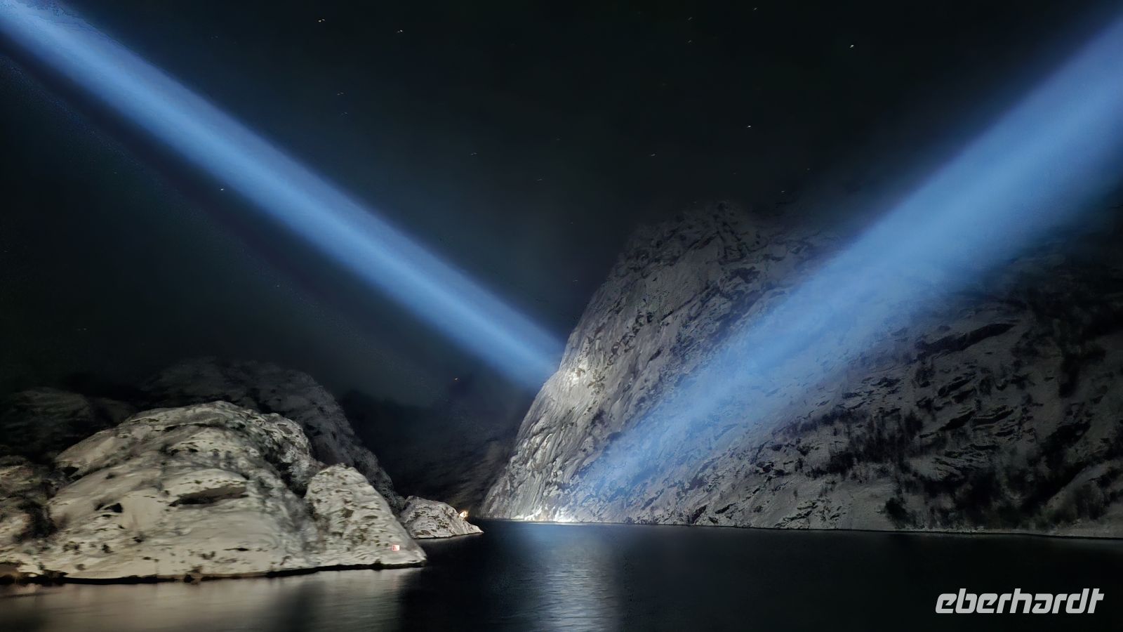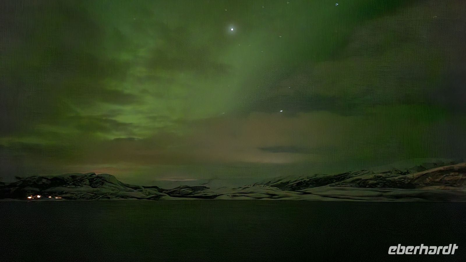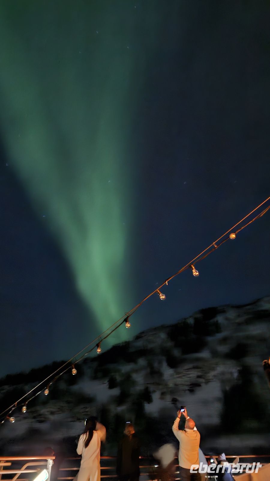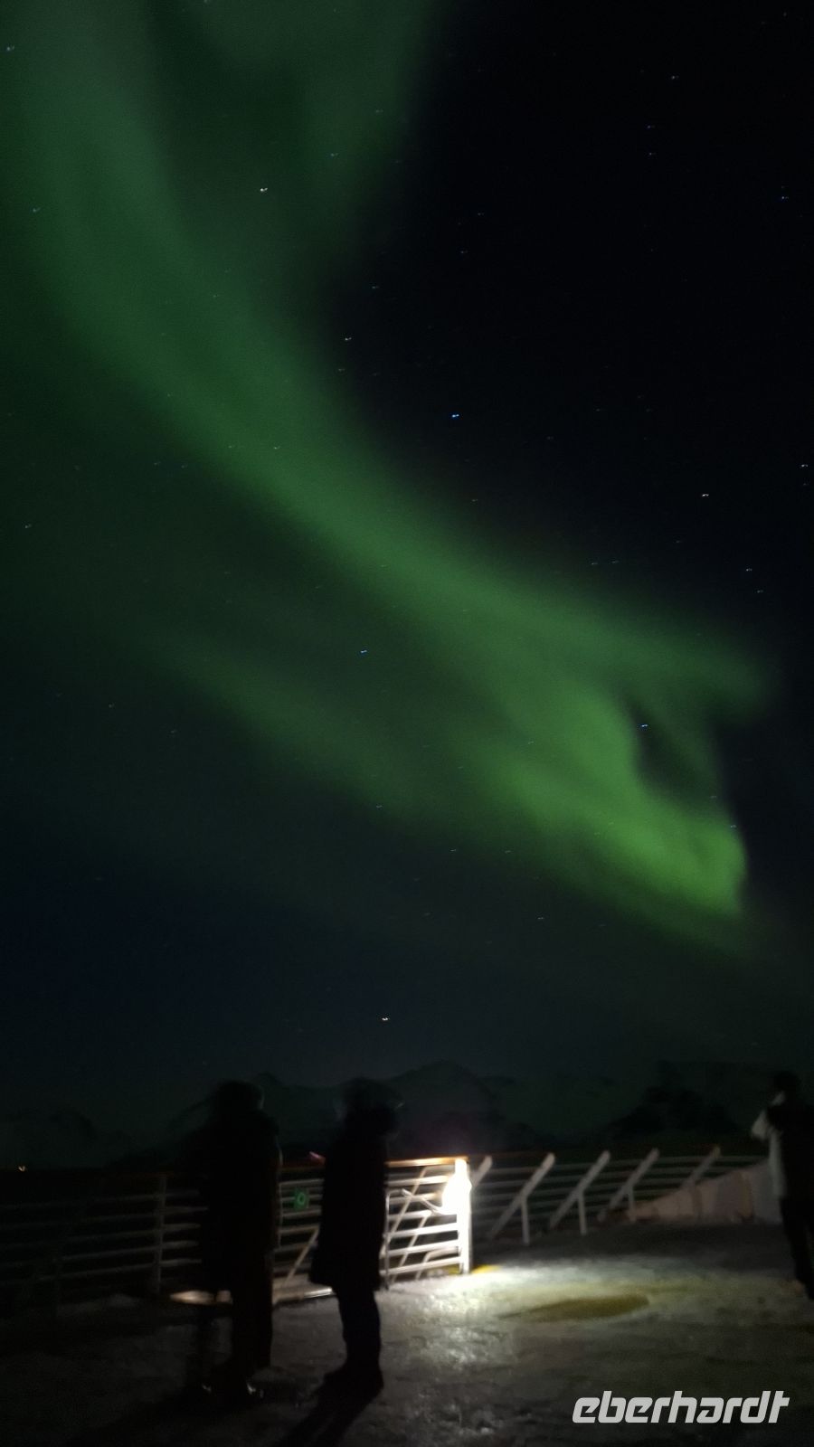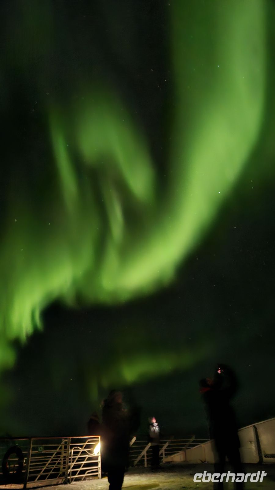 Zurück an Bord und nach dem Abendessen glaubten wir eigentlich, der Tag sei kaum noch zu toppen – aber Norwegen setzte noch einen drauf: Wir konnten Polarlichter bis tief in die Nacht bewundern. Grünliche Schleier, die sich über den Himmel zogen, mal zart, mal kräftig, mal wie ein Vorhang, mal wie tanzende Wellen. Es war schlicht atemberaubend. Wir konnten uns kaum lösen, weil wir Angst hatten, auch nur einen dieser magischen Momente zu verpassen. Irgendwann sind wir dann doch müde, aber überglücklich ins Bett gefallen – mit Nordlichtbildern im Kopf, die uns wahrscheinlich noch lange begleiten werden.