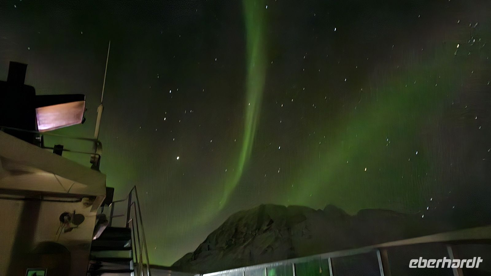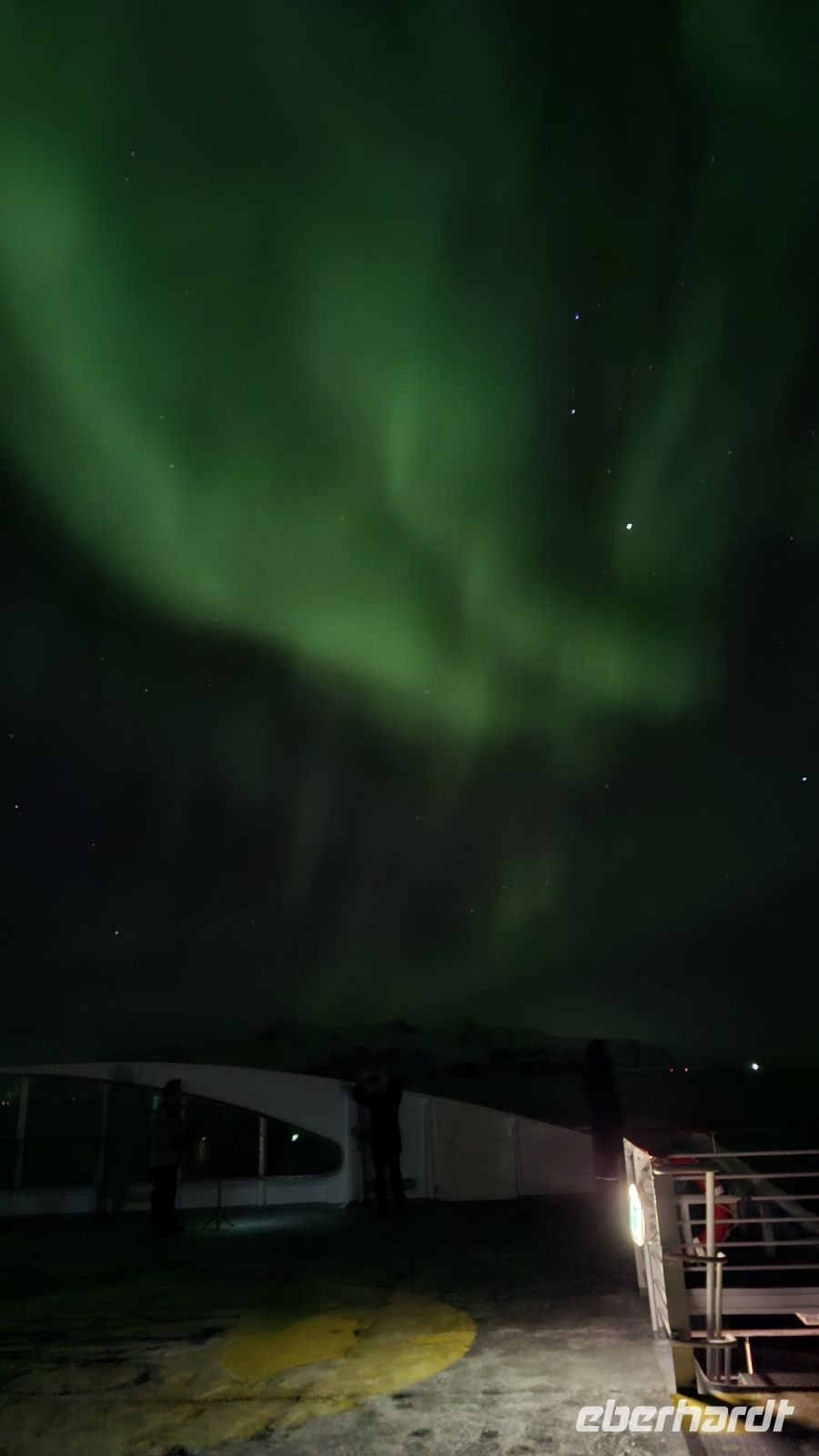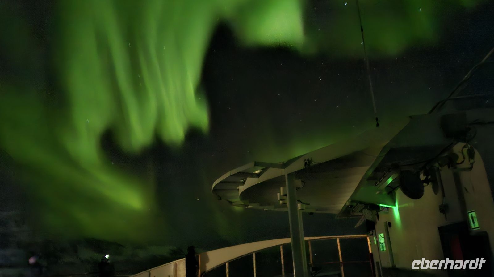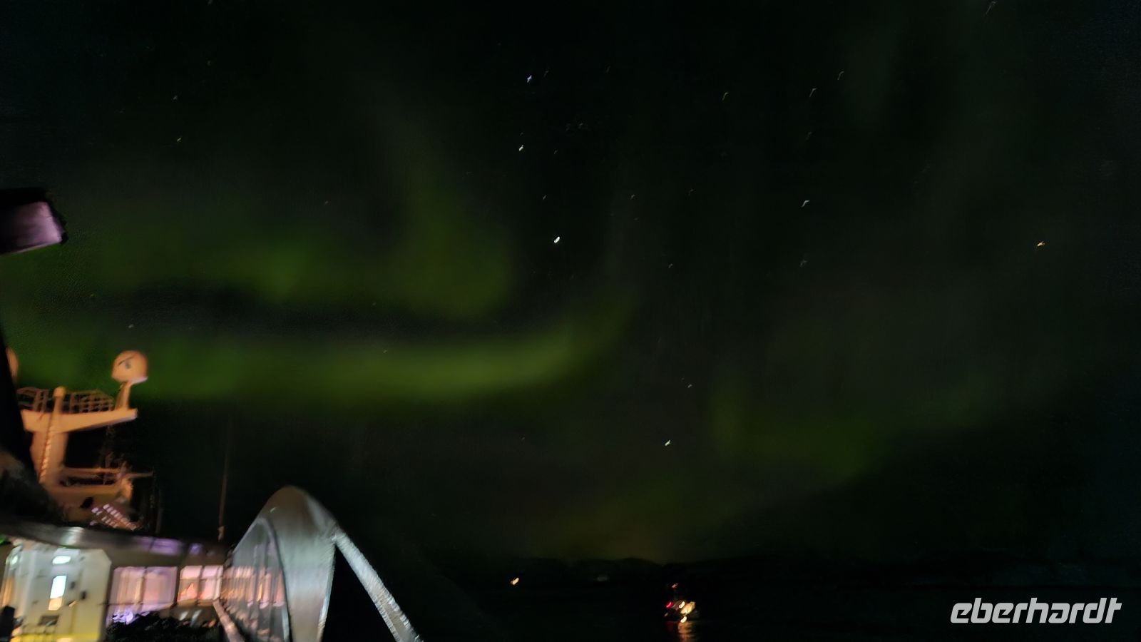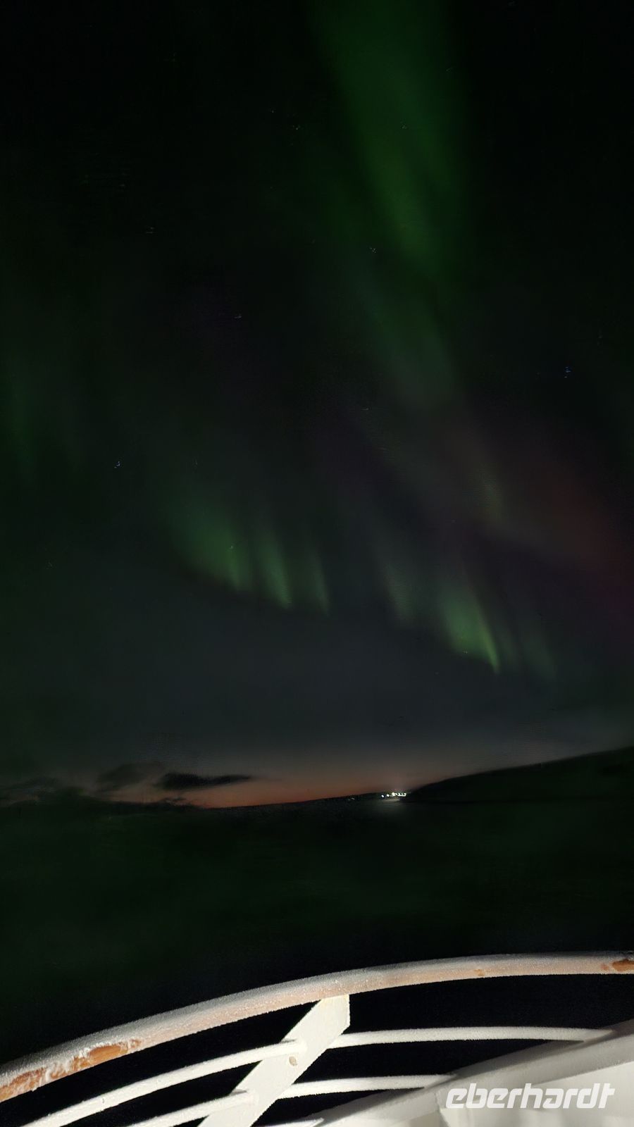 Und dann waren sie wieder da: die Polarlichter! Dieses Mal so prächtig und intensiv wie noch an keinem Tag zuvor. Grün leuchtende Bögen, die sich über den Himmel spannten, Wellen, die tanzten und immer wieder ihre Form wechselten. Wir standen staunend am Heck, froren ein wenig, aber das war in dem Moment völlig egal. Es war sogar so hell und kräftig, dass man die Nordlichter filmen konnte – ein echtes Geschenk, denn normalerweise lassen sie sich ja nur schwer so einfangen.