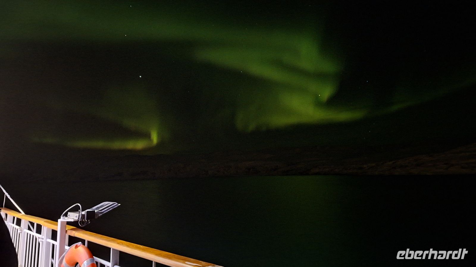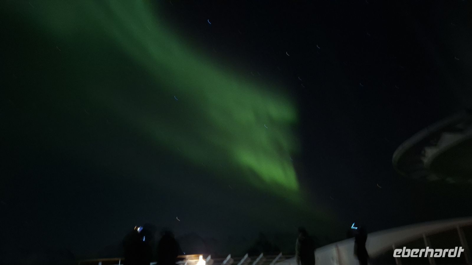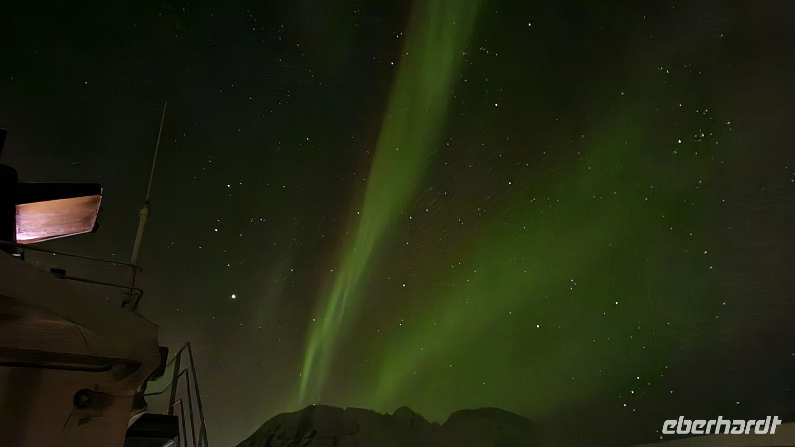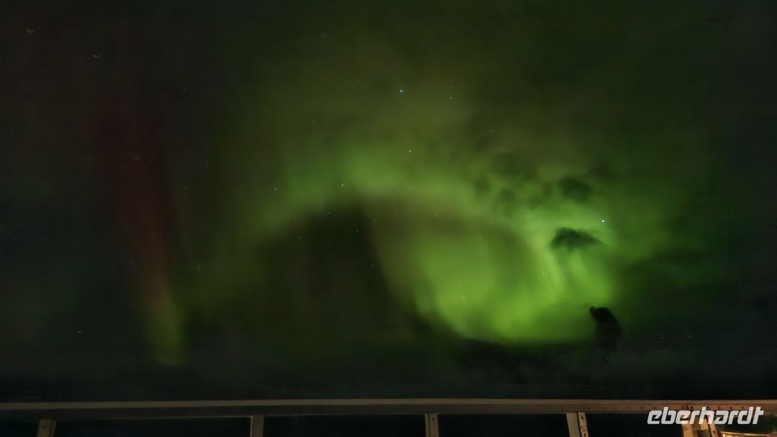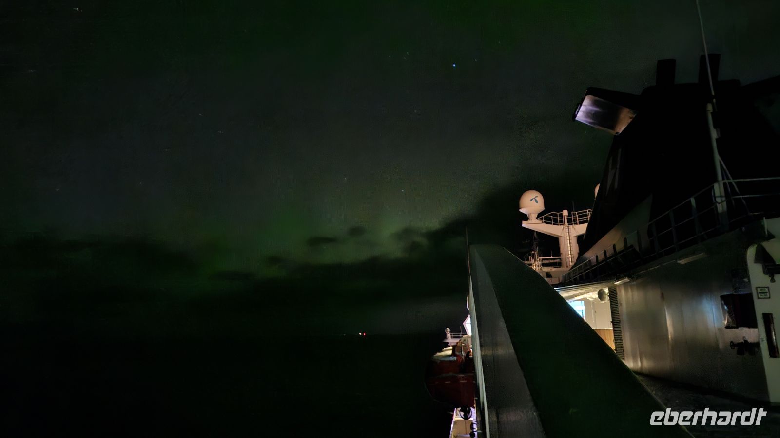 Und dann waren sie wieder da: die Polarlichter! Dieses Mal so prächtig und intensiv wie noch an keinem Tag zuvor. Grün leuchtende Bögen, die sich über den Himmel spannten, Wellen, die tanzten und immer wieder ihre Form wechselten. Wir standen staunend am Heck, froren ein wenig, aber das war in dem Moment völlig egal. Es war sogar so hell und kräftig, dass man die Nordlichter filmen konnte – ein echtes Geschenk, denn normalerweise lassen sie sich ja nur schwer so einfangen.