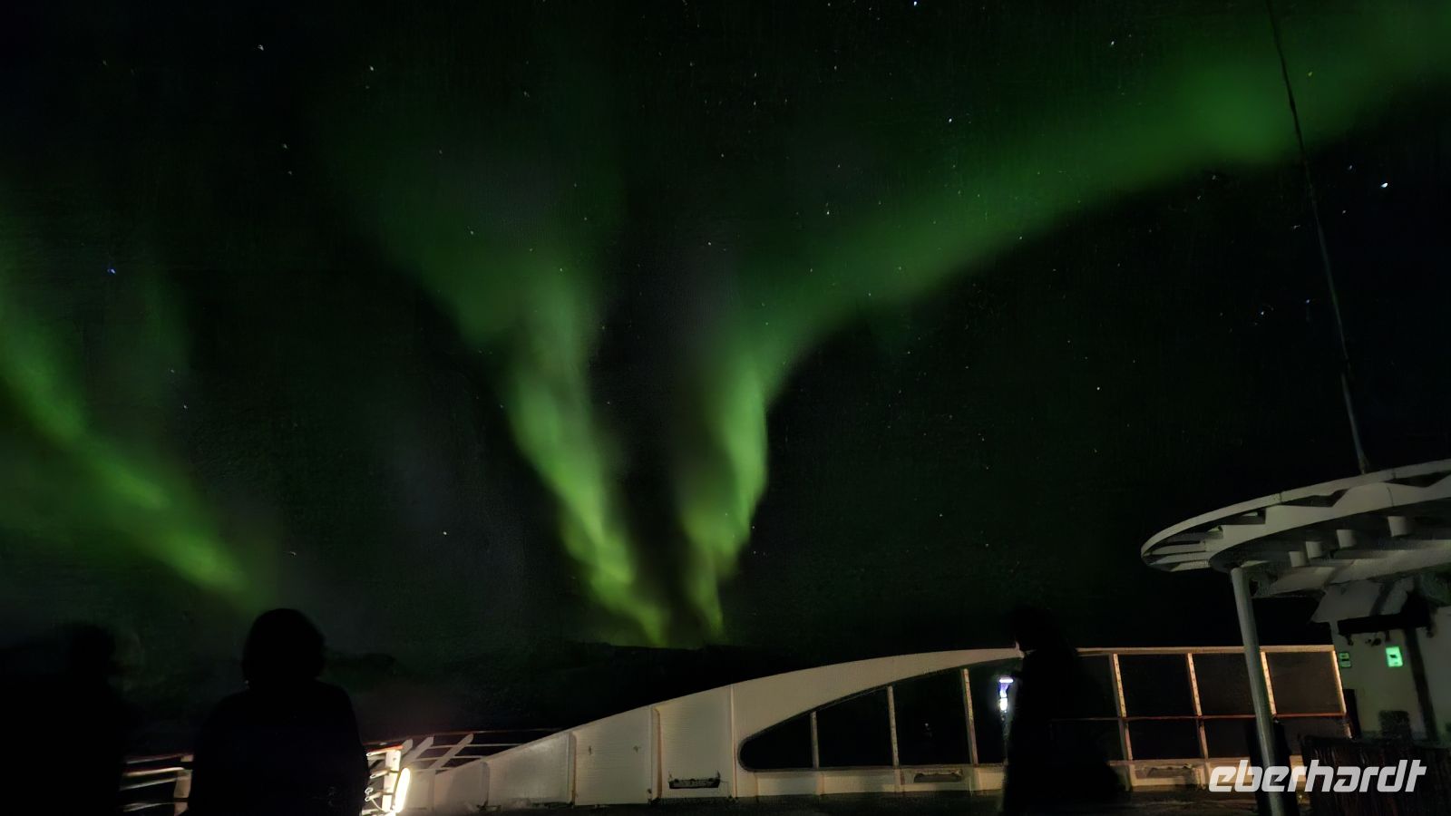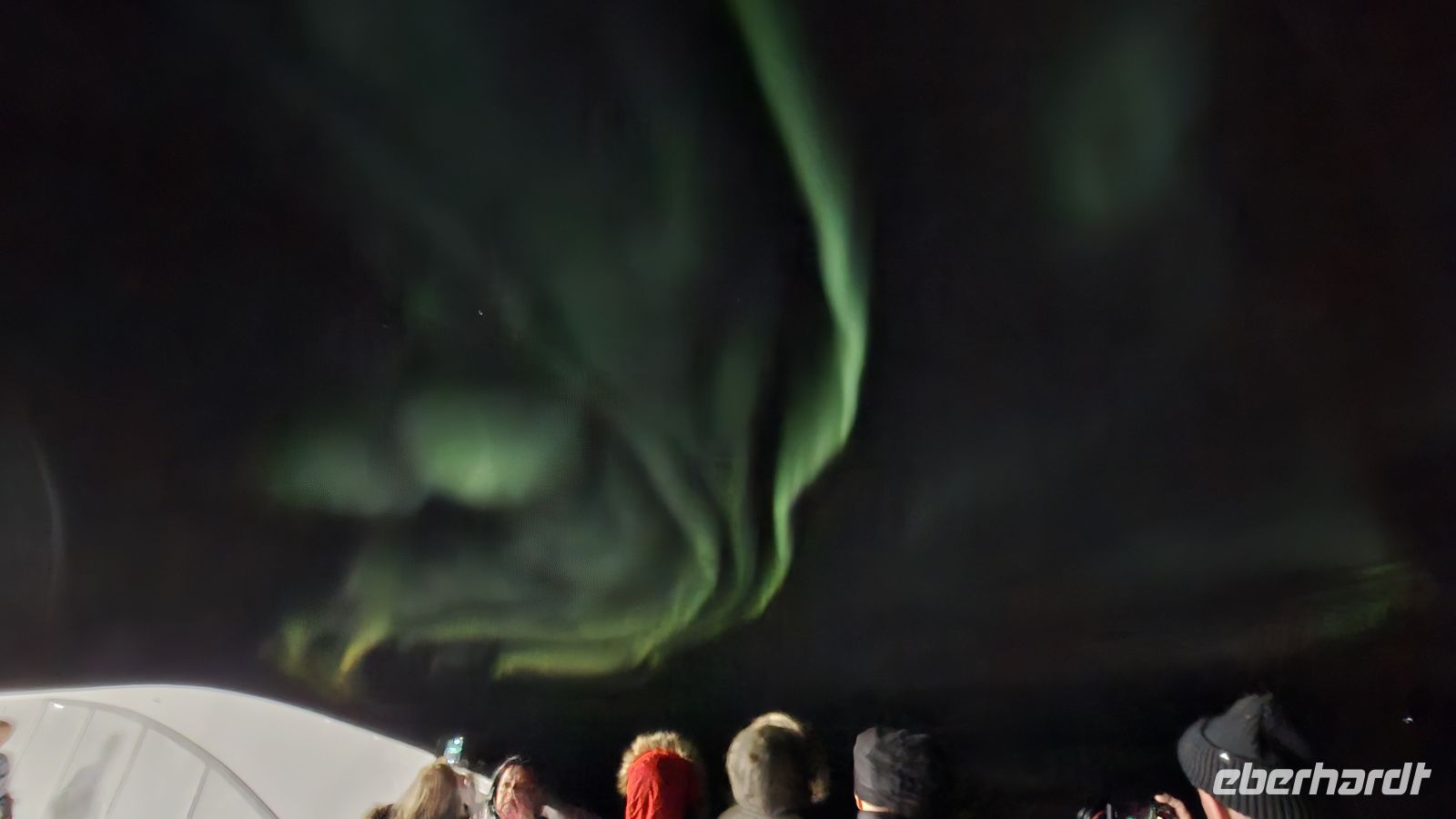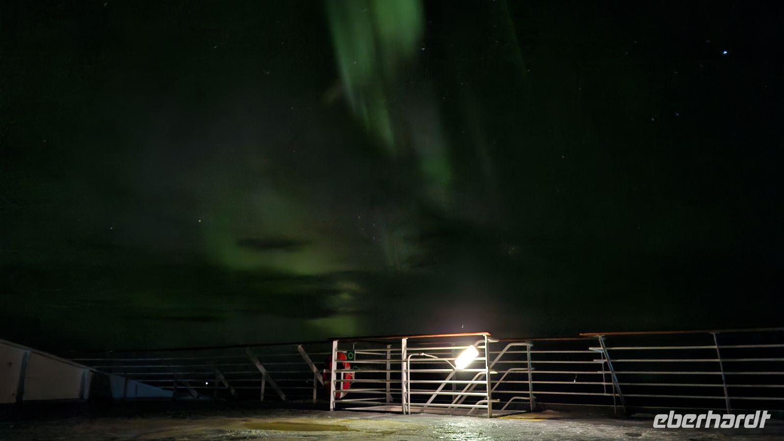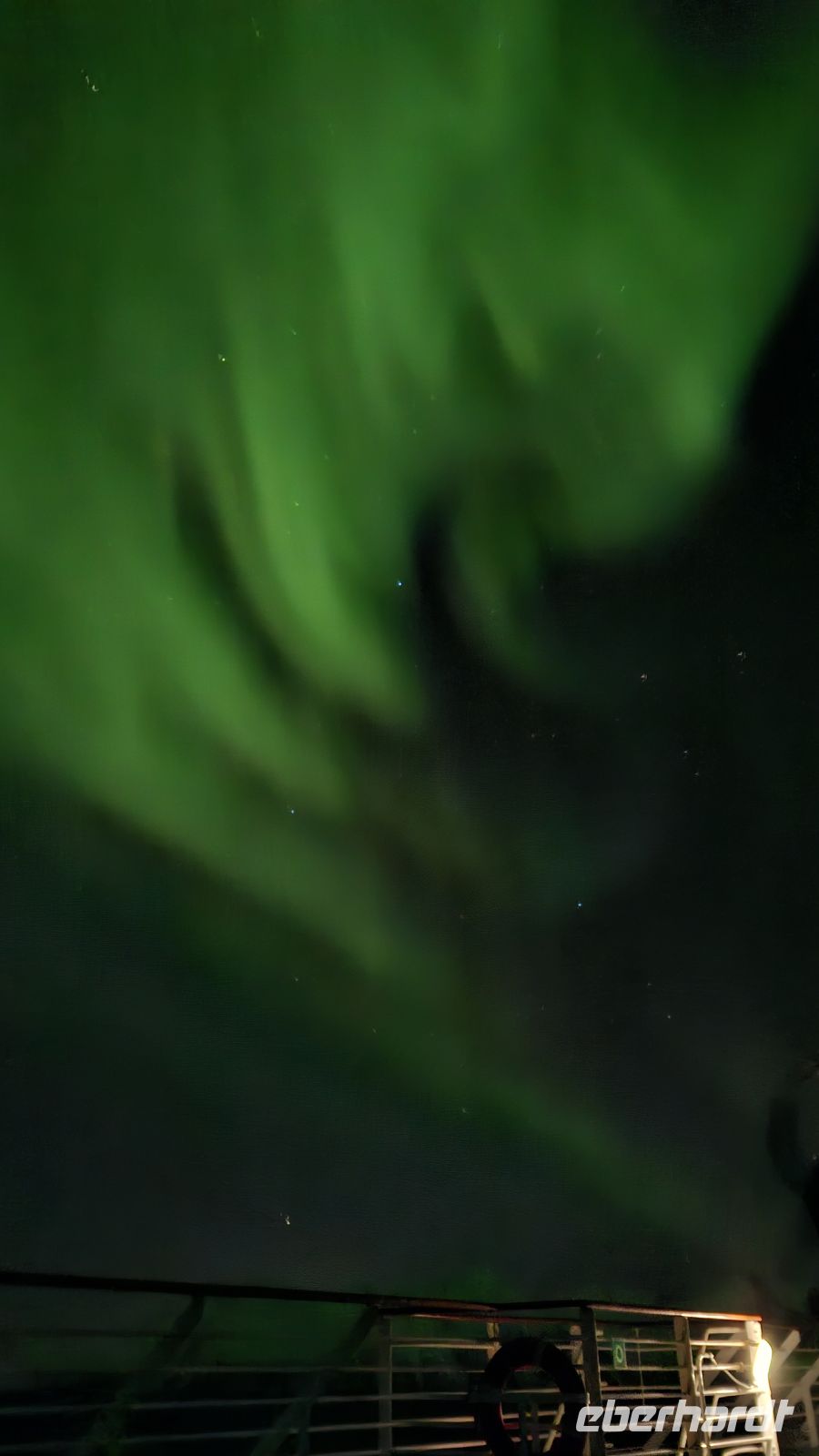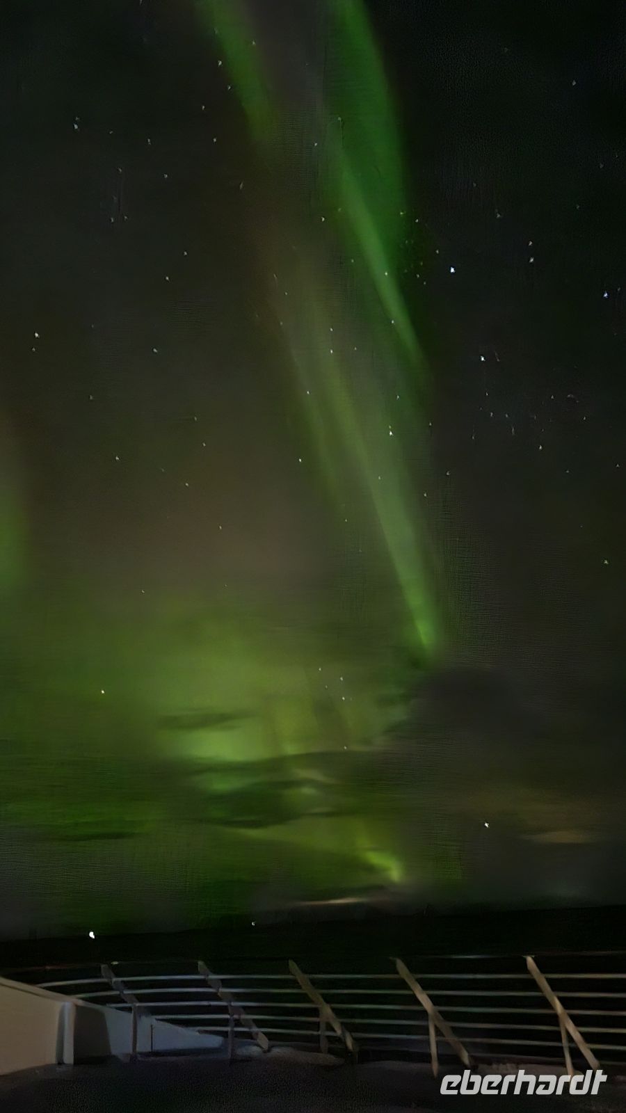 Und dann waren sie wieder da: die Polarlichter! Dieses Mal so prächtig und intensiv wie noch an keinem Tag zuvor. Grün leuchtende Bögen, die sich über den Himmel spannten, Wellen, die tanzten und immer wieder ihre Form wechselten. Wir standen staunend am Heck, froren ein wenig, aber das war in dem Moment völlig egal. Es war sogar so hell und kräftig, dass man die Nordlichter filmen konnte – ein echtes Geschenk, denn normalerweise lassen sie sich ja nur schwer so einfangen.