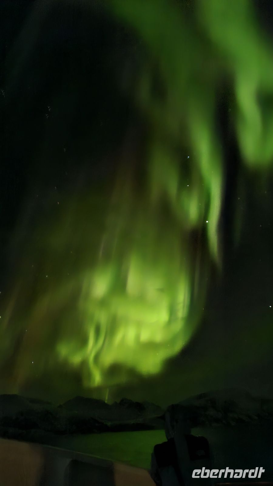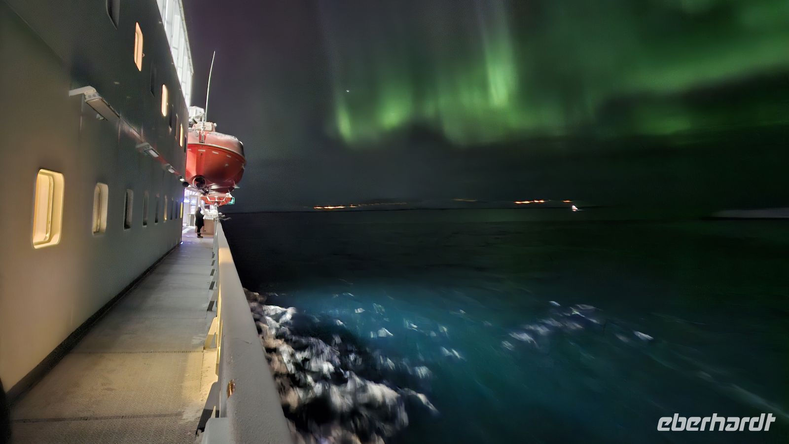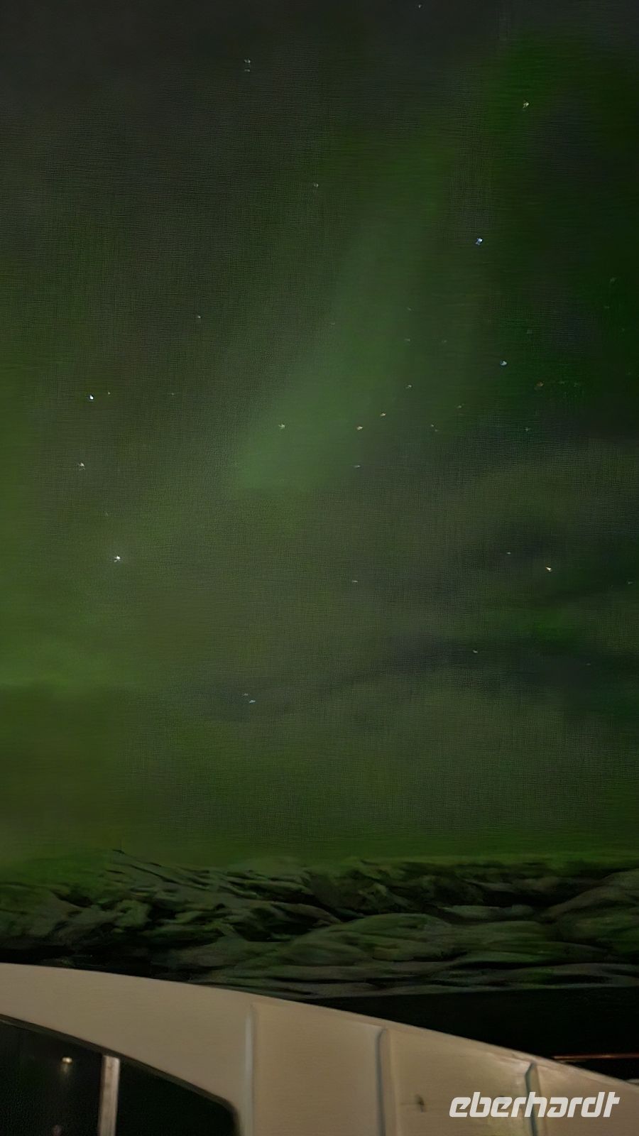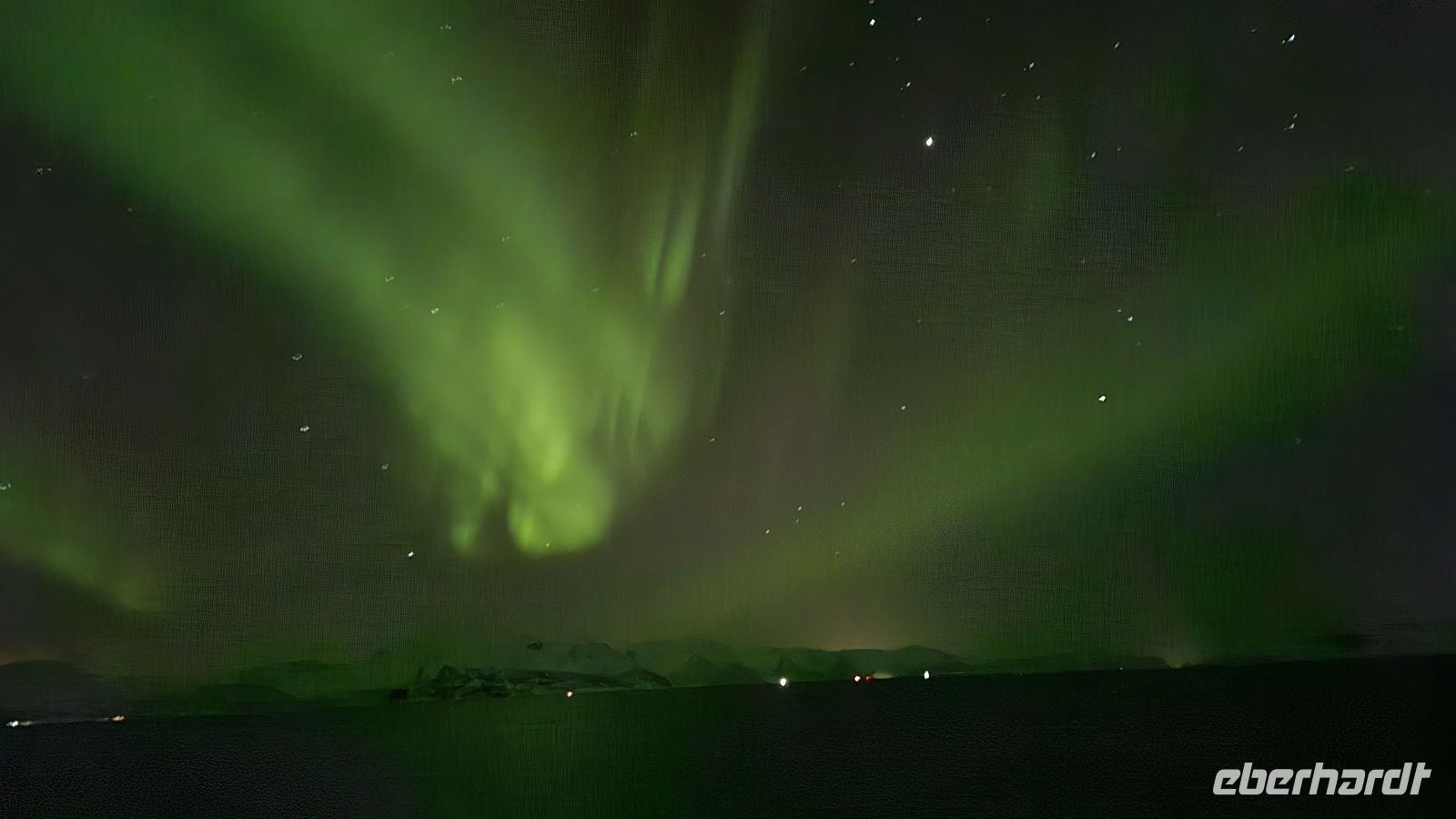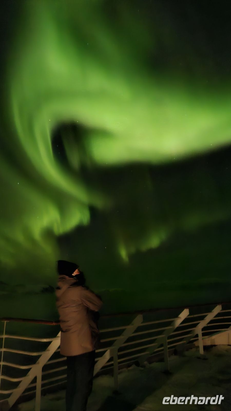 Und dann waren sie wieder da: die Polarlichter! Dieses Mal so prächtig und intensiv wie noch an keinem Tag zuvor. Grün leuchtende Bögen, die sich über den Himmel spannten, Wellen, die tanzten und immer wieder ihre Form wechselten. Wir standen staunend am Heck, froren ein wenig, aber das war in dem Moment völlig egal. Es war sogar so hell und kräftig, dass man die Nordlichter filmen konnte – ein echtes Geschenk, denn normalerweise lassen sie sich ja nur schwer so einfangen.