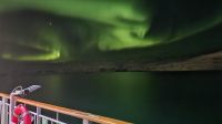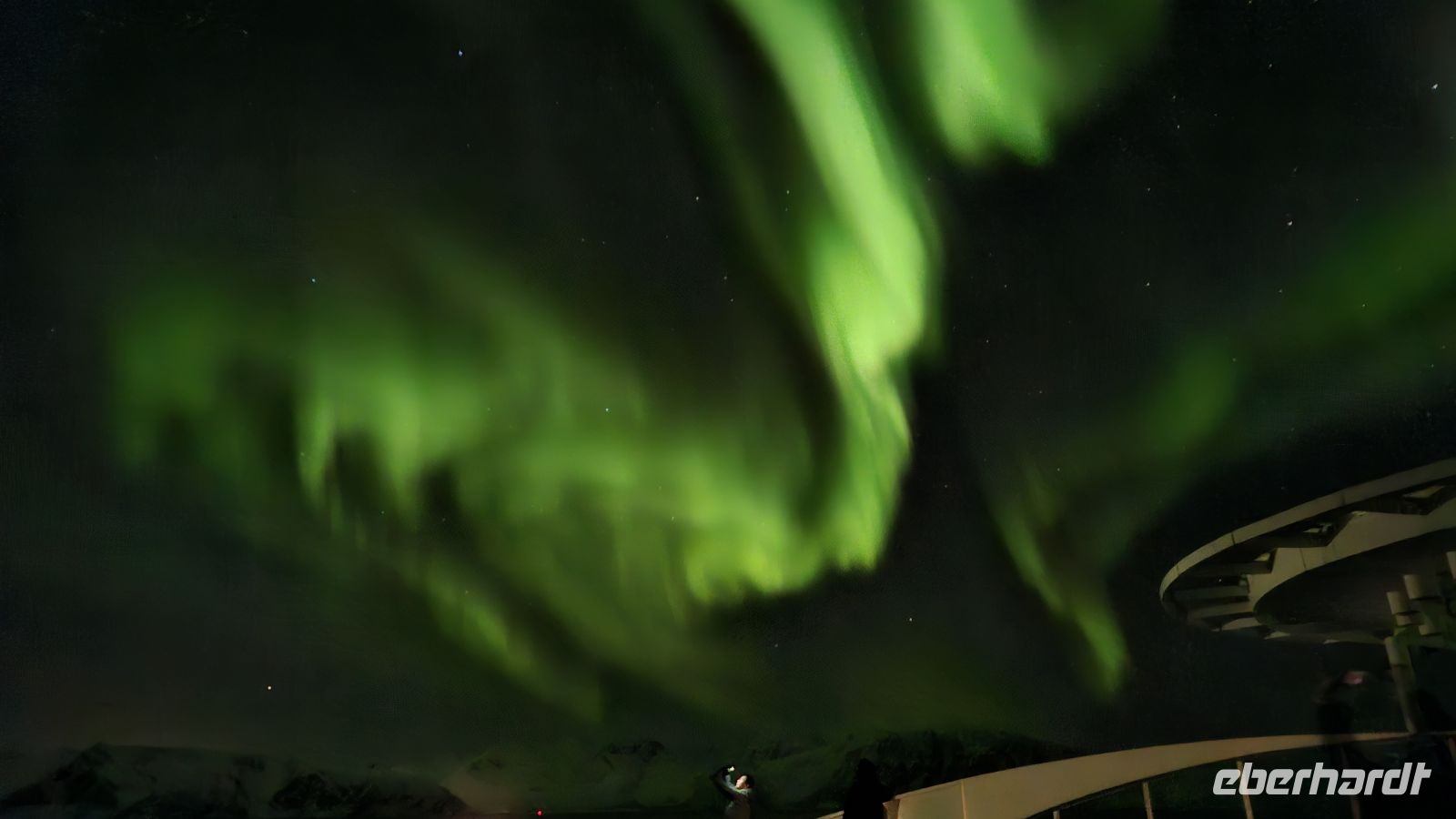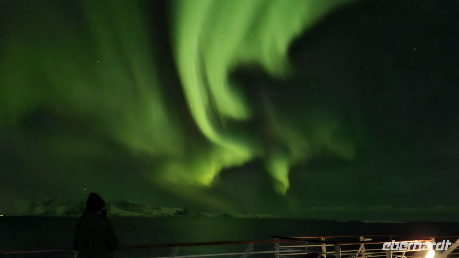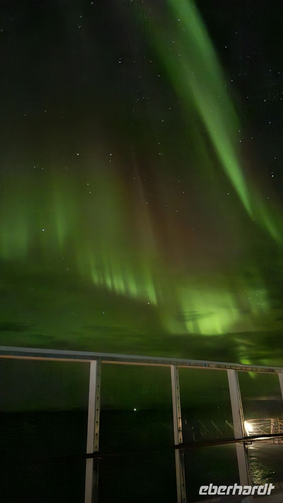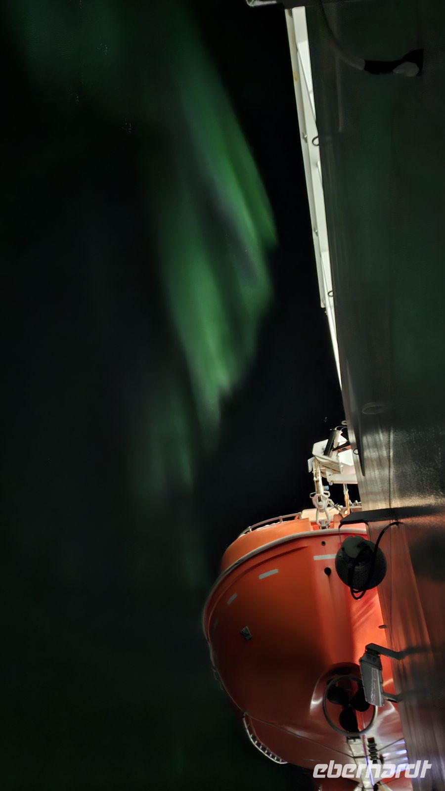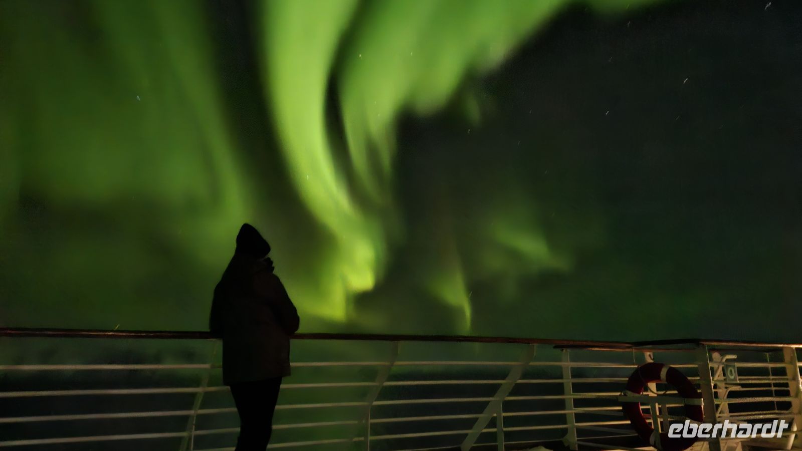 Und dann waren sie wieder da: die Polarlichter! Dieses Mal so prächtig und intensiv wie noch an keinem Tag zuvor. Grün leuchtende Bögen, die sich über den Himmel spannten, Wellen, die tanzten und immer wieder ihre Form wechselten. Wir standen staunend am Heck, froren ein wenig, aber das war in dem Moment völlig egal. Es war sogar so hell und kräftig, dass man die Nordlichter filmen konnte – ein echtes Geschenk, denn normalerweise lassen sie sich ja nur schwer so einfangen.