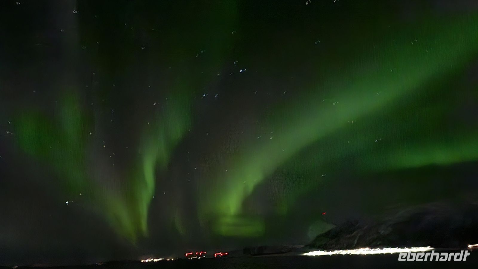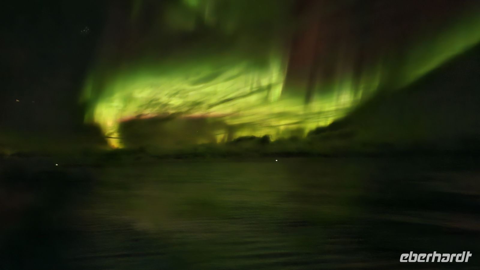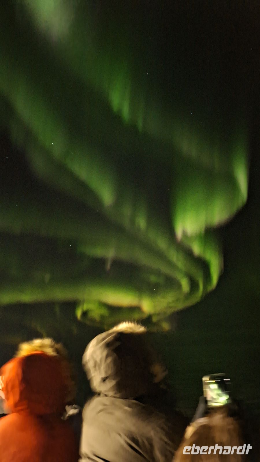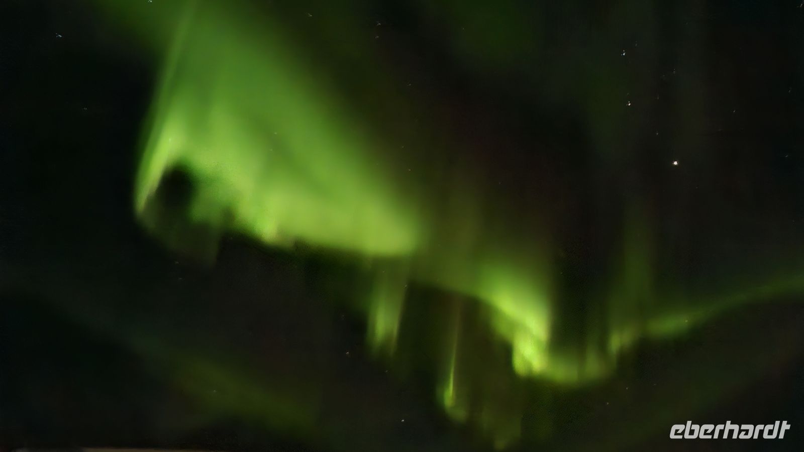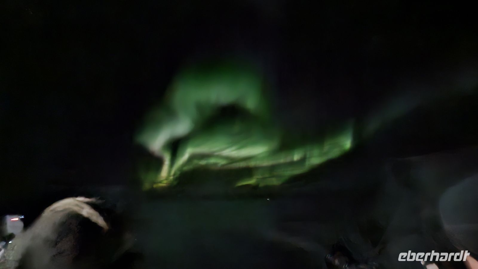 Und dann waren sie wieder da: die Polarlichter! Dieses Mal so prächtig und intensiv wie noch an keinem Tag zuvor. Grün leuchtende Bögen, die sich über den Himmel spannten, Wellen, die tanzten und immer wieder ihre Form wechselten. Wir standen staunend am Heck, froren ein wenig, aber das war in dem Moment völlig egal. Es war sogar so hell und kräftig, dass man die Nordlichter filmen konnte – ein echtes Geschenk, denn normalerweise lassen sie sich ja nur schwer so einfangen.