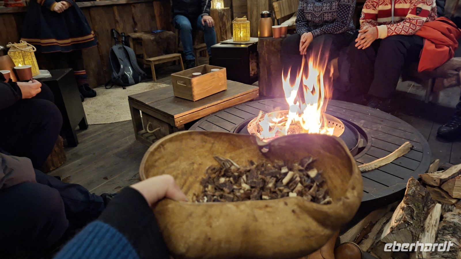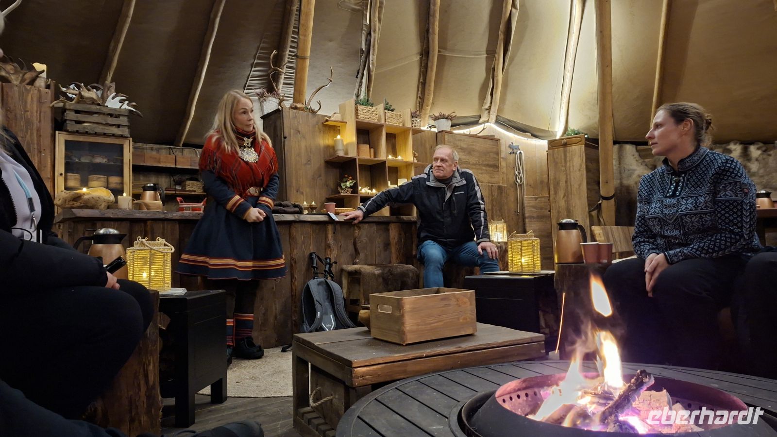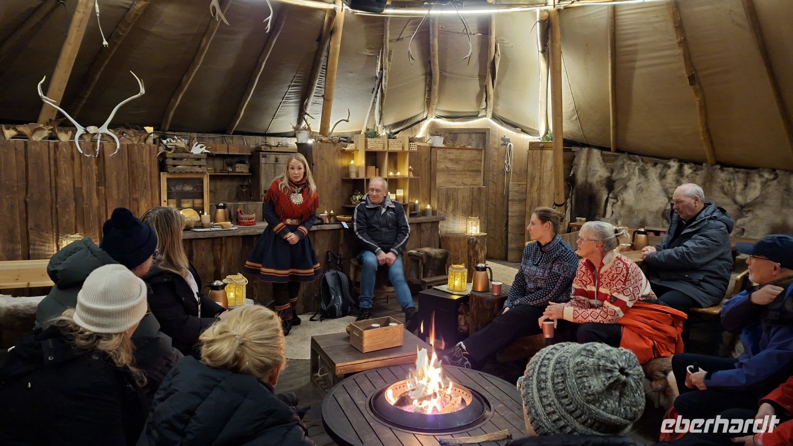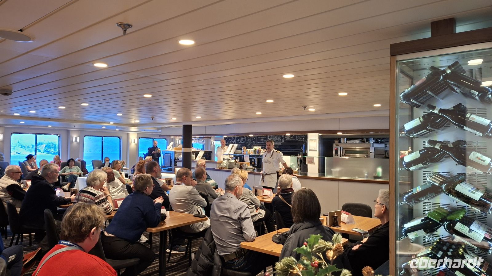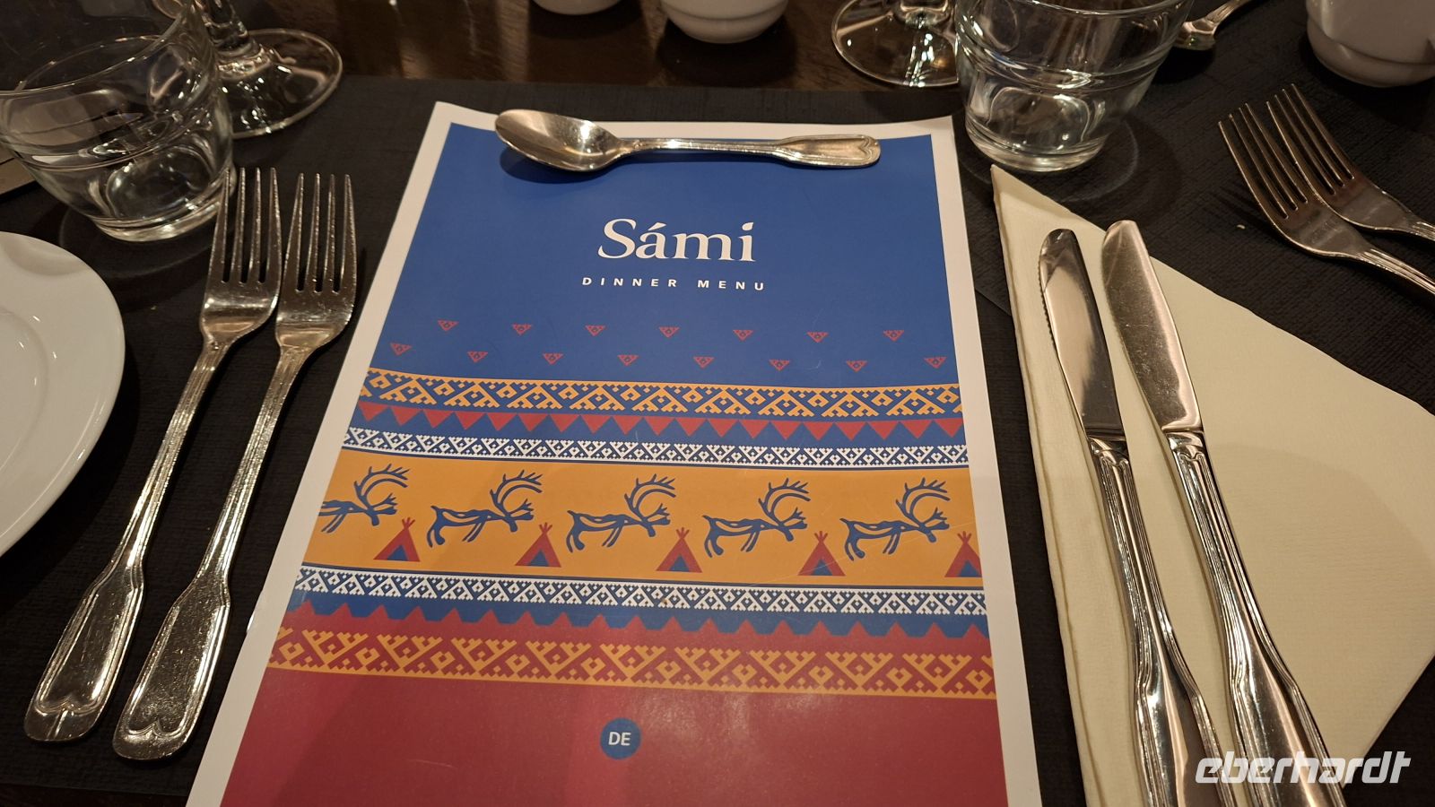 Danach war Zeit zum Genießen: in der Lounge sitzen, einen Tee oder Kaffee trinken, hinausschauen in die dunkle, schneeverhangene Landschaft, vielleicht ein bisschen lesen oder einfach nur dösen. Währenddessen merkten wir, dass der Seegang spürbar rauer wurde – das Schiff hob und senkte sich sanft, manchmal ein wenig kräftiger, sodass wir beim Aufstehen automatisch nach der Stuhllehne griffen. Später trafen wir wie gewohnt das Expeditionsteam und freuten uns besonders auf das Sami-Abendessen. Es gab typische Spezialitäten aus der Küche der Sami, und wir lernten wieder ein kleines Stück mehr über die Kultur des indigenen Volkes des Nordens – mit vielen Eindrücken für Augen, Ohren und Gaumen.