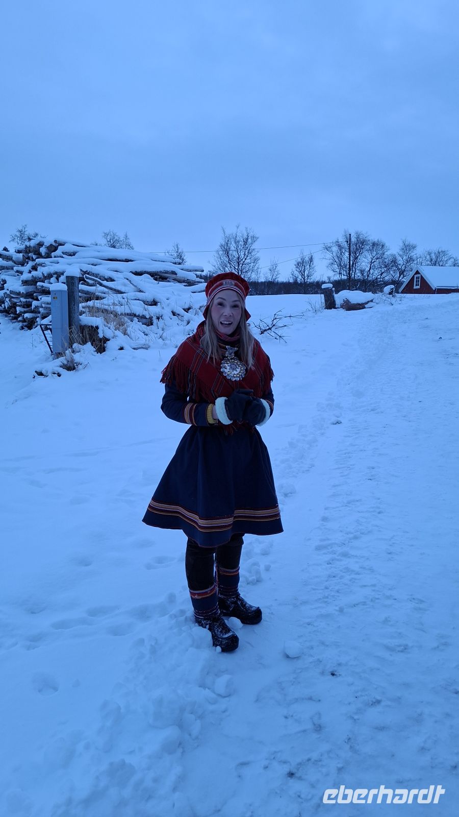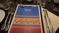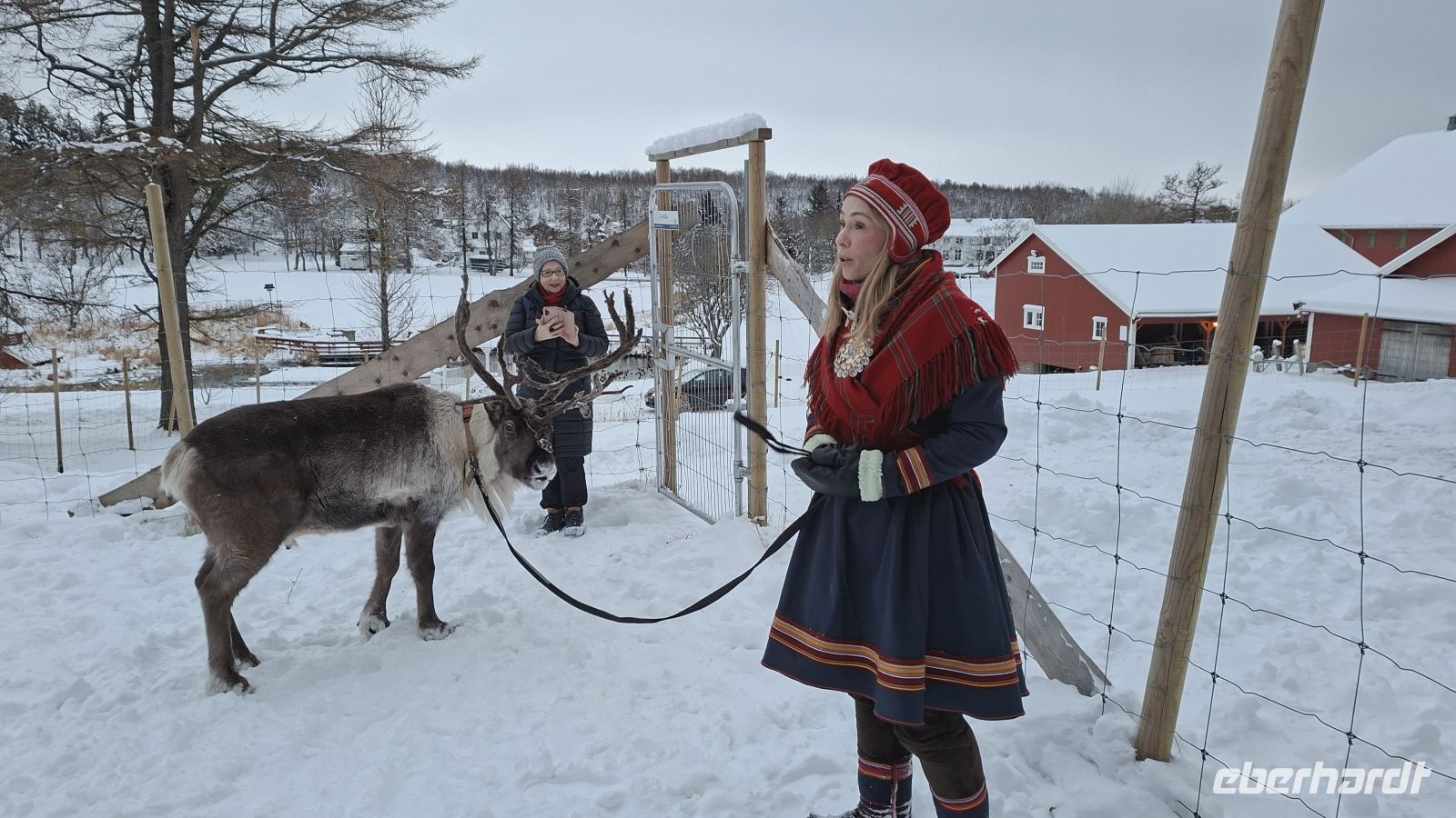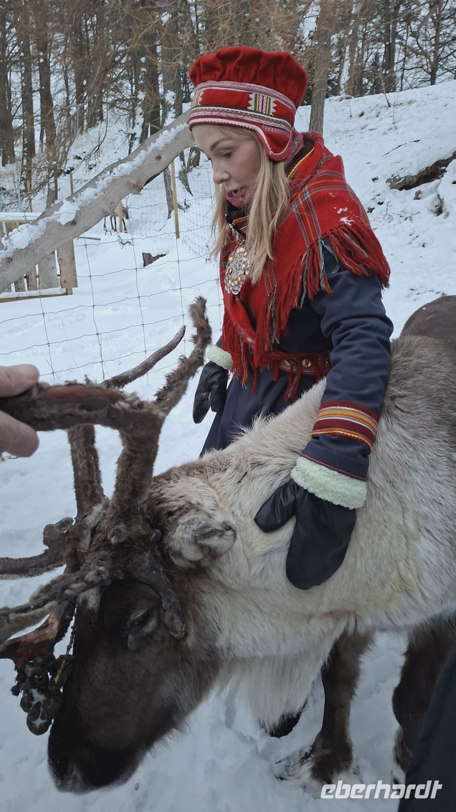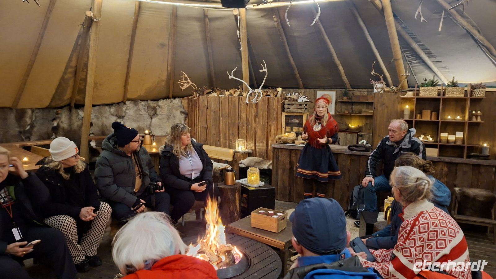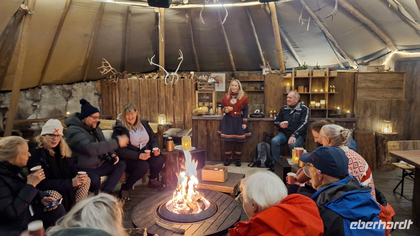 Danach war Zeit zum Genießen: in der Lounge sitzen, einen Tee oder Kaffee trinken, hinausschauen in die dunkle, schneeverhangene Landschaft, vielleicht ein bisschen lesen oder einfach nur dösen. Währenddessen merkten wir, dass der Seegang spürbar rauer wurde – das Schiff hob und senkte sich sanft, manchmal ein wenig kräftiger, sodass wir beim Aufstehen automatisch nach der Stuhllehne griffen. Später trafen wir wie gewohnt das Expeditionsteam und freuten uns besonders auf das Sami-Abendessen. Es gab typische Spezialitäten aus der Küche der Sami, und wir lernten wieder ein kleines Stück mehr über die Kultur des indigenen Volkes des Nordens – mit vielen Eindrücken für Augen, Ohren und Gaumen.