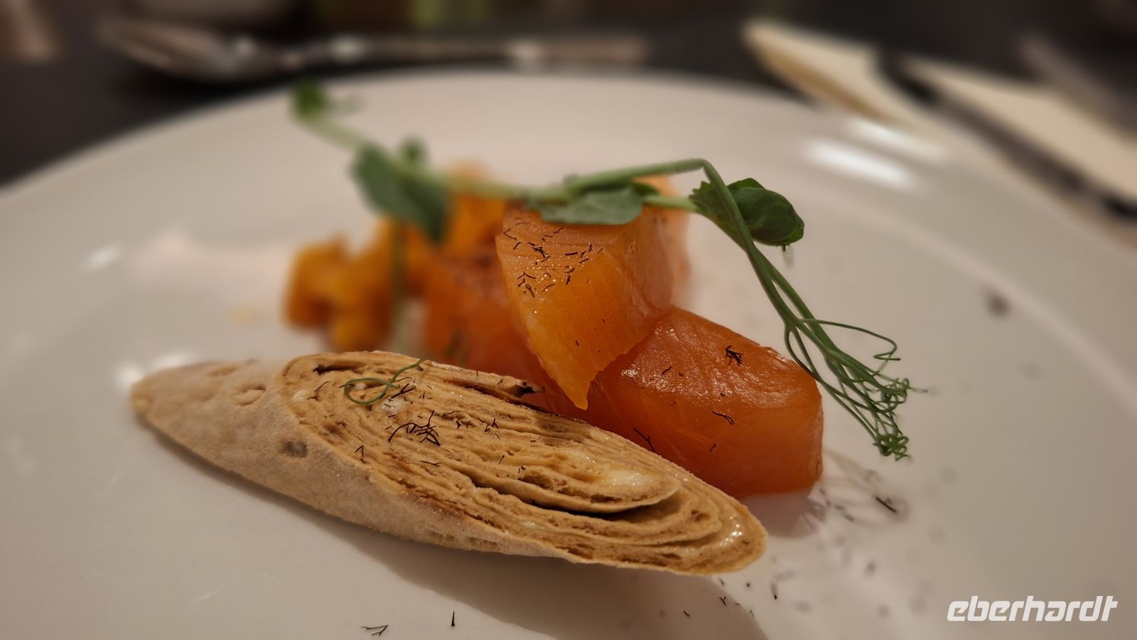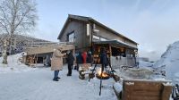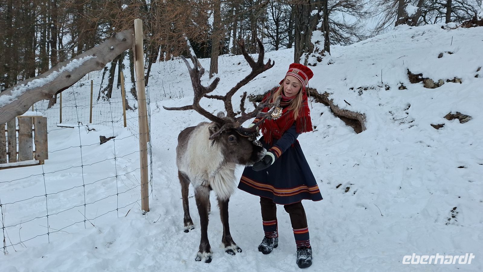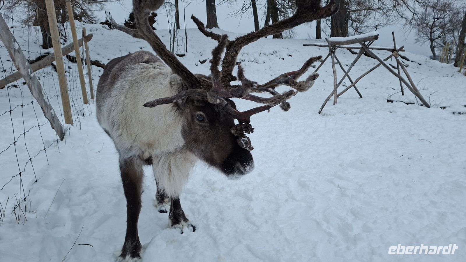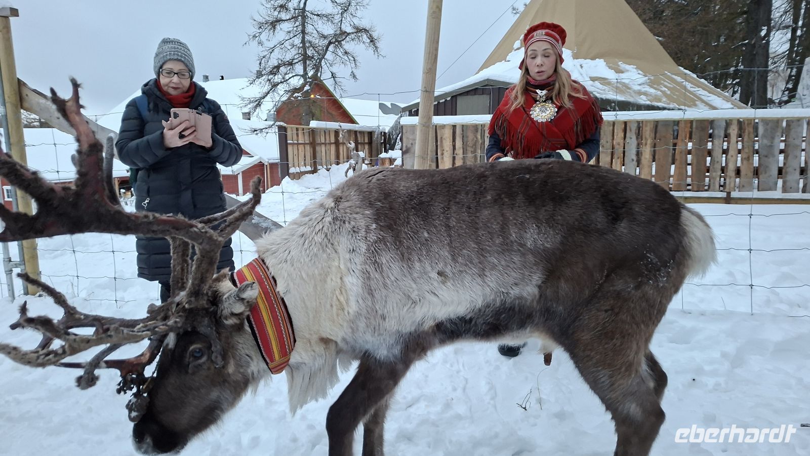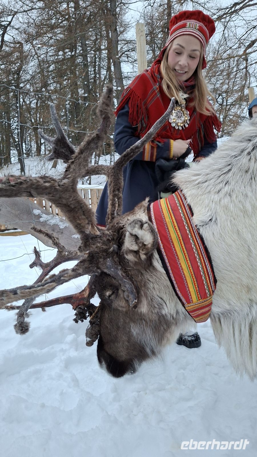 Danach war Zeit zum Genießen: in der Lounge sitzen, einen Tee oder Kaffee trinken, hinausschauen in die dunkle, schneeverhangene Landschaft, vielleicht ein bisschen lesen oder einfach nur dösen. Währenddessen merkten wir, dass der Seegang spürbar rauer wurde – das Schiff hob und senkte sich sanft, manchmal ein wenig kräftiger, sodass wir beim Aufstehen automatisch nach der Stuhllehne griffen. Später trafen wir wie gewohnt das Expeditionsteam und freuten uns besonders auf das Sami-Abendessen. Es gab typische Spezialitäten aus der Küche der Sami, und wir lernten wieder ein kleines Stück mehr über die Kultur des indigenen Volkes des Nordens – mit vielen Eindrücken für Augen, Ohren und Gaumen.