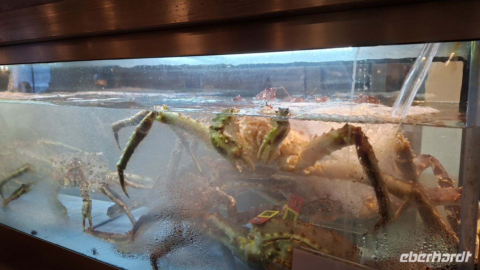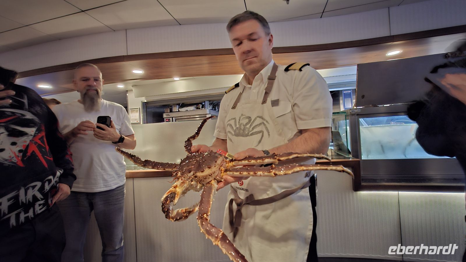 Nach dem Frühstück ging es gleich weiter mit dem nächsten Highlight: den Königskrabben. Im Bistro wurden sie aus dem Aquarium geholt, und wir erfuhren ihre Geschichte – wie diese beeindruckenden Tiere einst von Russland aus in die Barentssee kamen, wie riesig sie werden können und warum sie heute als besondere Delikatesse gelten. Wir staunten nicht schlecht über diese gewaltigen Scheren.