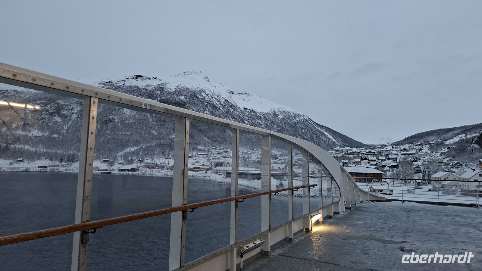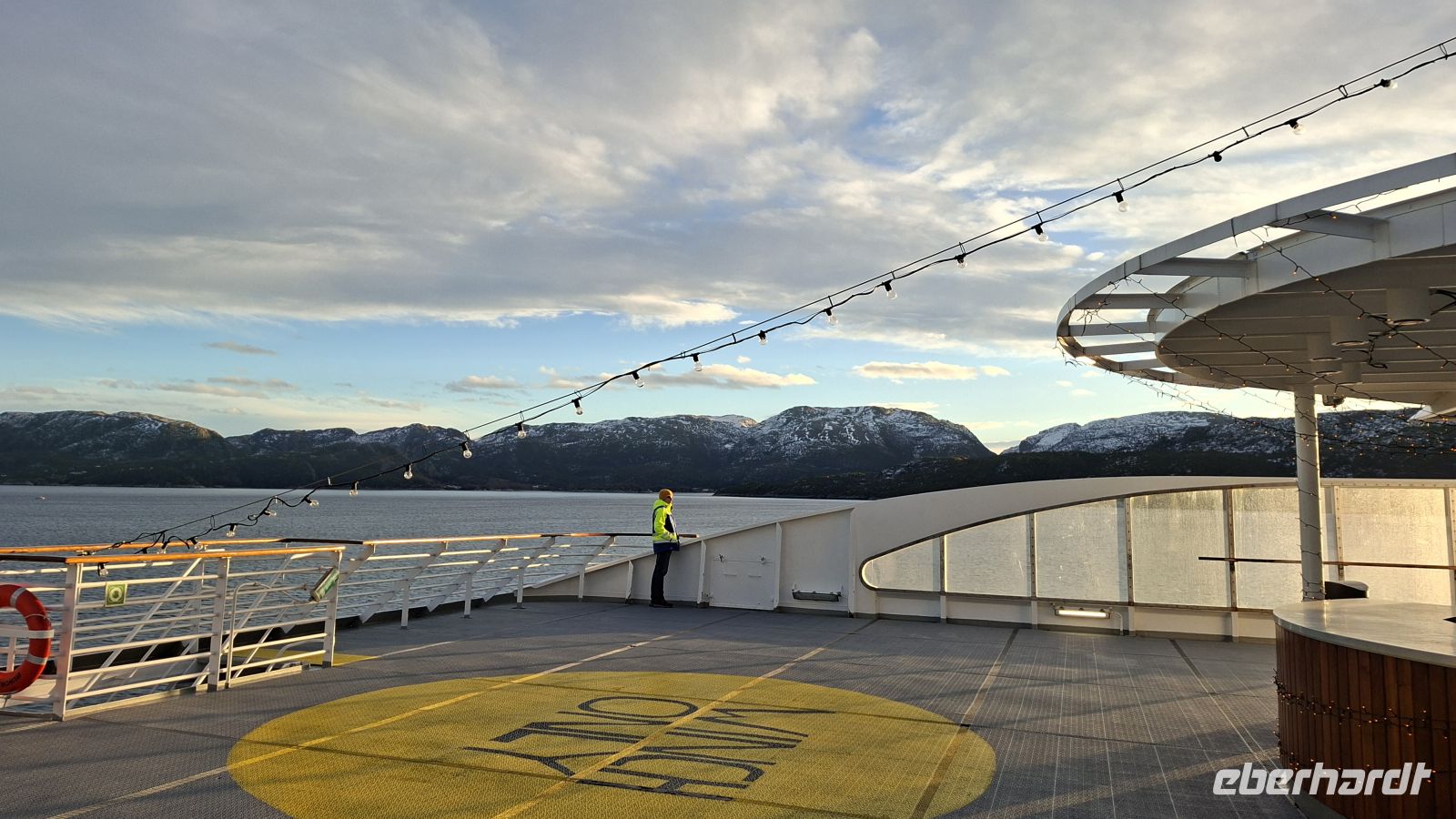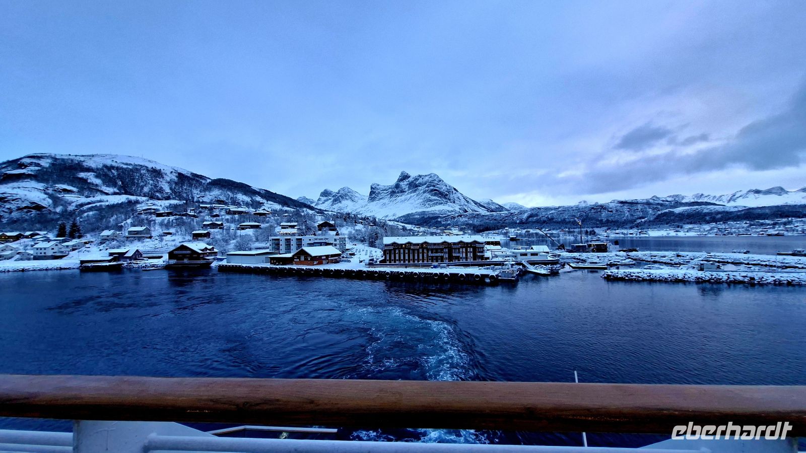 Nach einem kurzen Halt in Sandnessjøen, bei dem sich einige Gäste wieder die Beine vertraten und die tollen blauen Gemälde an den Hausfassaden fotografierten, ging es weiter entlang der Küste. Auf der Weiterfahrt erzählte uns Jan auf Deck 7 am Heck Wissenswertes über die Bergkette der Sieben Schwestern. Diese markanten Gipfel liegen wie eine Kette entlang der Küste und haben natürlich ihre eigenen Sagen und Geschichten. Das windig-kalte Wetter hielt allerdings nur die Mutigsten länger draußen – wir standen eingemummelt an der Reling, ließen uns den Wind um die Nase wehen und verfolgten die vorbeiziehenden Landschaften.