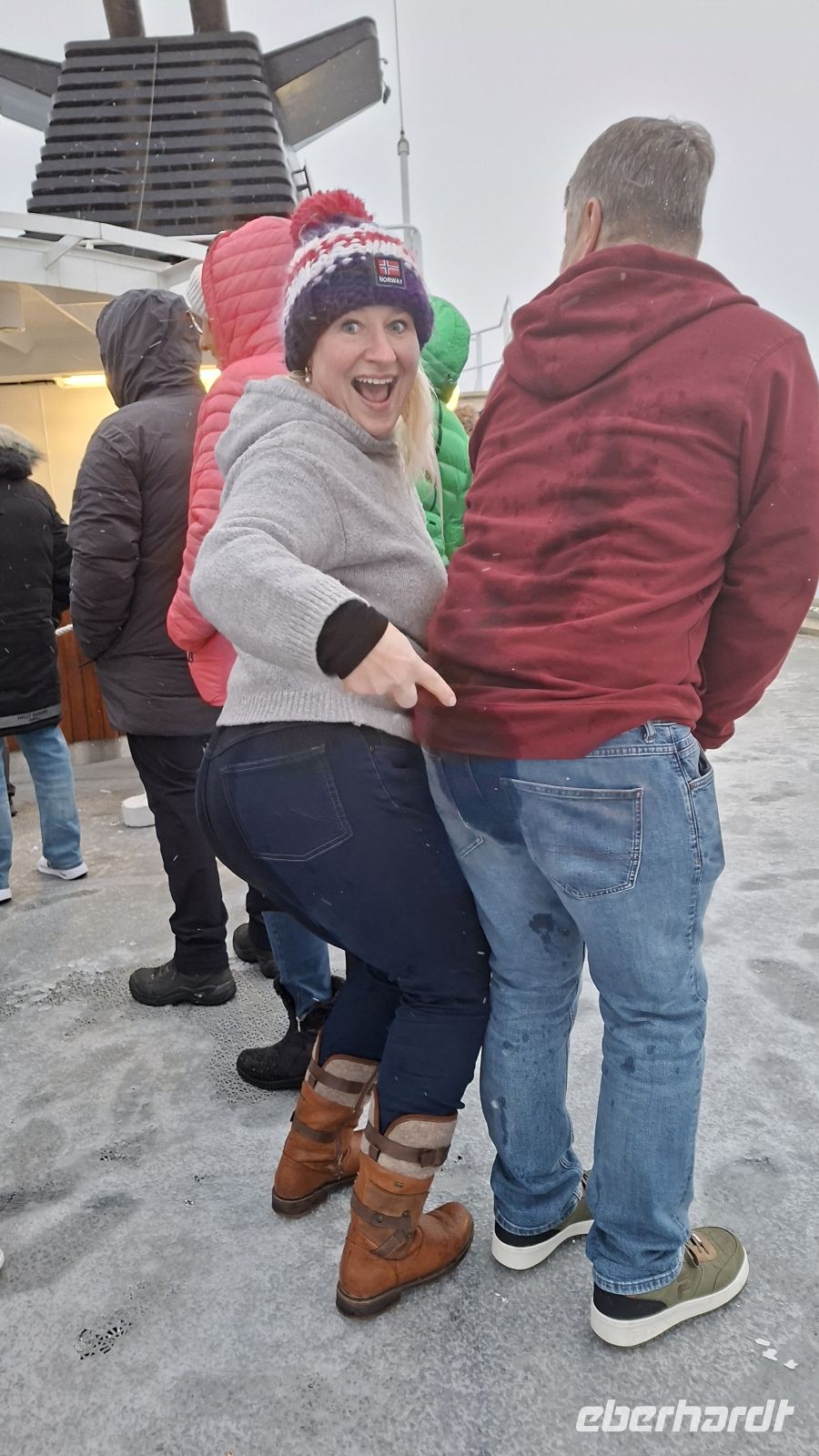 Früh am Morgen stand ein besonderer Moment an: unsere erneute Überquerung des Polarkreises – natürlich wieder mit kleiner Zeremonie. Endlich waren wir wieder „in der Karibik“ 😄 – so nannten wir scherzhaft den Bereich um den Polarkreis herum, in dem an Bord erfahrungsgemäß die Stimmung besonders ausgelassen war. Dieses Mal mussten alle teilnehmenden Gäste einen Schluck Lebertran kosten. Die Gesichter waren unbezahlbar: von tapfer-neutral über „ich schaffe das“ bis hin zu „oh weh!“. Zur Freude aller durfte man seinen Löffel behalten – was für ein herrlich originelles Andenken an unsere Polarkreis-Taufe.