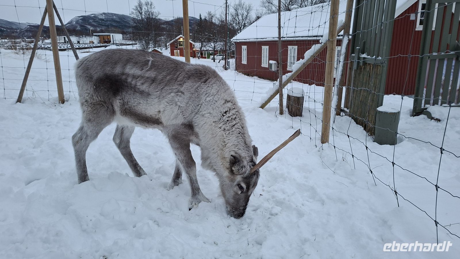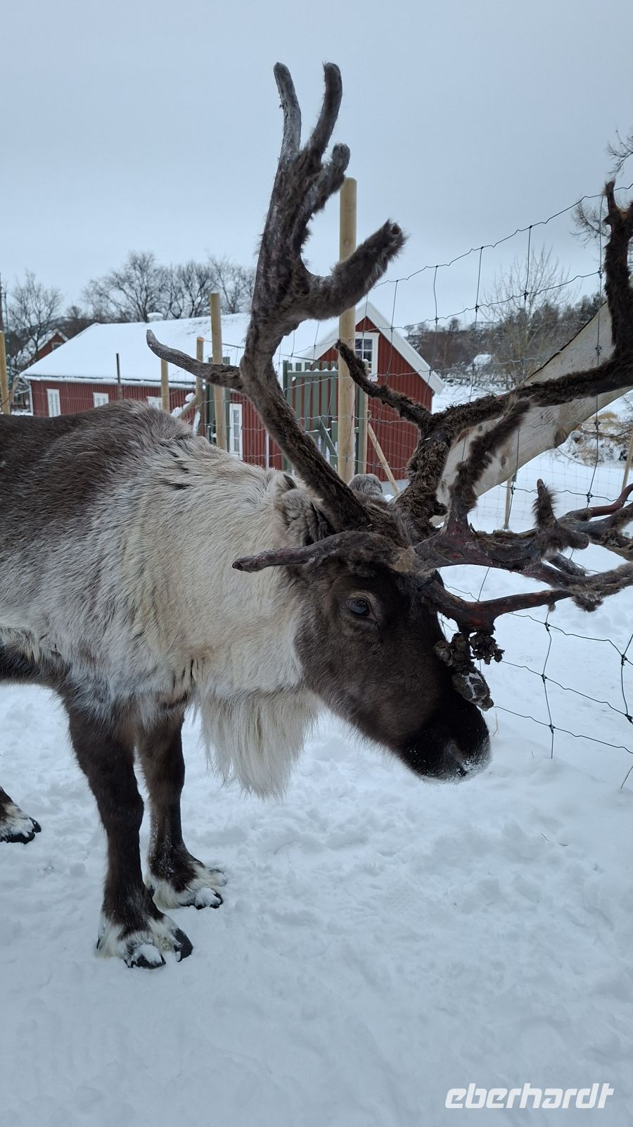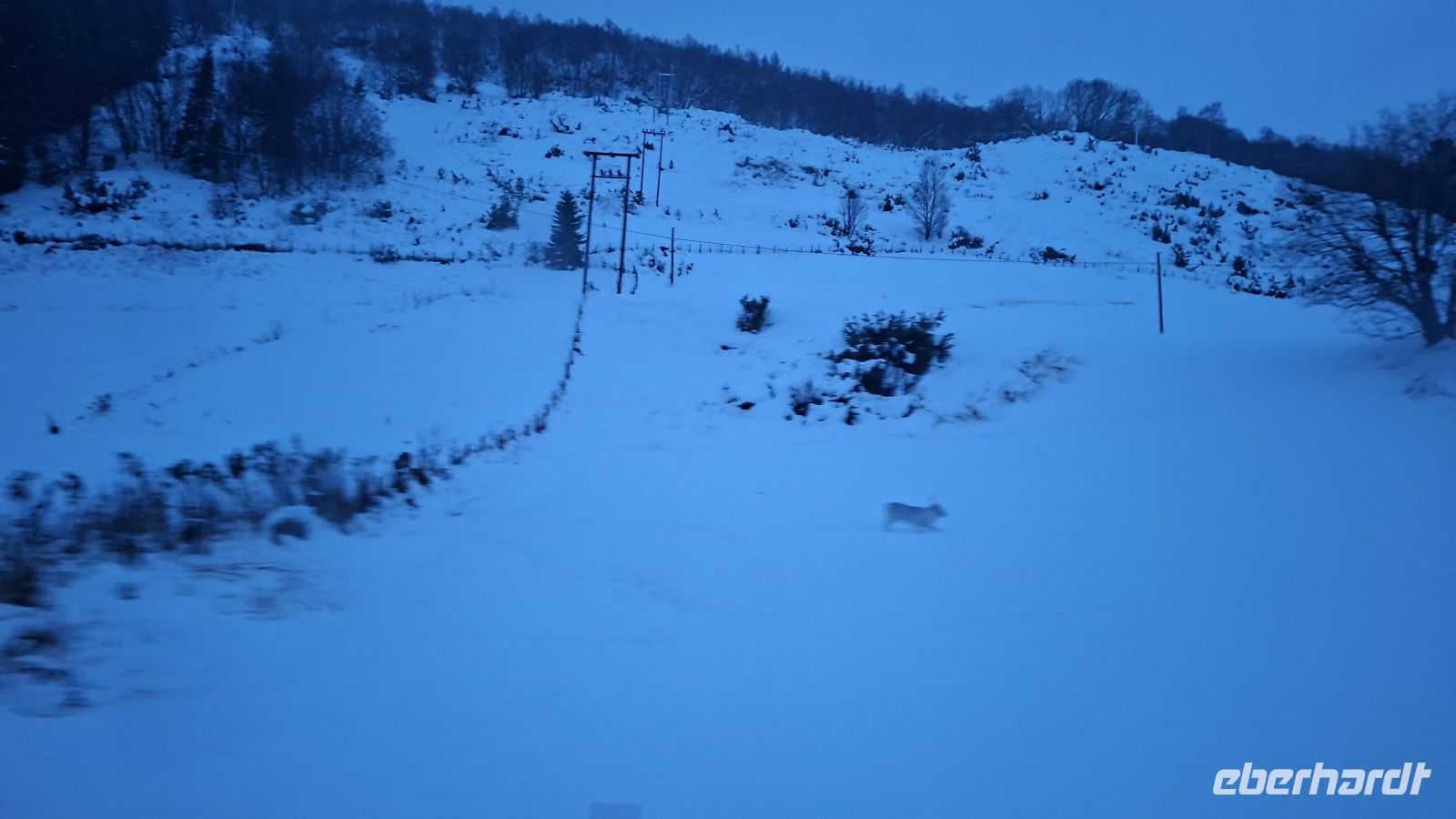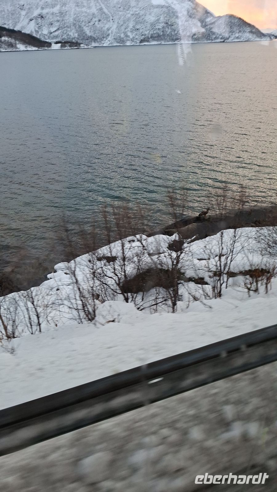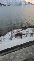 Danach fuhren wir weiter entlang der wunderschönen Fjordlandschaft des Kvæfjords. Links und rechts schneebedeckte Hänge, dazwischen das stille Wasser – und mittendrin wir, gemütlich im Bus. Unterwegs entdeckten wir tatsächlich Rentiere, die ganz entspannt in der Nähe des Straßenrands durch den Schnee stapften. Einige hatten sogar das Glück, beim Vorbeifahren einen Elch im Gebüsch zu erspähen – wir waren allerdings so schnell wieder weitergefahren, dass er für andere eher ein „Hast-du-ihn-gesehen-oder-nicht?“-Diskussionsthema blieb.