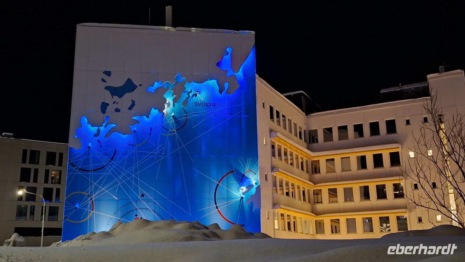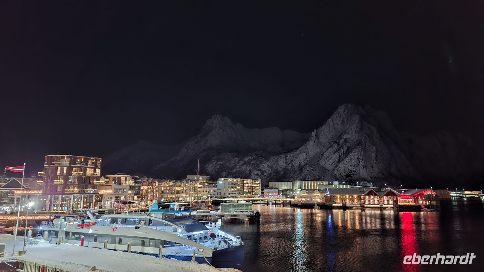 Am Abend legten wir im verschneiten Svolvær an, dem Herz der Lofoten. Wir hatten Zeit für einen kleinen Rundgang: verschneite Straßen, Lichter, die sich im Wasser spiegelten, und diese typische Mischung aus Fischerort und gemütlicher Kleinstadt.