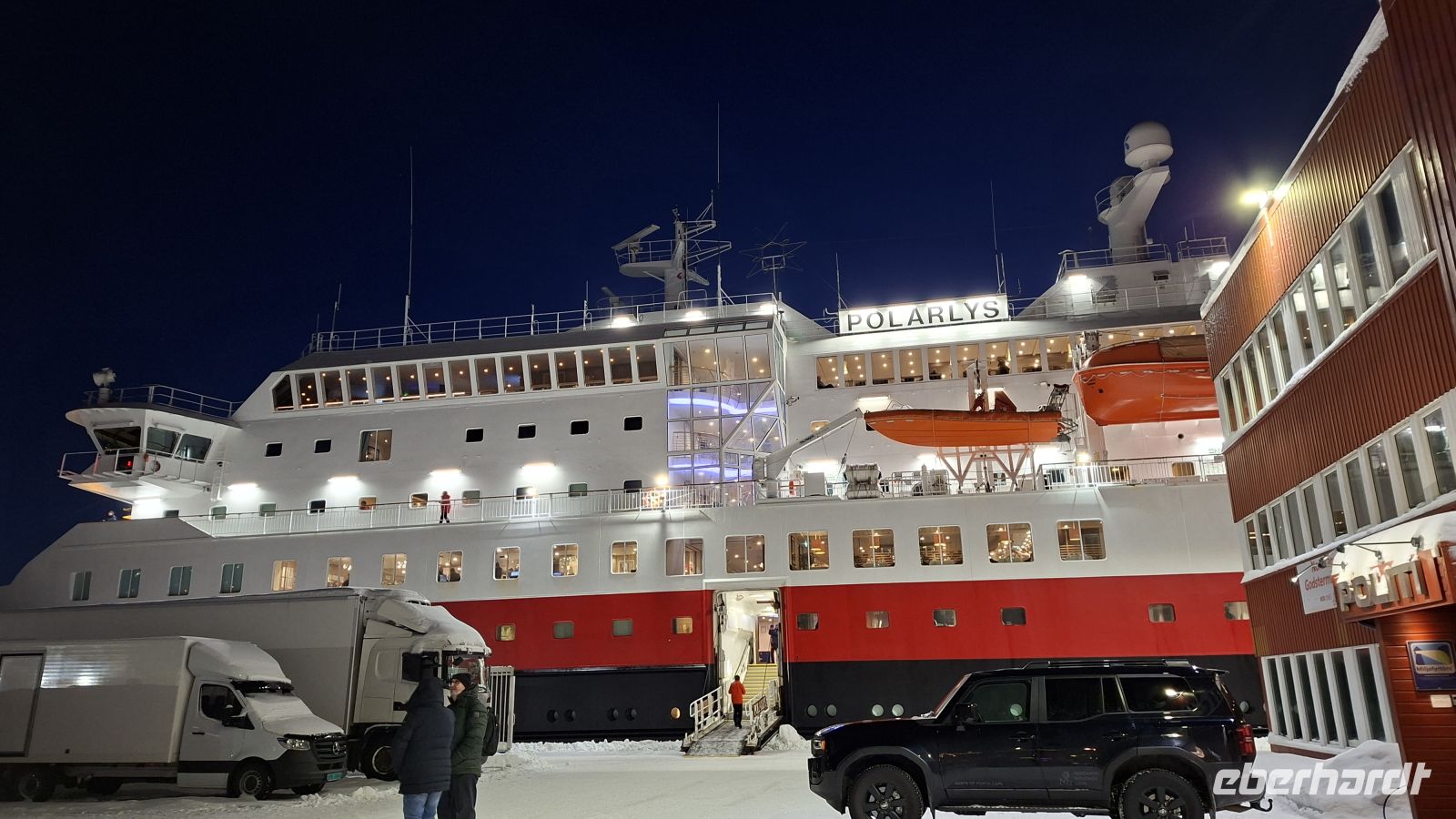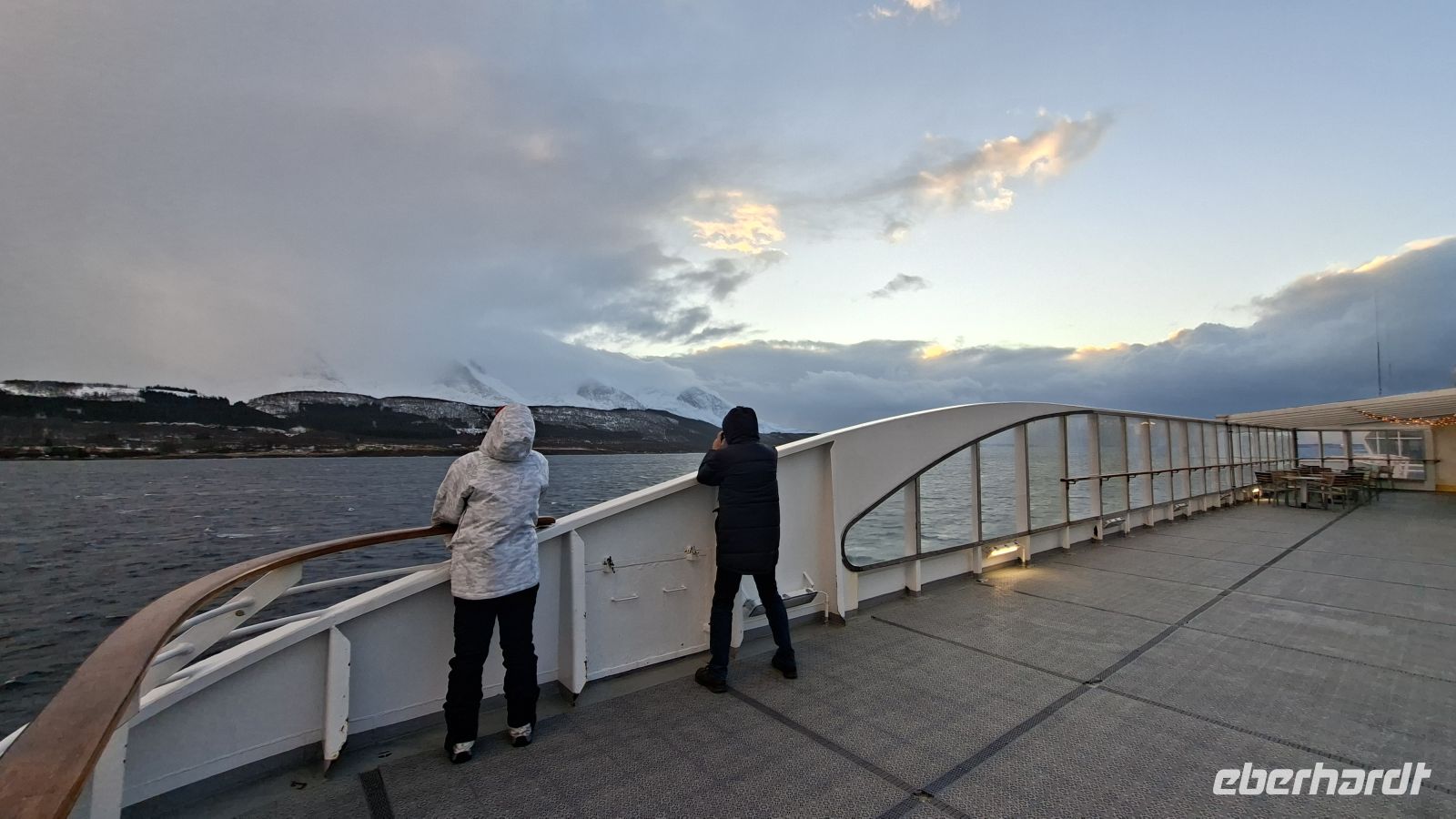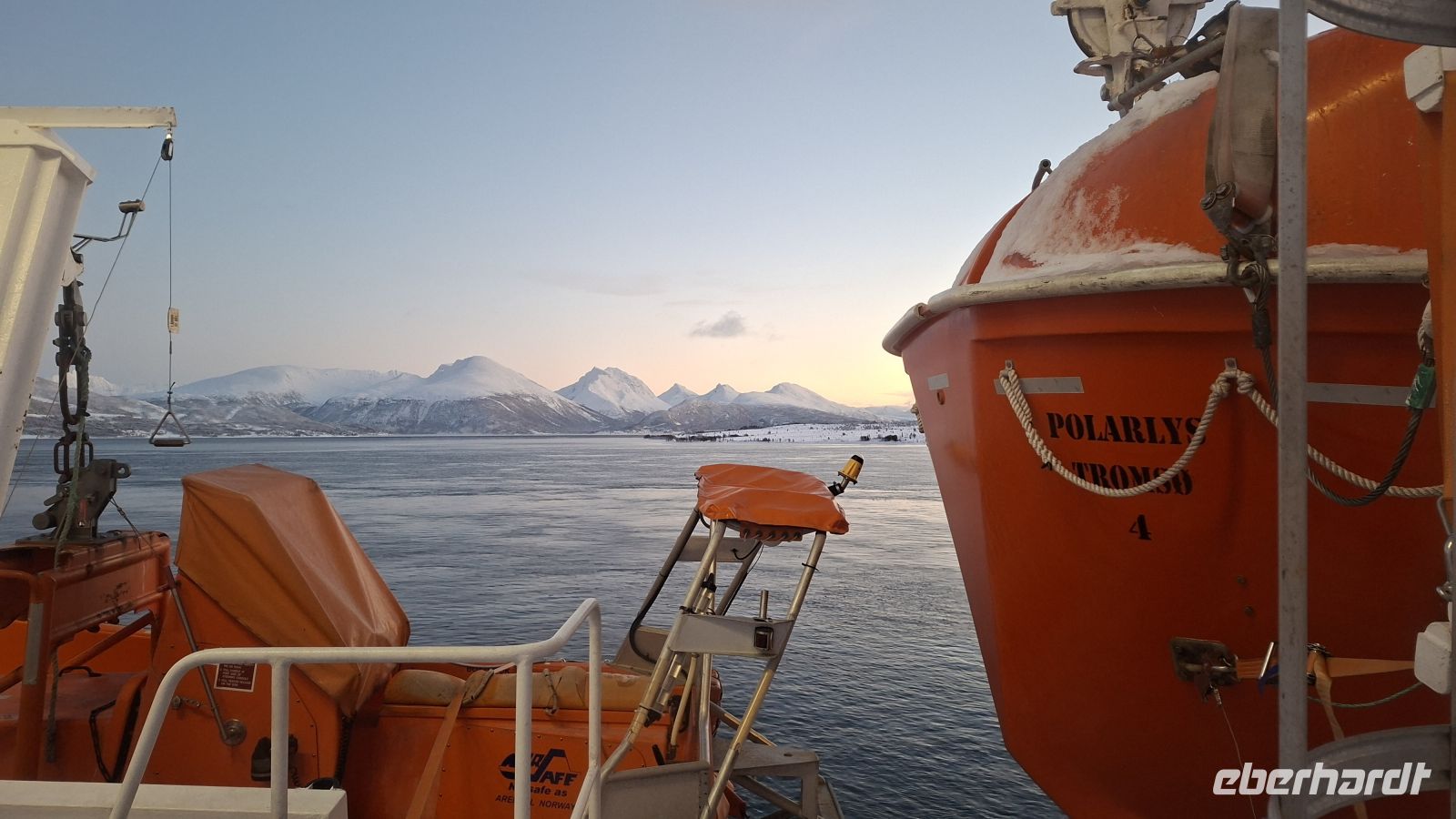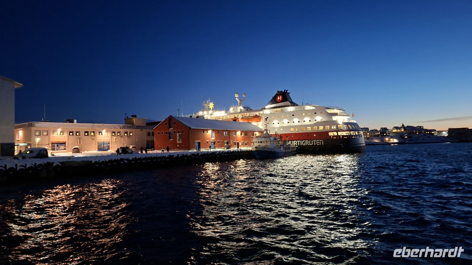 Mittags waren wir wieder an Bord, und die Rückmeldungen klangen alle gleich: hellauf begeistert. Egal ob Schneehotel oder Huskys – dieser Vormittag hatte bei allen Eindruck hinterlassen. Inzwischen wurde es schon wieder deutlich dunkler. Es war Polarnacht und Winter, die Sonne schaffte es nicht über den Horizont, und das Tageslicht verwandelte sich schnell in ein tiefblaues Dämmerlicht. Genau das verlieh der ganzen Szenerie ihren ganz besonderen Zauber.