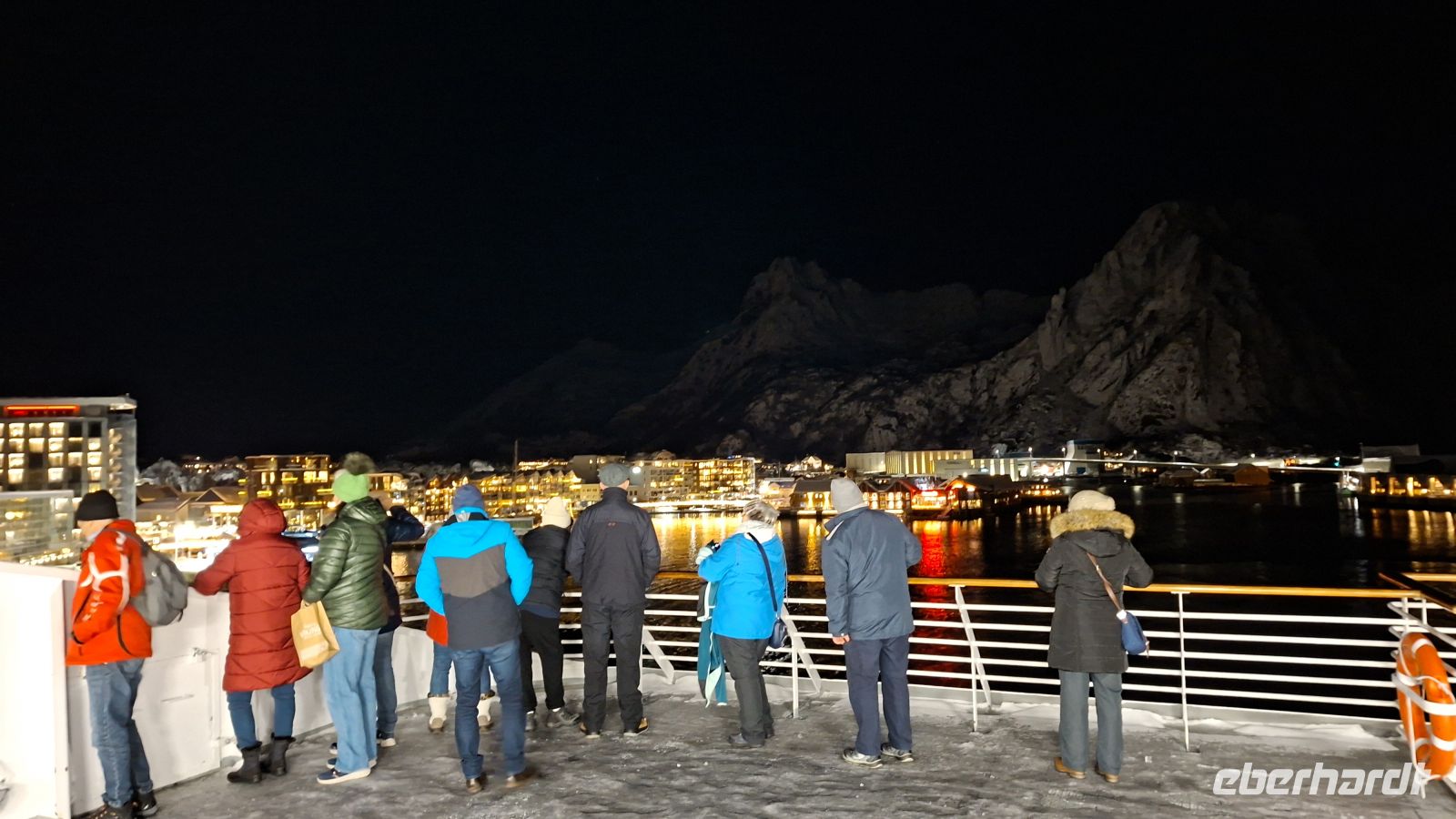 Danach ging es zum schnellen Abendessen und zu einem kurzen Halt in Svolvær. Wir waren innerlich schon ein wenig auf „Achterbahnmodus“ vorbereitet – aber die ganz großen Wellen blieben zum Glück aus. So konnten wir den Tag vergleichsweise entspannt beschließen, froh über all die Erlebnisse auf den Vesterålen und dankbar, dass uns der Nordatlantik an diesem Abend gnädiger gestimmt war als angekündigt.