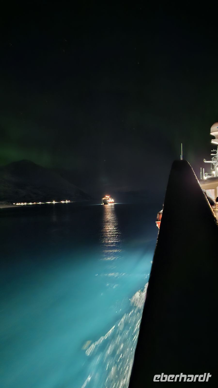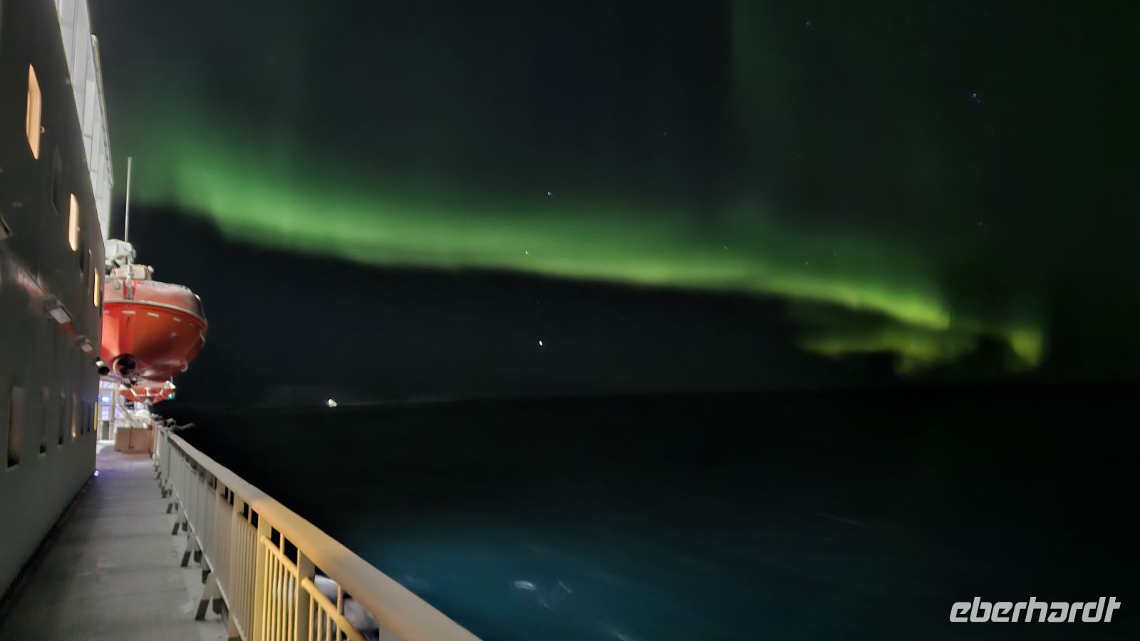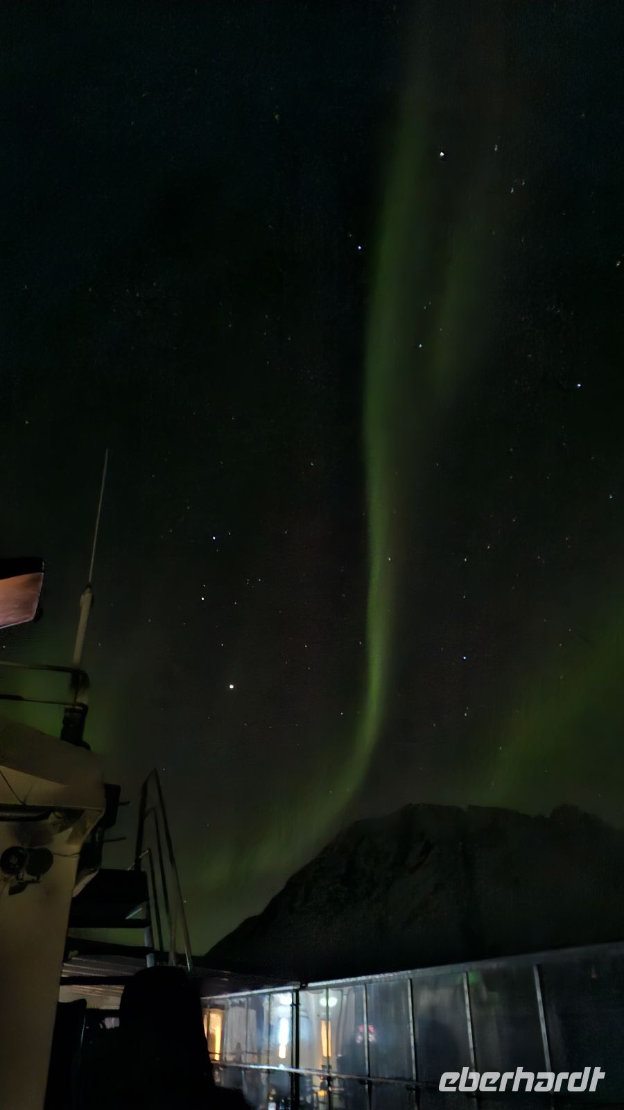 Da für den weiteren Verlauf des Tages ordentlich Seegang angekündigt war, wurde das restliche Bordprogramm etwas angepasst. Sicherheit und Wohlbefinden gehen eben vor. Doch bevor wir uns um Wellen Gedanken machen mussten, schenkte uns Norwegen noch einmal etwas fürs Herz: Auf der Fahrt durch den Tengelfjord zeigten sich erneut schöne Nordlichter. Zarte grüne Bögen spannten sich über den Himmel, und wir standen einmal mehr staunend an Deck und ließen das Schauspiel auf uns wirken.