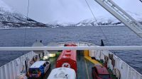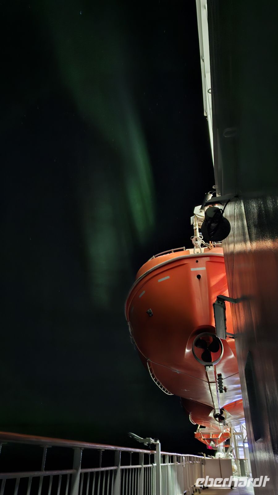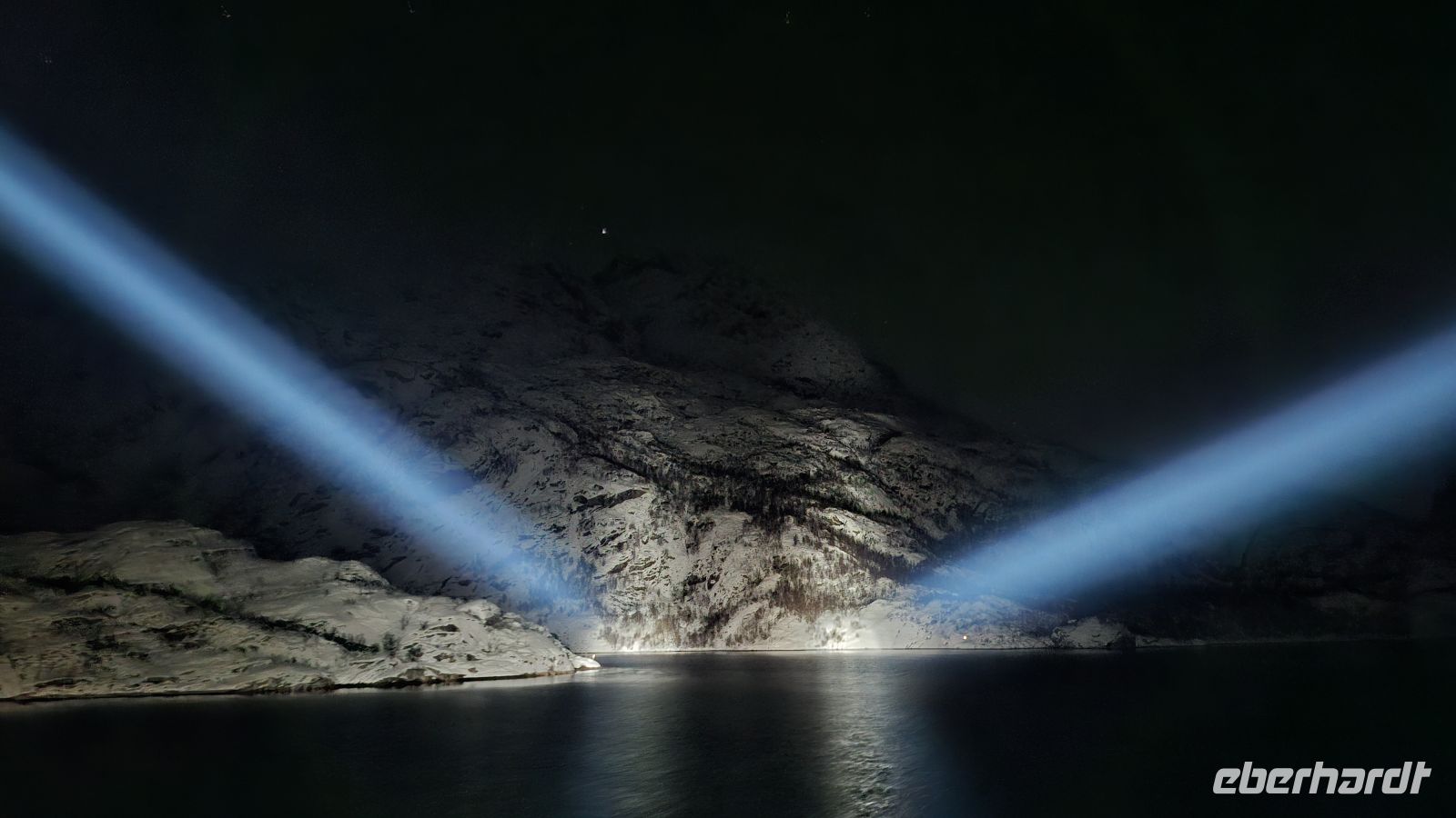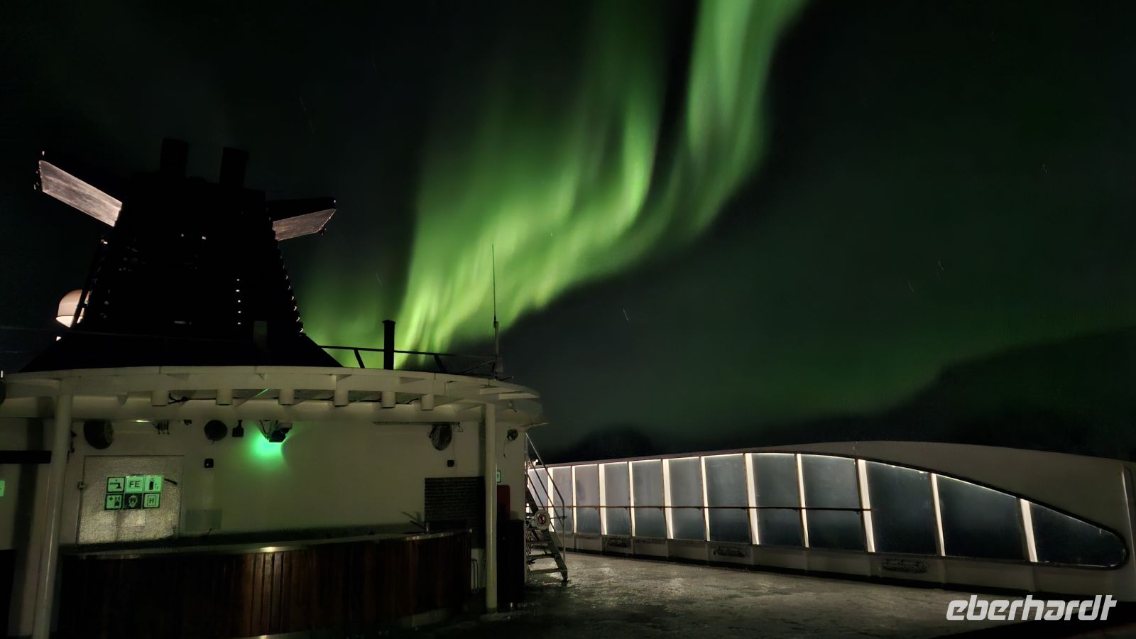 Da für den weiteren Verlauf des Tages ordentlich Seegang angekündigt war, wurde das restliche Bordprogramm etwas angepasst. Sicherheit und Wohlbefinden gehen eben vor. Doch bevor wir uns um Wellen Gedanken machen mussten, schenkte uns Norwegen noch einmal etwas fürs Herz: Auf der Fahrt durch den Tengelfjord zeigten sich erneut schöne Nordlichter. Zarte grüne Bögen spannten sich über den Himmel, und wir standen einmal mehr staunend an Deck und ließen das Schauspiel auf uns wirken.