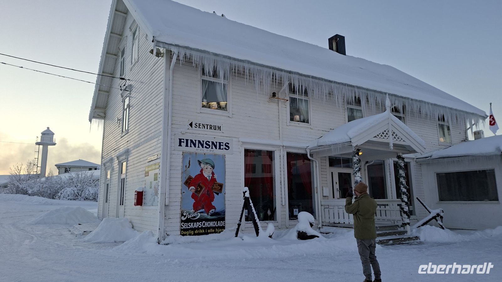 Später legten wir einen kurzen Halt in Finnsnes ein – und wurden dort buchstäblich „angefroren“. Es waren unglaubliche minus 19 Grad Lufttemperatur. Beim ersten Schritt nach draußen blieb uns fast die Luft weg. Das Meer war tatsächlich wärmer als die Luft, und so lag ein dampfender Nebelschleier über der Wasseroberfläche. Es sah aus, als würde das Meer leise vor sich hin rauchen – ein fast mystischer Anblick, der uns gleichzeitig frieren und staunen ließ.