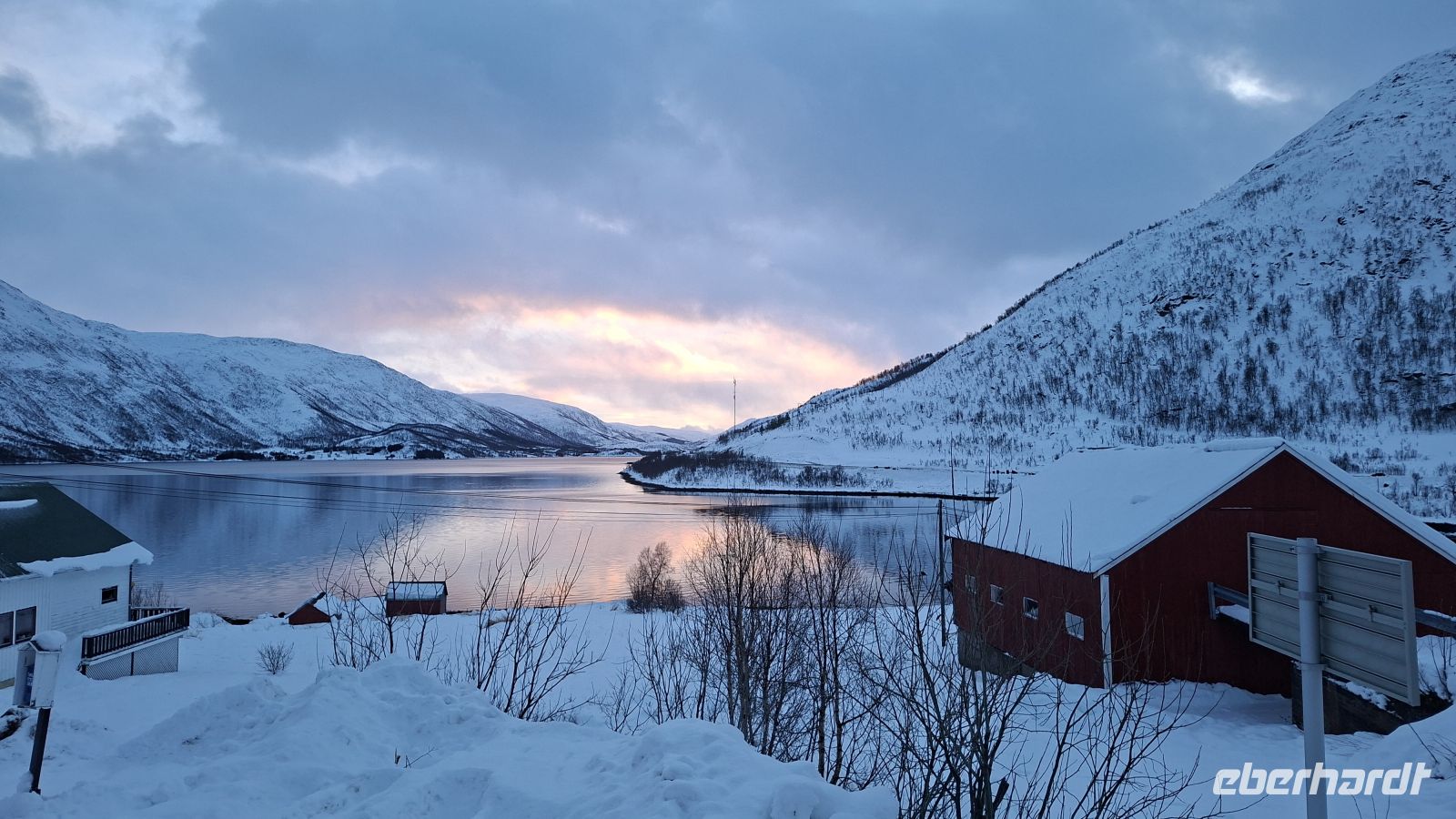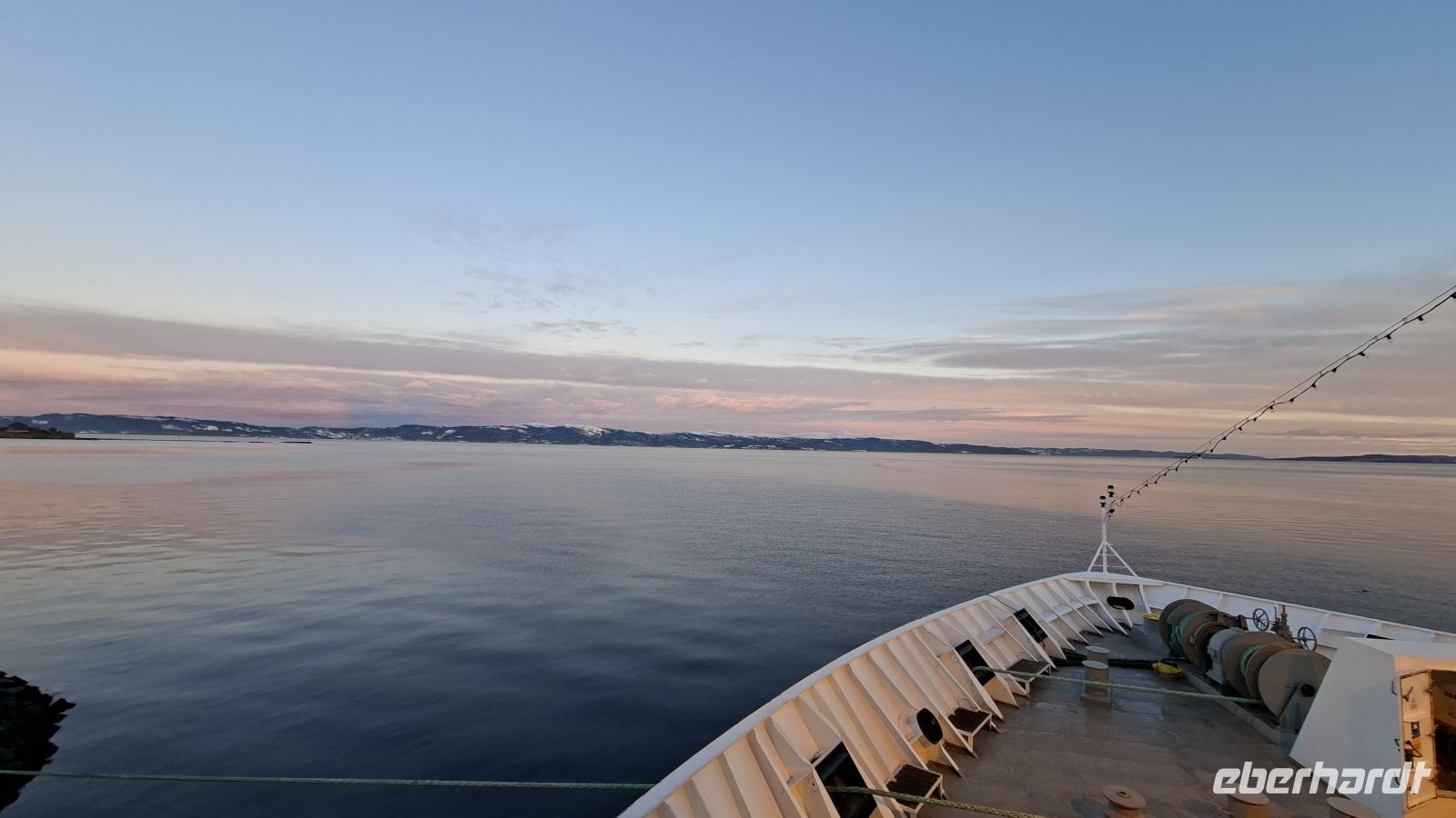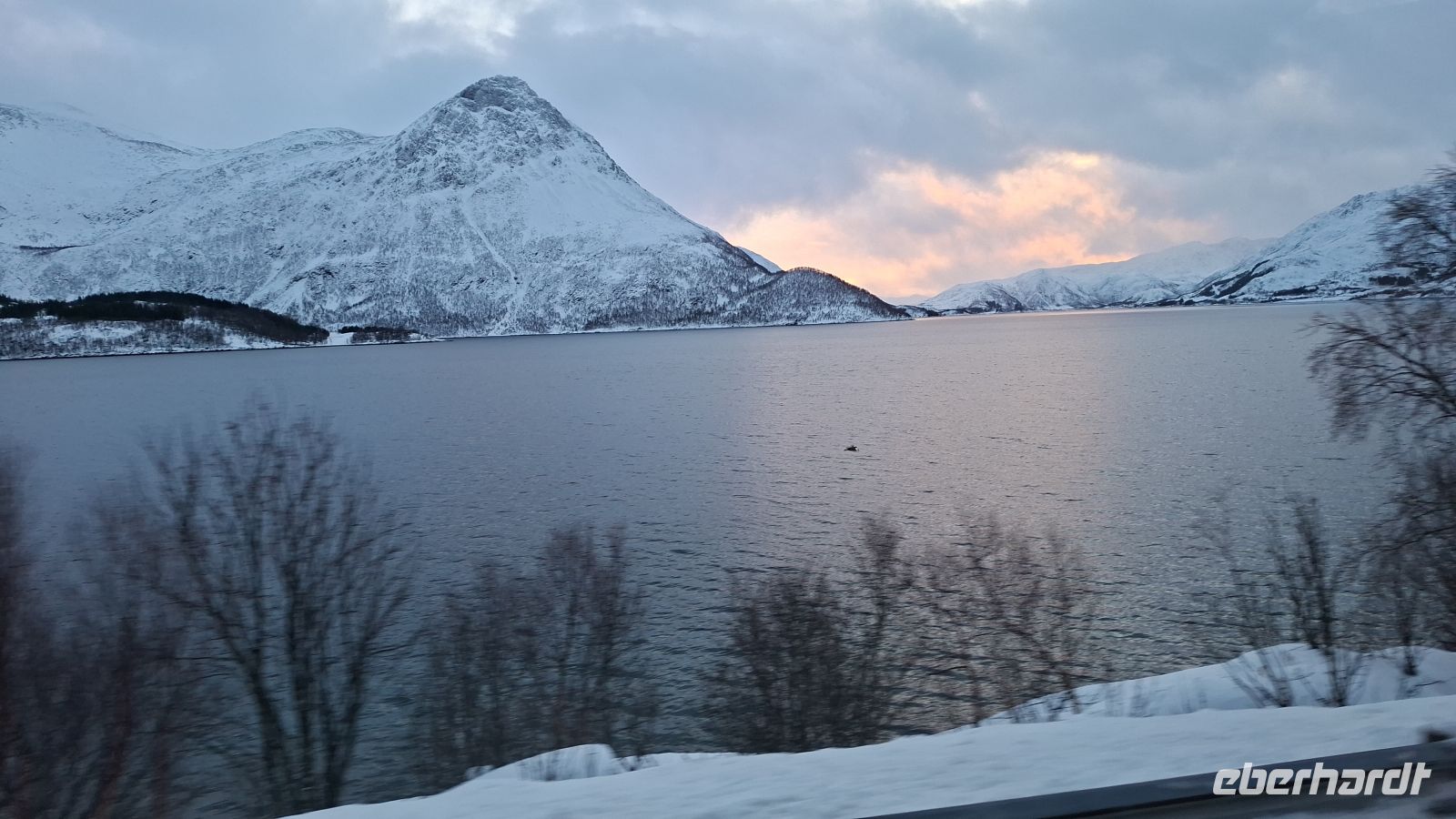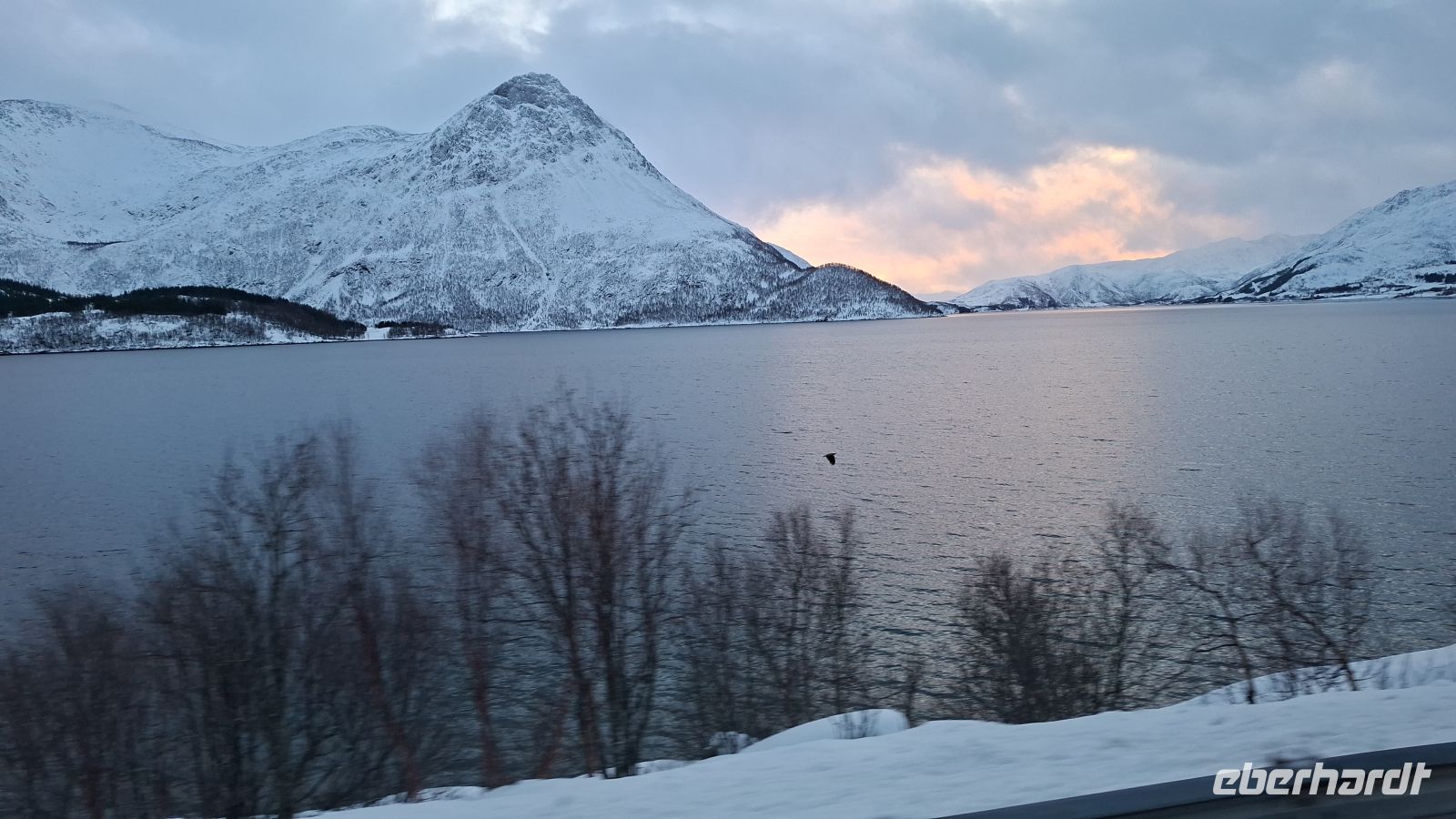 In Refsnes setzten wir mit einer Fähre über den Fjord. An Bord warteten Kaffee, Tee und Gebäck auf uns, und so genossen wir die kurze Überfahrt doppelt – draußen die Landschaft, drinnen Wärme und Kuchen. Das Licht war an diesem Tag einfach zauberhaft: Die Sonne kam zwar nicht über den Horizont, aber das Dämmerlicht tauchte Fjord und Berge in sanfte Blau- und Rosatöne. Es sah aus, als hätte jemand einen Filter über die Welt gelegt – eine richtige Zauberlandschaft.