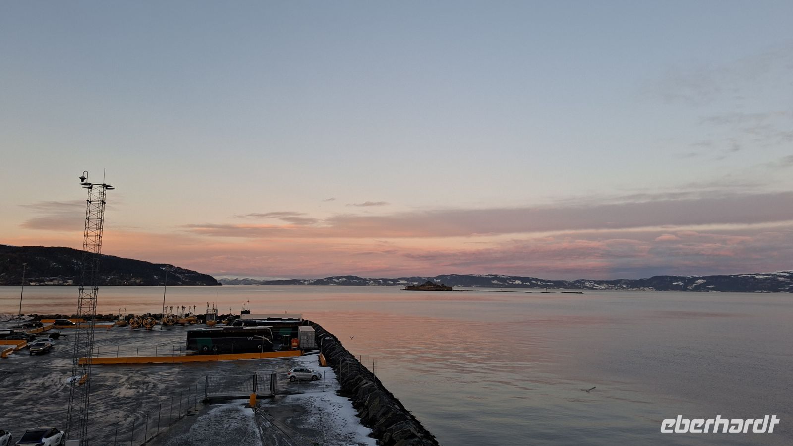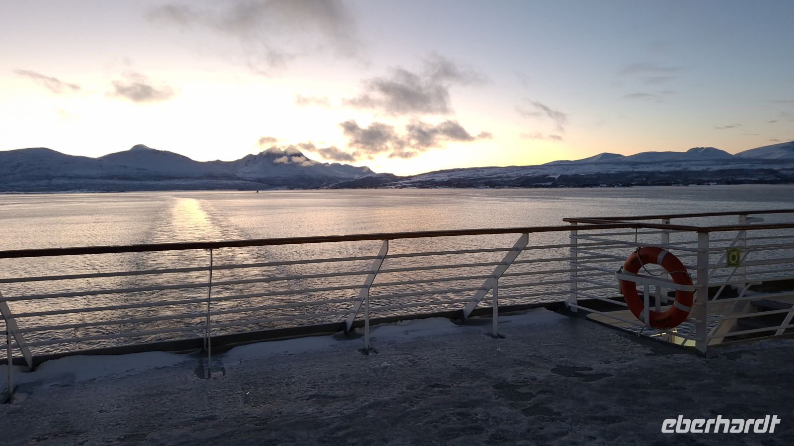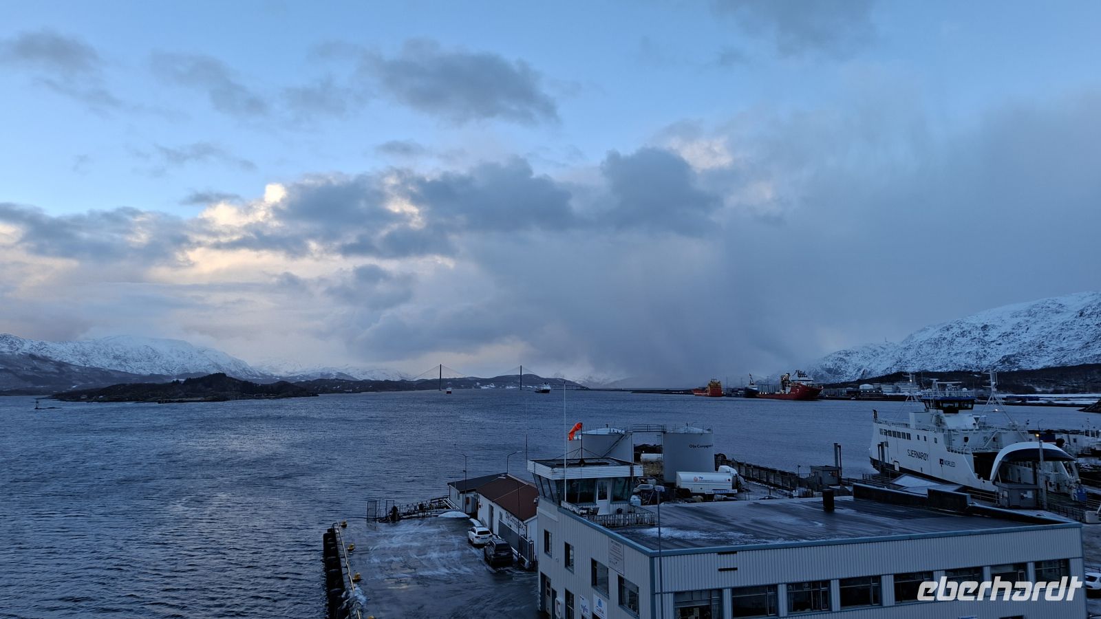 In Refsnes setzten wir mit einer Fähre über den Fjord. An Bord warteten Kaffee, Tee und Gebäck auf uns, und so genossen wir die kurze Überfahrt doppelt – draußen die Landschaft, drinnen Wärme und Kuchen. Das Licht war an diesem Tag einfach zauberhaft: Die Sonne kam zwar nicht über den Horizont, aber das Dämmerlicht tauchte Fjord und Berge in sanfte Blau- und Rosatöne. Es sah aus, als hätte jemand einen Filter über die Welt gelegt – eine richtige Zauberlandschaft.
