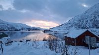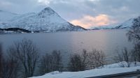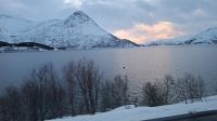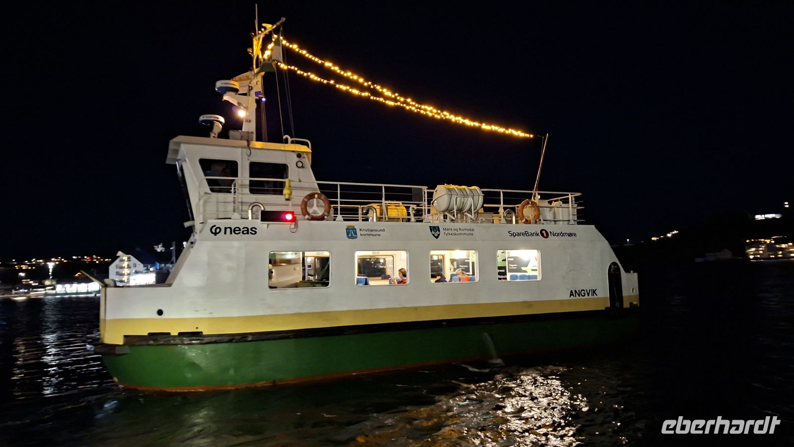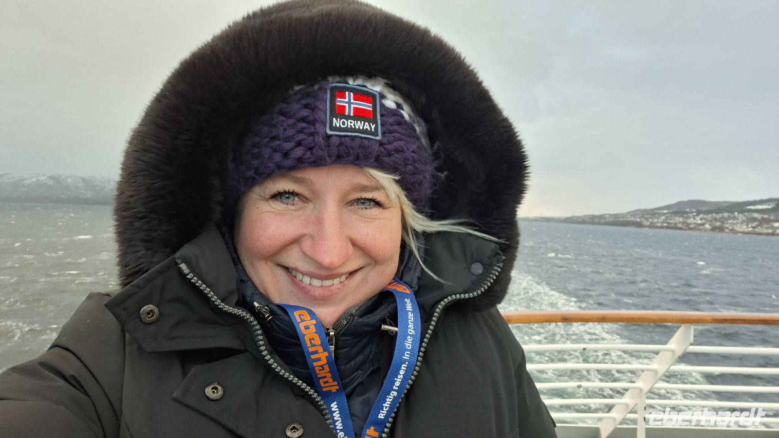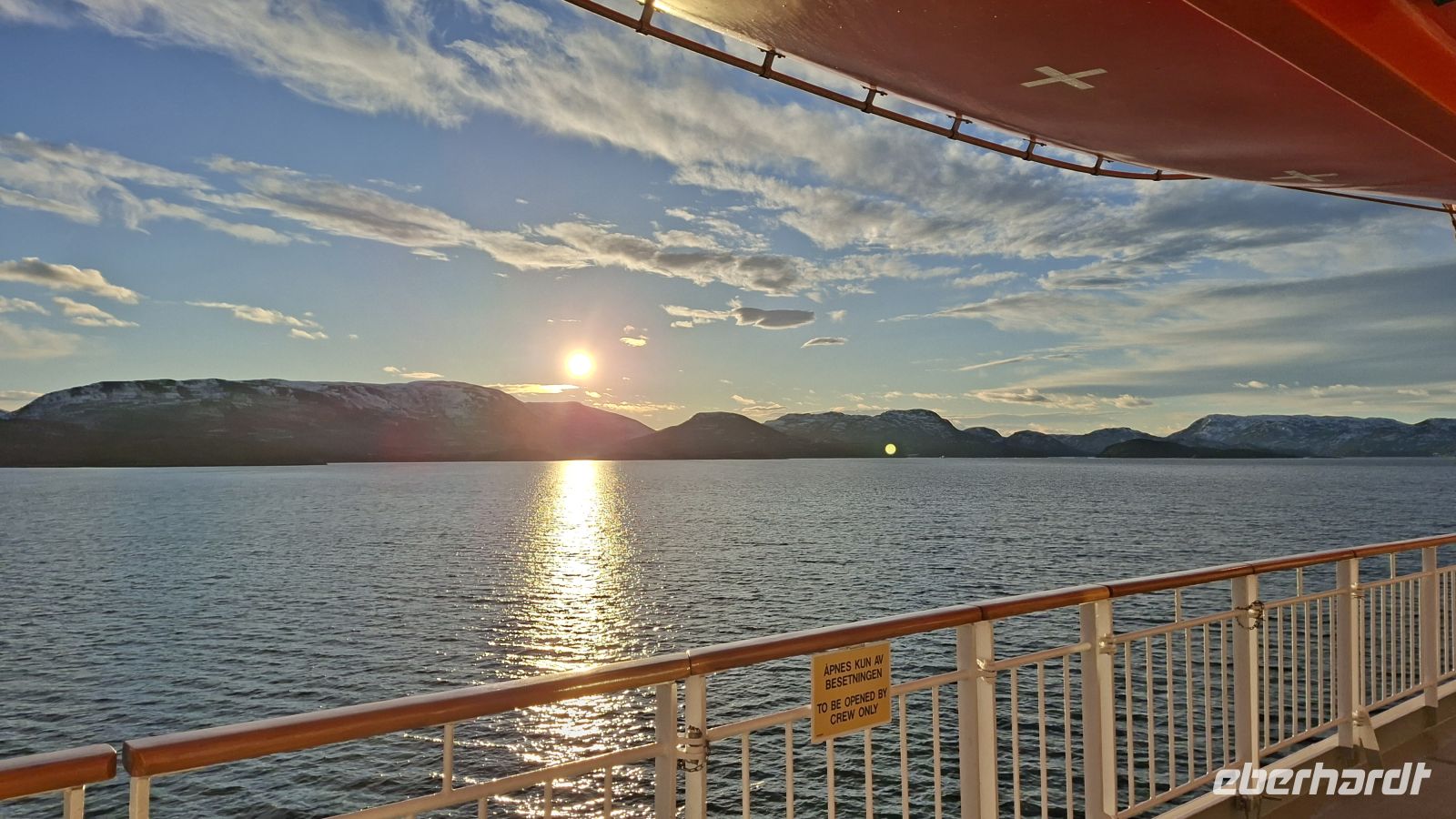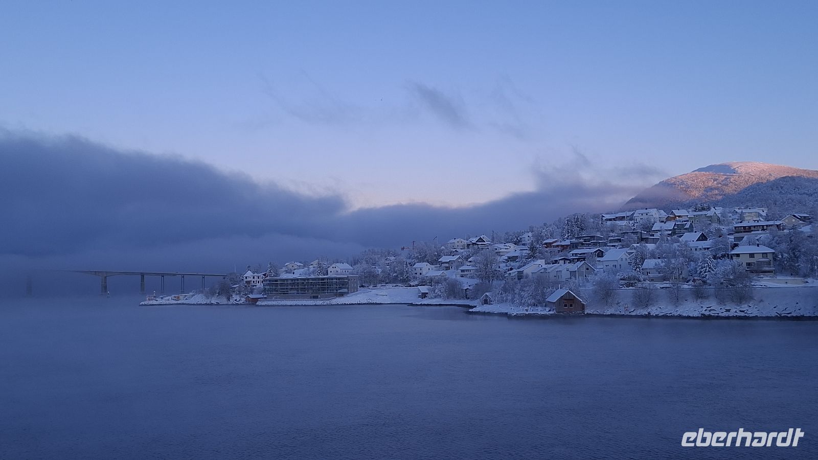 In Refsnes setzten wir mit einer Fähre über den Fjord. An Bord warteten Kaffee, Tee und Gebäck auf uns, und so genossen wir die kurze Überfahrt doppelt – draußen die Landschaft, drinnen Wärme und Kuchen. Das Licht war an diesem Tag einfach zauberhaft: Die Sonne kam zwar nicht über den Horizont, aber das Dämmerlicht tauchte Fjord und Berge in sanfte Blau- und Rosatöne. Es sah aus, als hätte jemand einen Filter über die Welt gelegt – eine richtige Zauberlandschaft.