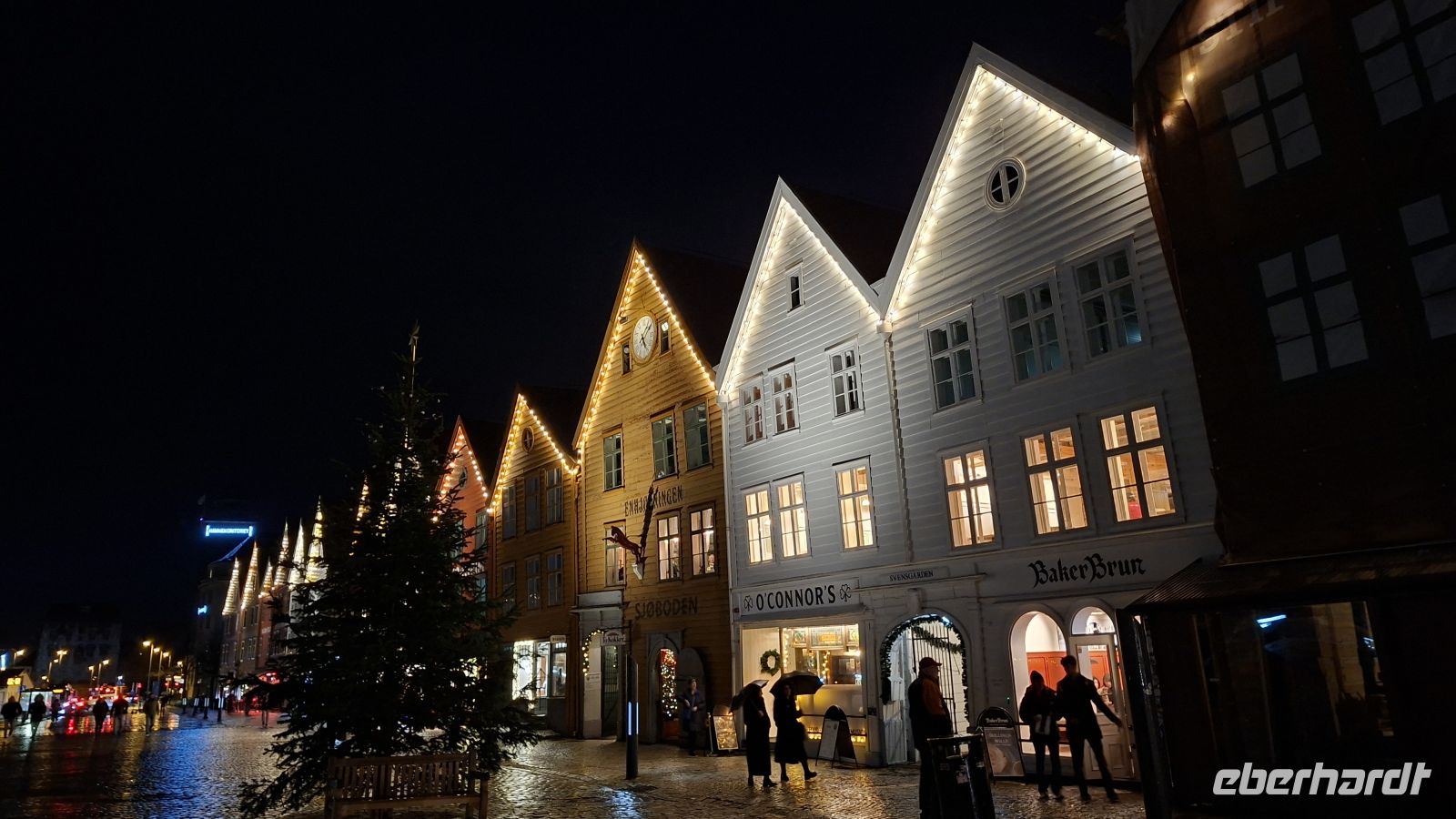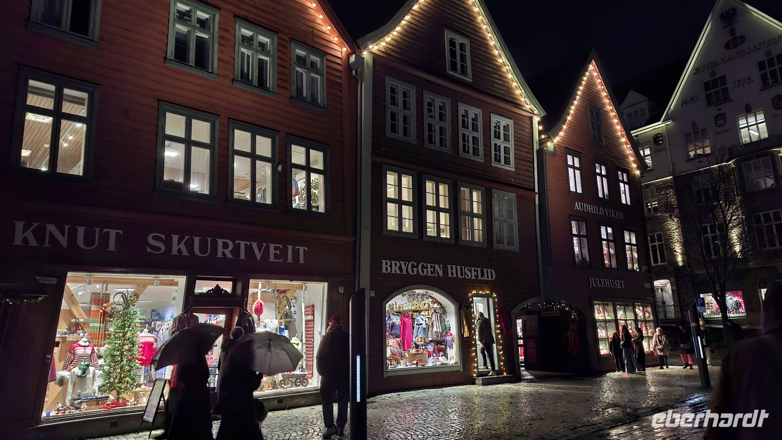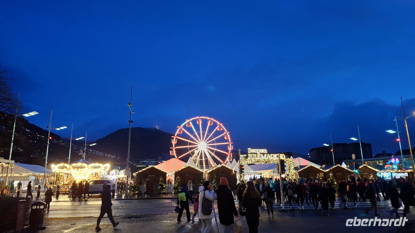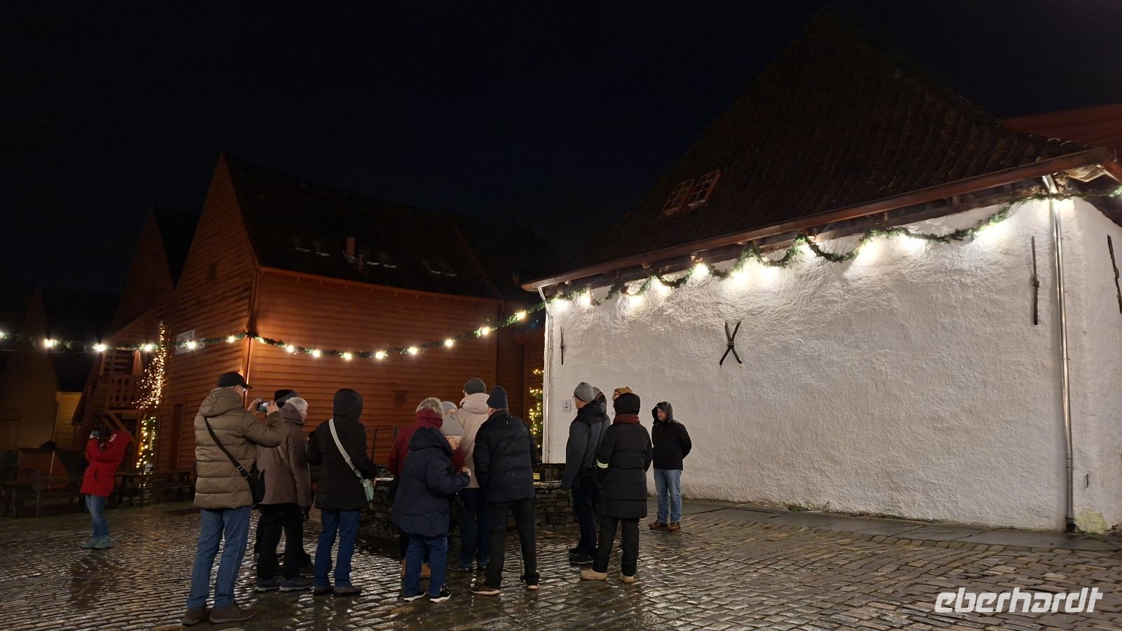 Gemeinsam mit einer örtlichen Reiseleiterin begaben wir uns auf Entdeckungstour durch Bergen. Wir spazierten durch den Stadtpark, warfen einen Blick auf den Weihnachtsmarkt und schlenderten an der Skulptur "Der blaue Stein" vorbei, bevor wir Bryggen erreichten. Dort erwarteten uns die typischen, bunten Holzhäuser der ehemaligen Hanse. Bryggen hatte eine lange und bewegte Geschichte. Im Mittelalter war hier das Zentrum der Hanse in Bergen, wo deutsche Kaufleute über Jahrhunderte Stockfisch, Getreide und andere Waren handelten. Die dicht aneinandergereihten Holzhäuser dienten als Warenlager, Kontore und Wohnhäuser zugleich. Immer wieder wurde das Viertel von Bränden heimgesucht, trotzdem wurde es jedes Mal in der alten, traditionellen Bauweise wieder aufgebaut. Heute gehörte Bryggen zum UNESCO-Weltkulturerbe – und während wir durch die schmalen, leicht schiefen Gassen gingen, konnten wir uns gut vorstellen, wie hier früher das geschäftige Treiben der Händler geherrscht hatte. Unser Weg führte uns schließlich bis zum Eingang der Fløibahn, von wo aus man auf den Hausberg Floyen fahren konnte. Einige Gäste nutzten die Gelegenheit, fuhren hinauf und genossen die einmalige Aussicht über die Stadt, den Hafen und die umliegenden Berge, während der Rest von uns gemütlich weiter unten durch die Gassen bummelte.
