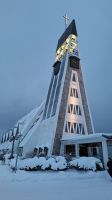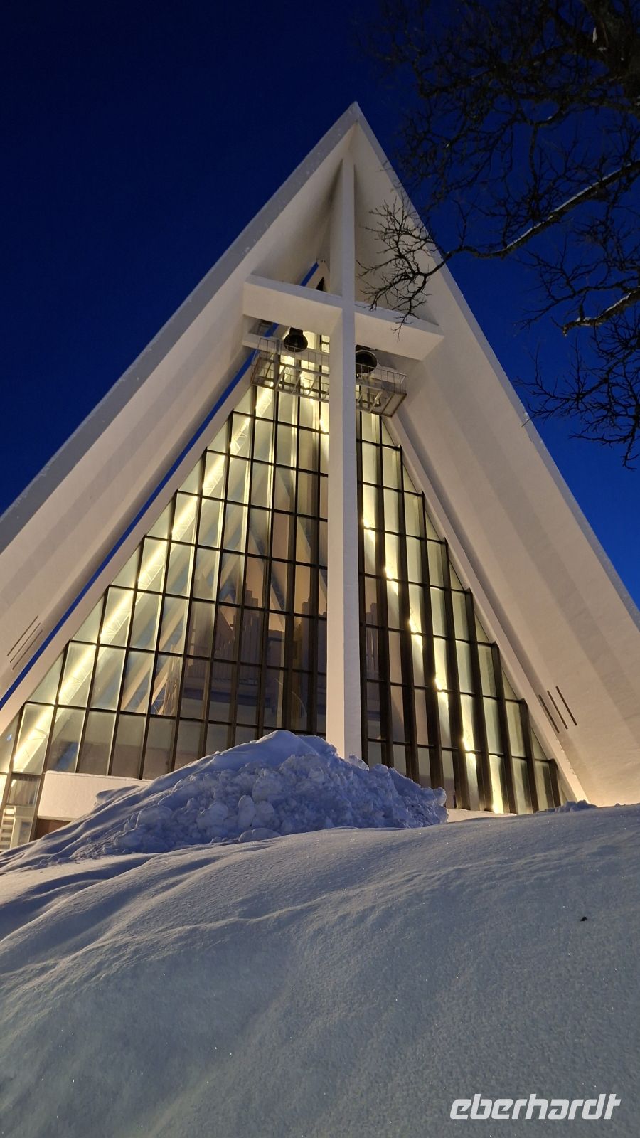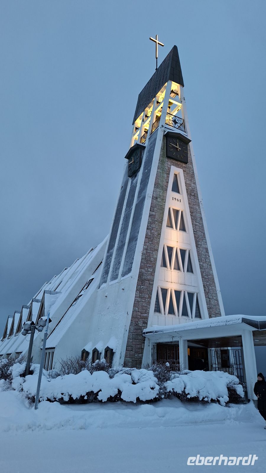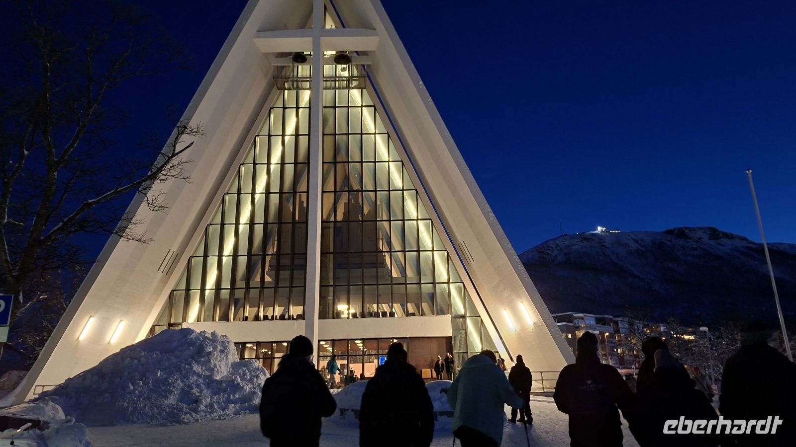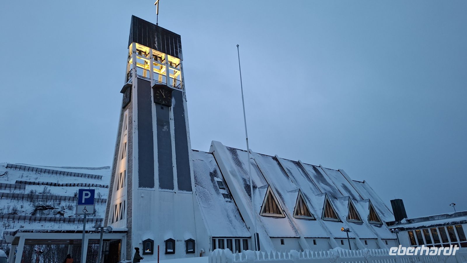 Schon von außen wirkte sie beeindruckend: Diese markante, dreieckige Form aus Beton und Aluminium erinnerte uns an einen Eisberg oder ein Zelt im Schnee. Die Eismeerkathedrale, offiziell Tromsdalen Kirche, war in den 1960er-Jahren gebaut worden und galt heute als eines der Wahrzeichen Tromsøs.