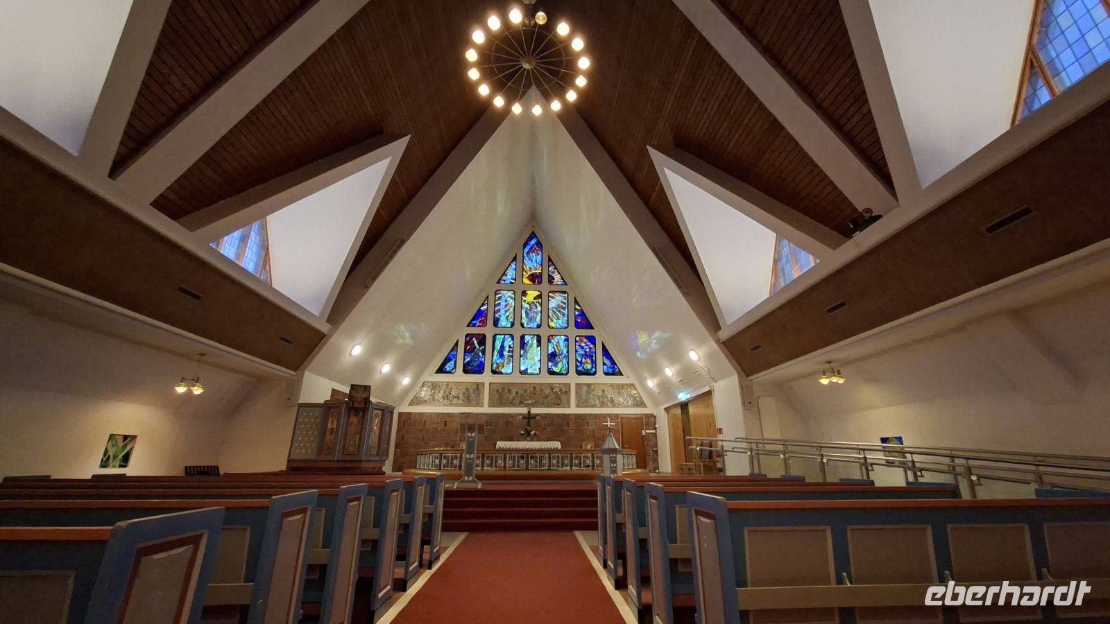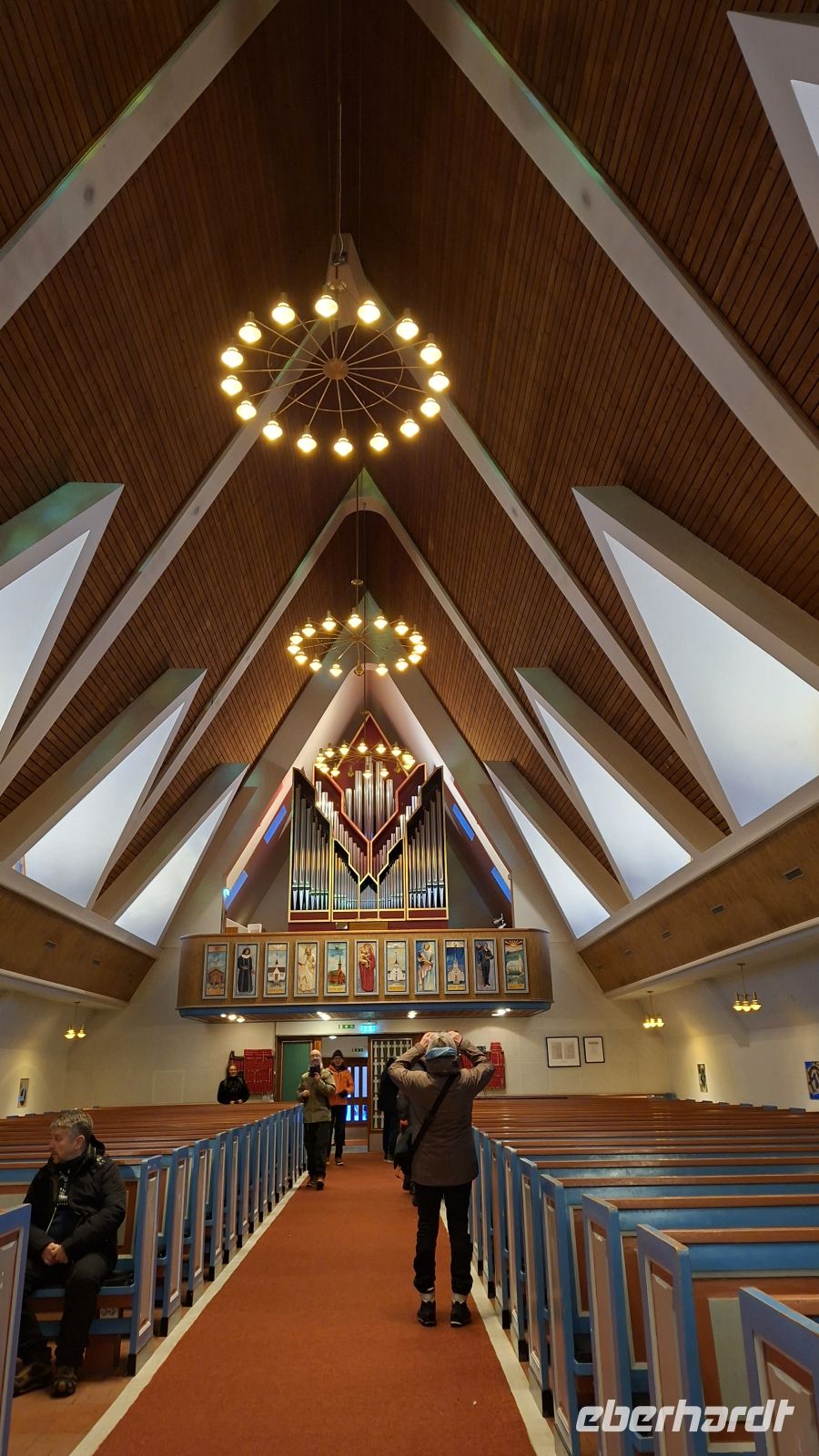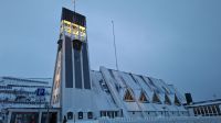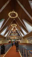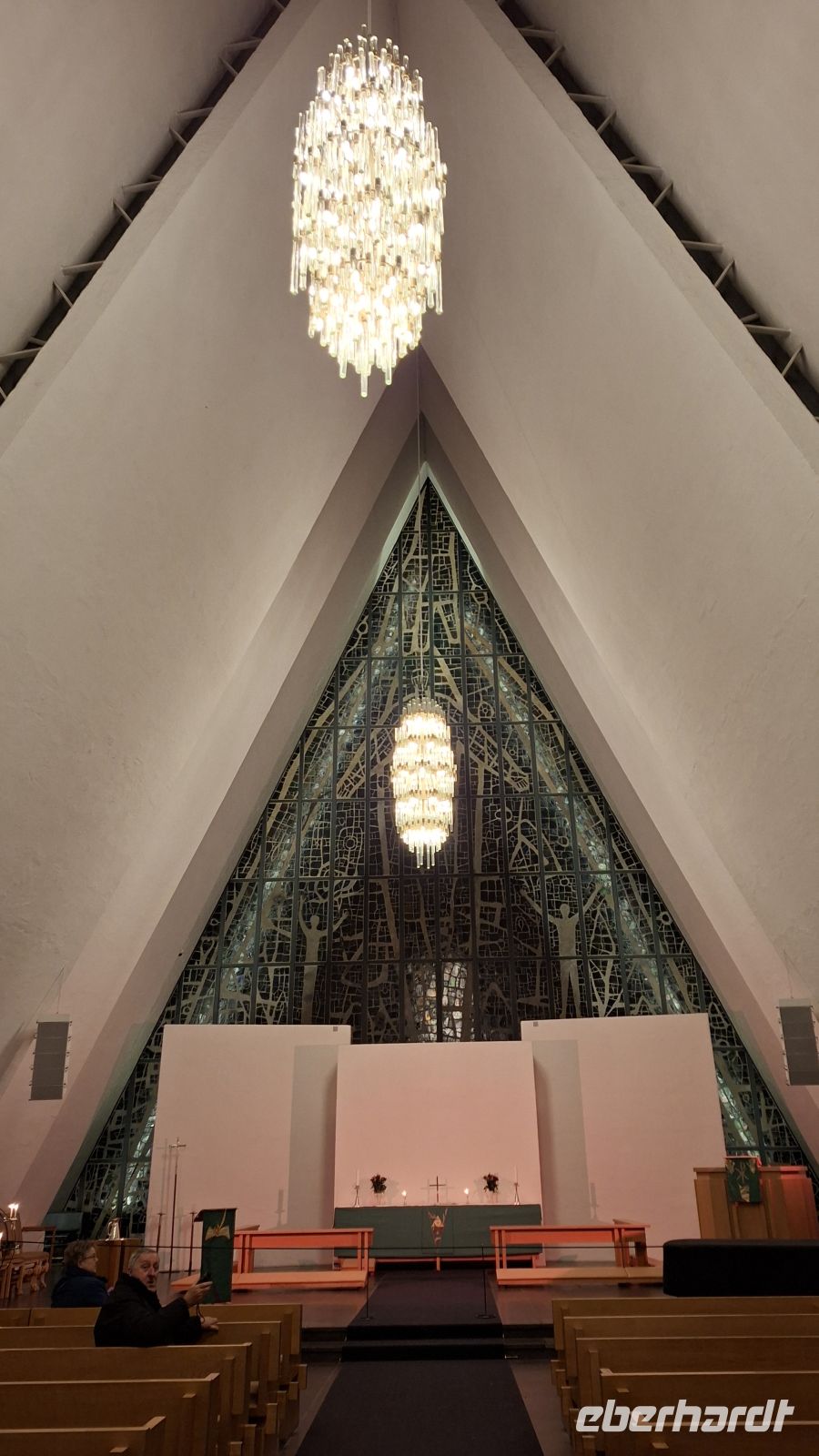 Sie stand leicht erhöht auf einem Hügel, sodass sie wie ein leuchtendes Symbol über dem Stadtteil wachte. Wir erfuhren, dass der Architekt Jan Inge Hovig mit der Form an die arktische Natur erinnern wollte – an Eis, Berge und vielleicht auch an die Insel Håja vor der Küste. Von außen wirkte sie wie ein leuchtender Eisberg in der Winterlandschaft. Besonders beeindruckend fanden wir die riesige Glasfront, hinter der sich im Inneren ein großes Glasmosaik befand, das „Die Wiederkehr Christi“ darstellen sollte.