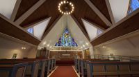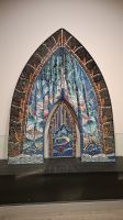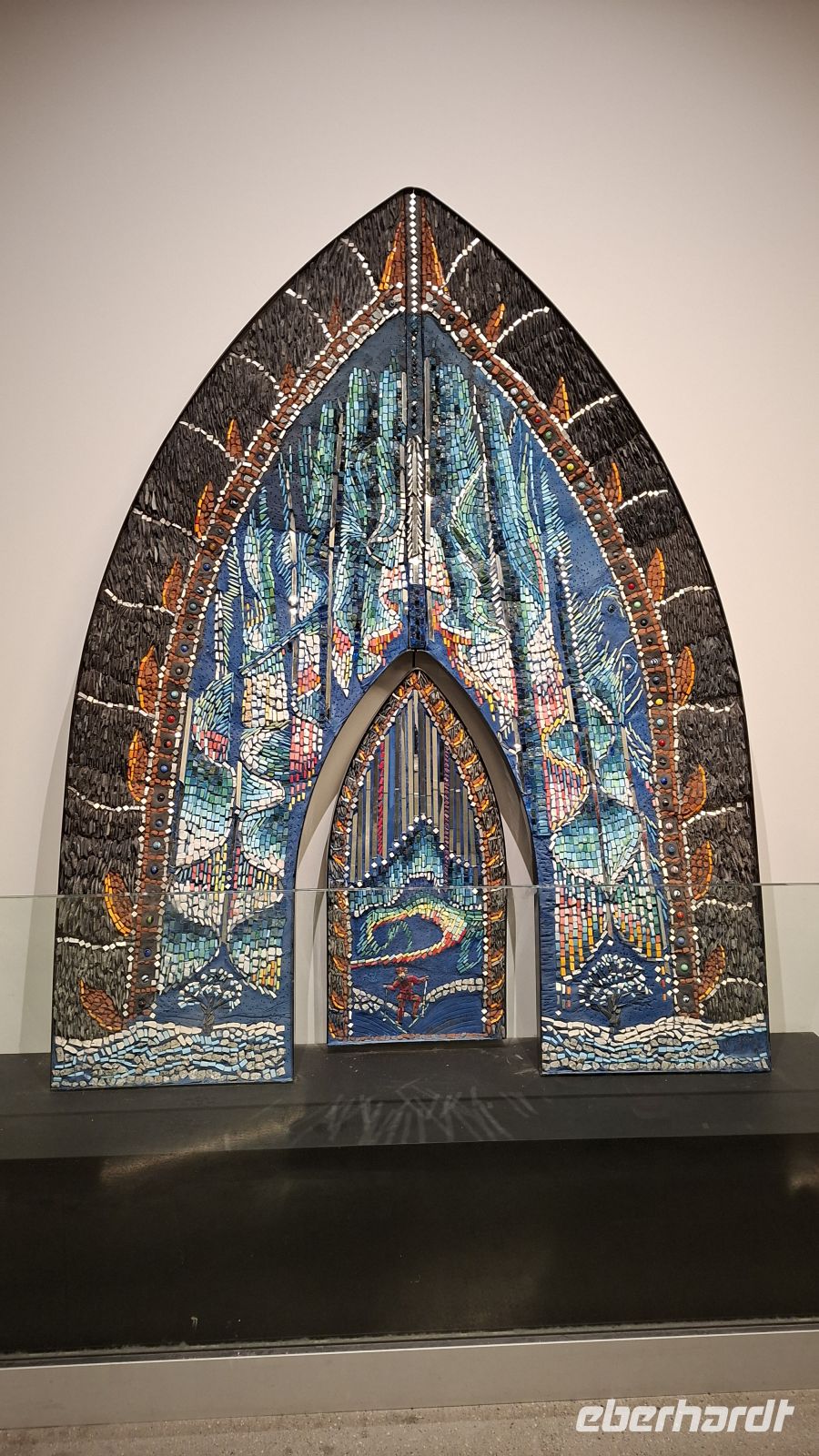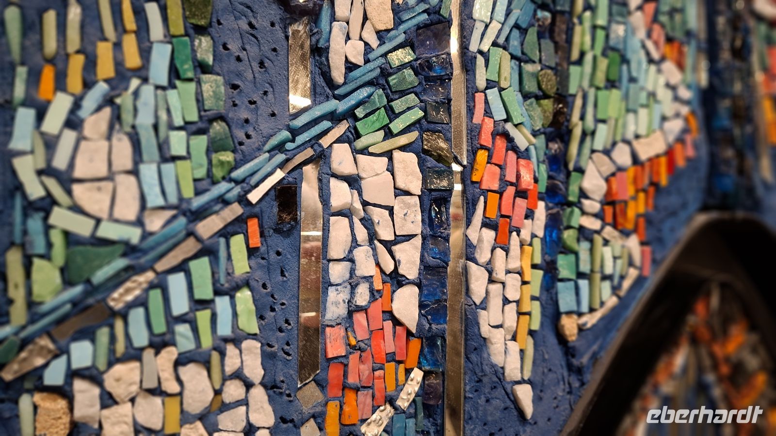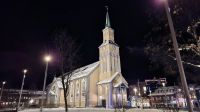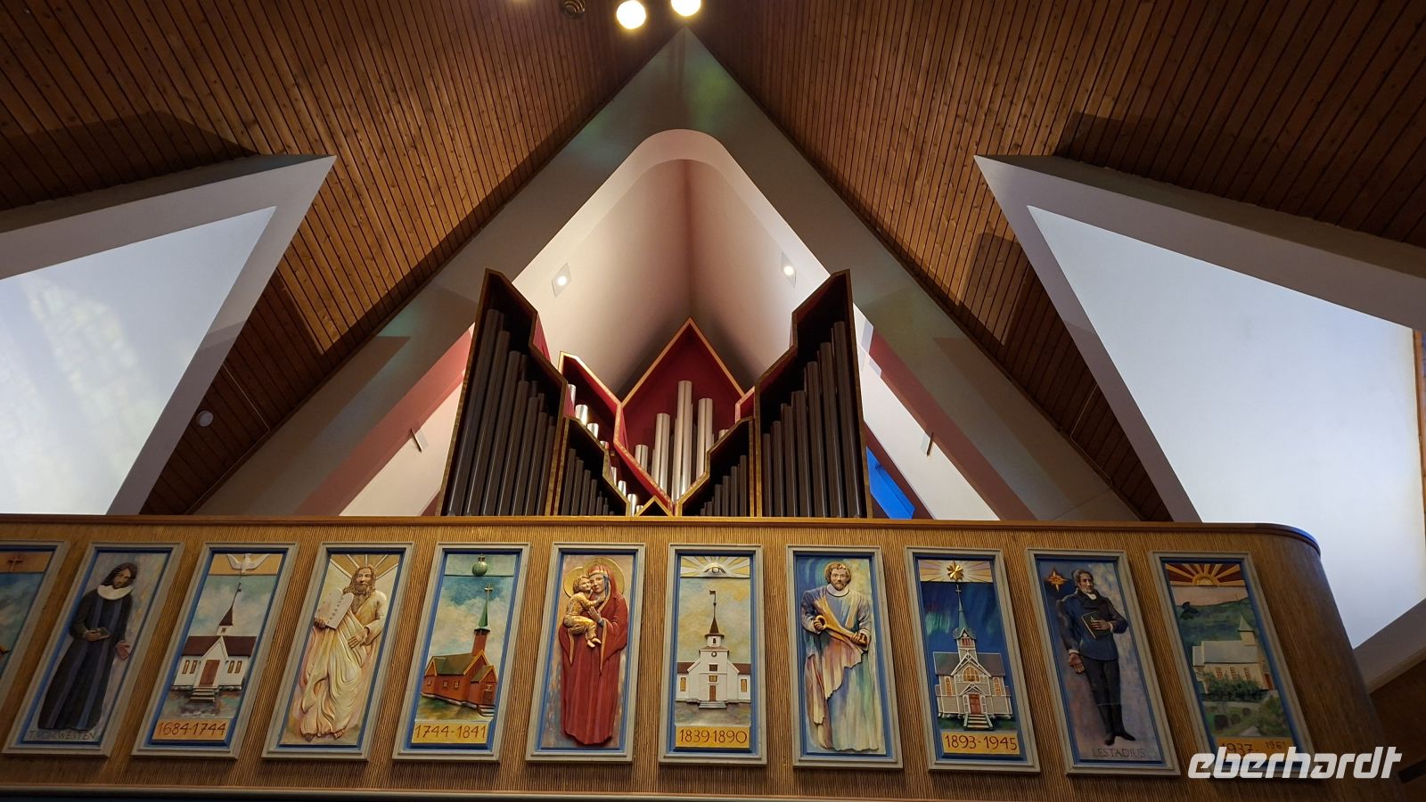 Sie stand leicht erhöht auf einem Hügel, sodass sie wie ein leuchtendes Symbol über dem Stadtteil wachte. Wir erfuhren, dass der Architekt Jan Inge Hovig mit der Form an die arktische Natur erinnern wollte – an Eis, Berge und vielleicht auch an die Insel Håja vor der Küste. Von außen wirkte sie wie ein leuchtender Eisberg in der Winterlandschaft. Besonders beeindruckend fanden wir die riesige Glasfront, hinter der sich im Inneren ein großes Glasmosaik befand, das „Die Wiederkehr Christi“ darstellen sollte.