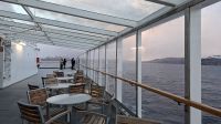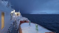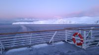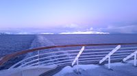 Am Abend kamen wir noch einmal zu einem gemeinsamen Abendessen zusammen. Während wir aßen und plauderten, merkten wir, dass der Seegang wieder etwas lebhafter wurde. Das Schiff begann sanft zu schaukeln, später dann doch etwas kräftiger. In der Lounge liefen die Reisefilme der letzten elf Tage in Endlosschleife – und wir freuten uns an all den Momenten, die auf der Leinwand noch einmal an uns vorbeizogen: Nordlichter, Schnee, Hunde, Fjorde, Gläser zum Anstoßen und ganz viele lachende Gesichter.